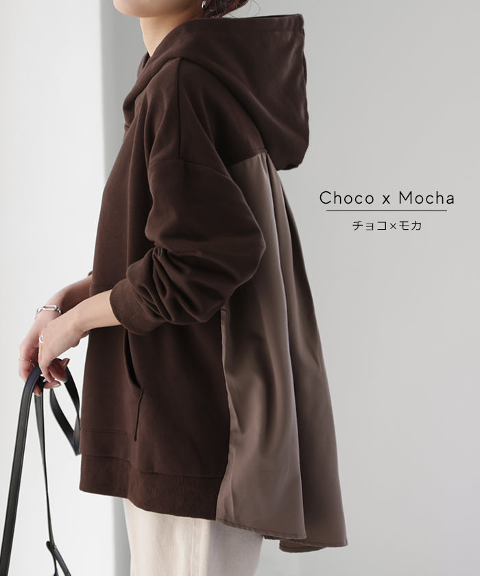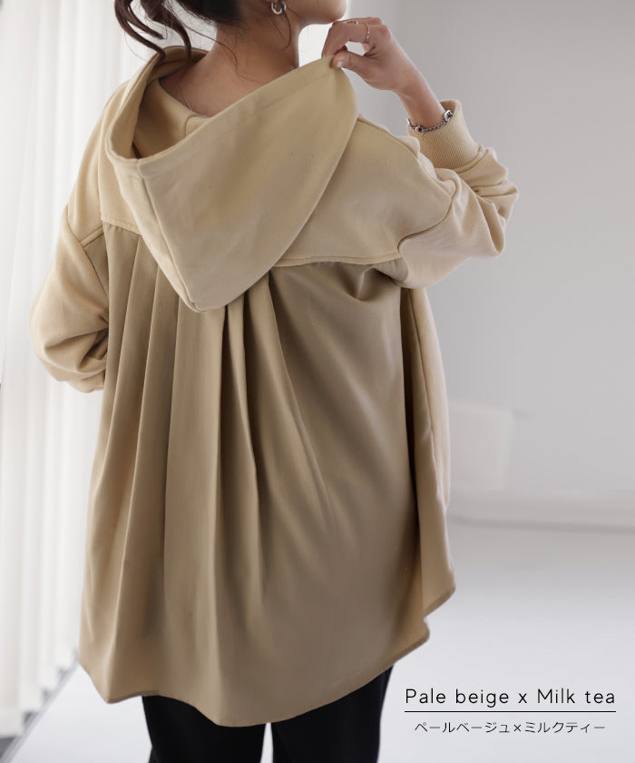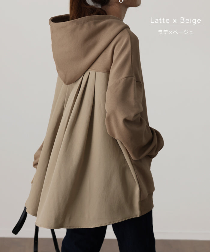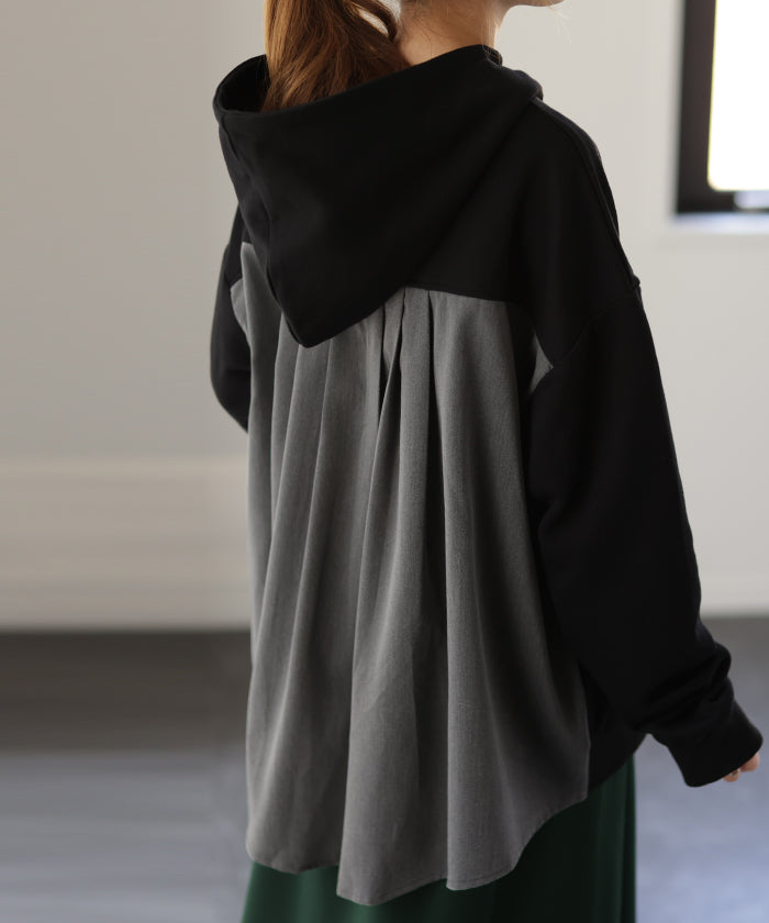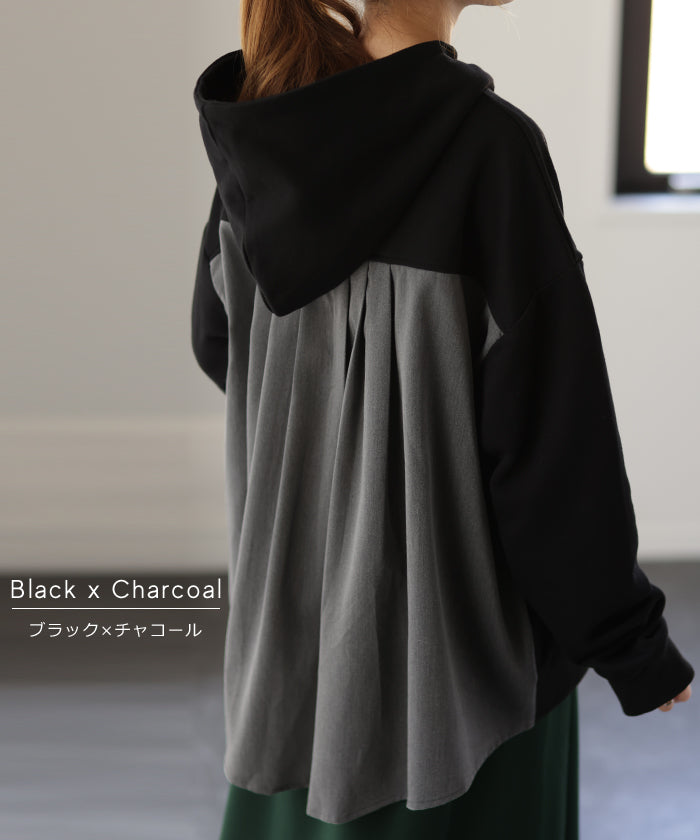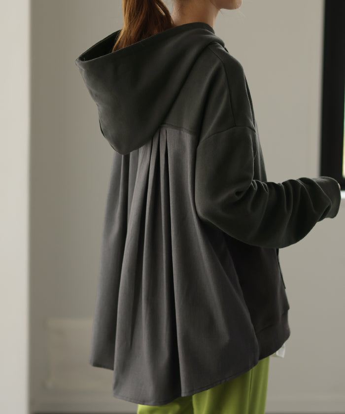 背中の切替が特徴的なバックシャンパーカー。背中部分は配色バイカラーの切替だけでなくタックが入る事で動いても素敵に映えてくれます。小顔効果・体型カバー効果もある優秀パーカーです。