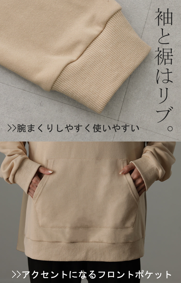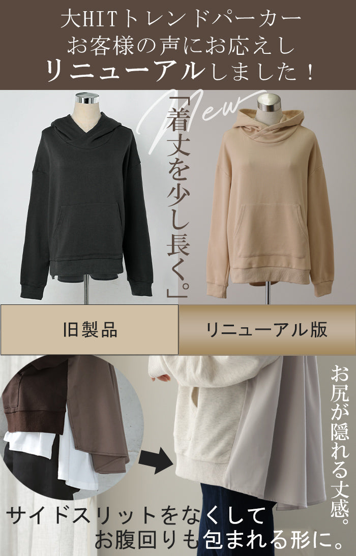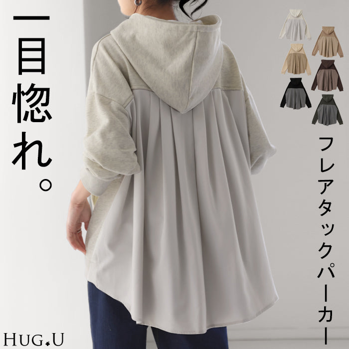 後ろ姿で魅せる「フリルより甘すぎないフレアタック 」パーカー レディース トップス フーディー 長袖 プルオーバー ロング トレーナー スウェット 切替 お尻が隠れる 無地 シンプル 配色 大きいサイズ 春 夏 HUG.U