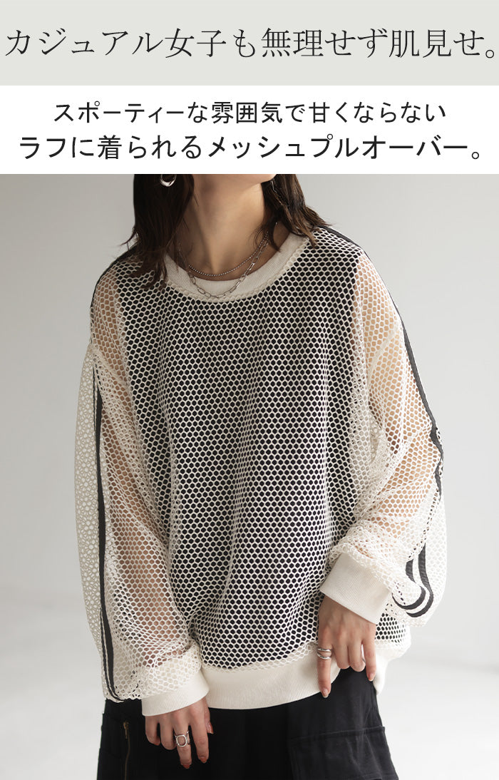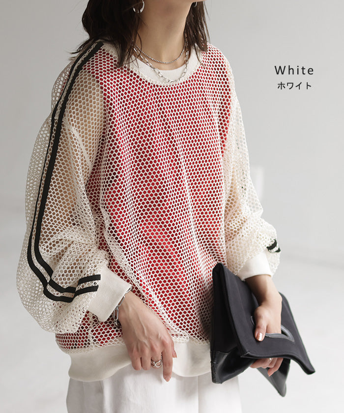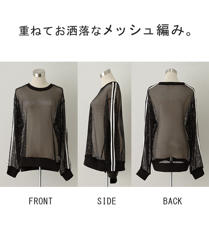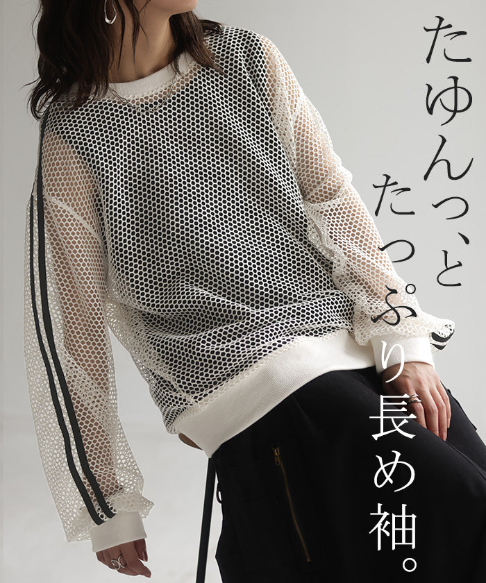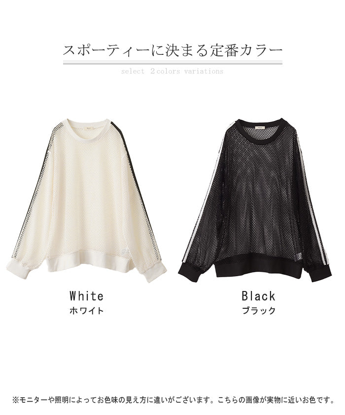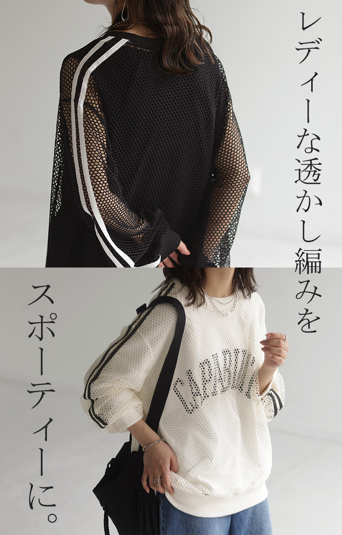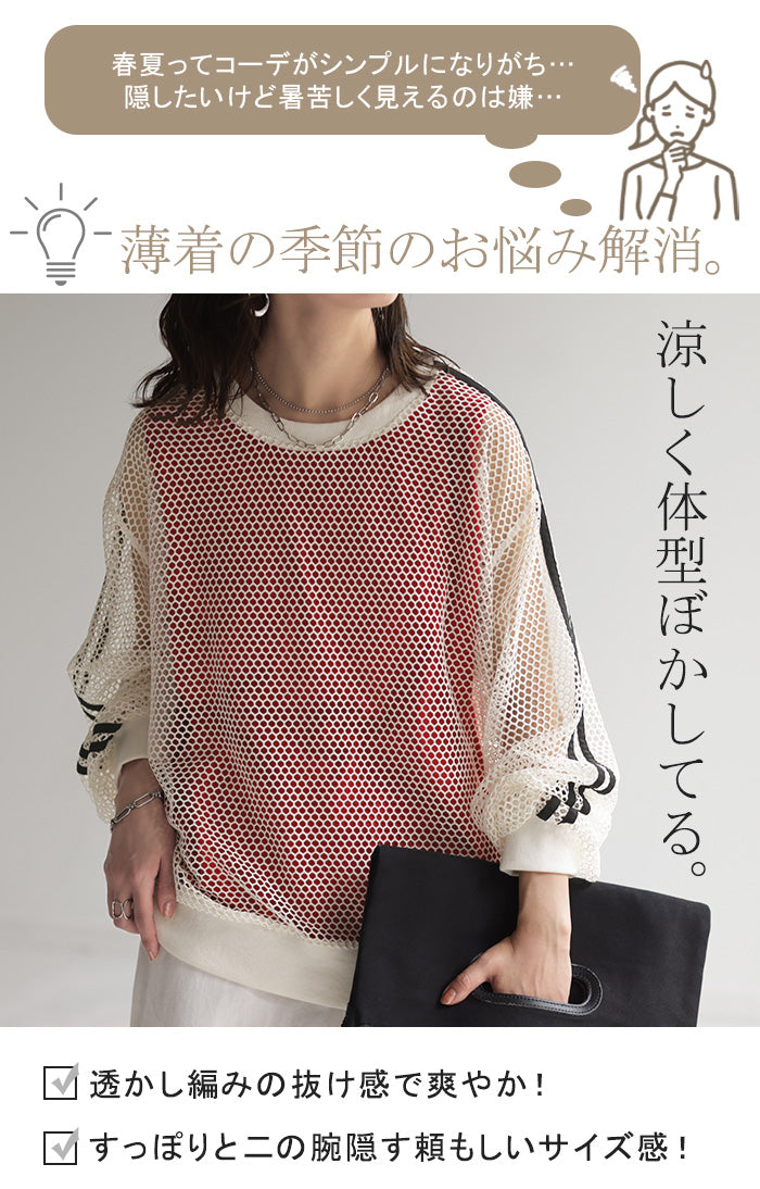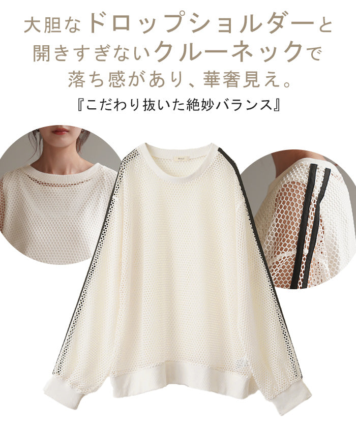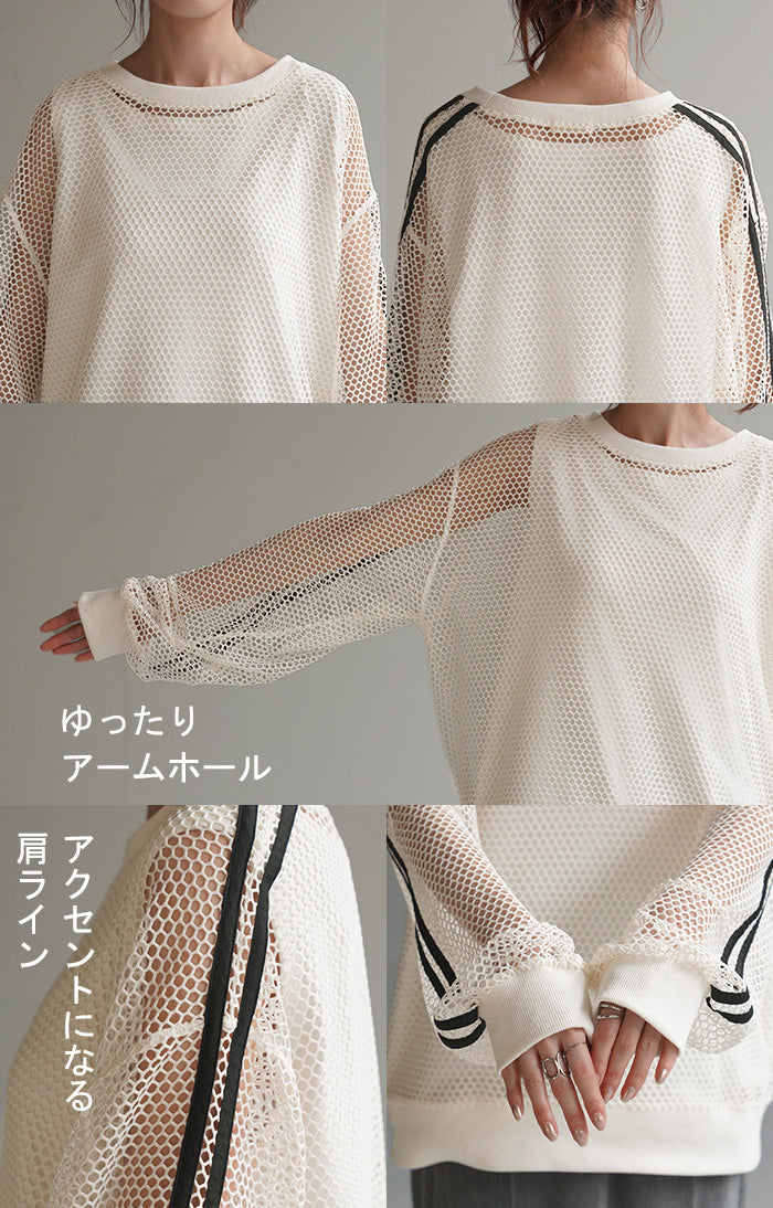 メッシュ スポーティー トップス レディース レイヤード プルオーバー メッシュトップス スポーツ 透かし編み ドロップショルダー 重ね着 サマーニット 長袖 無地 Uネック ボートネック メッシュ編み リブ 体型カバー 大きいサイズ 白 黒 春 夏 HUG.U