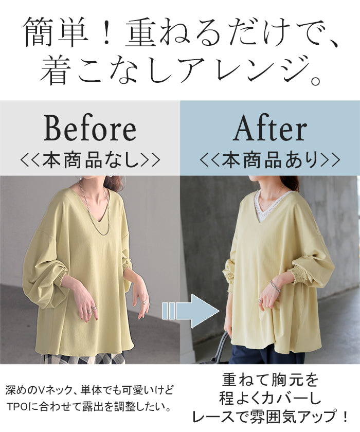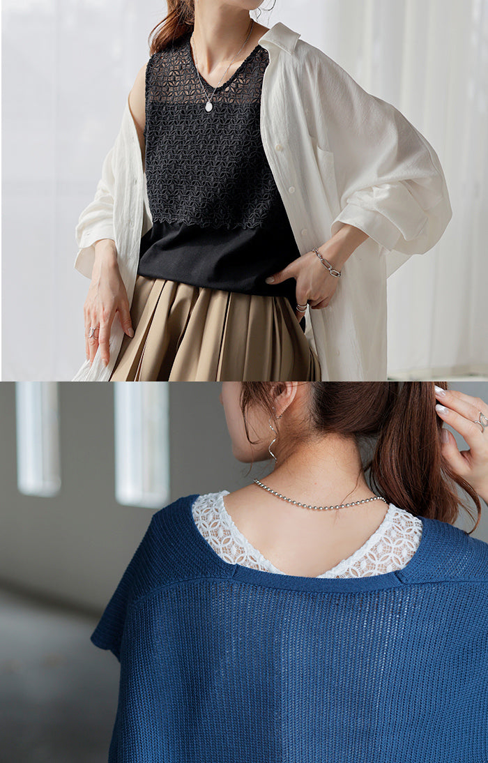 このたびはレビューをご投稿いただき、誠にありがとうございます。 レイヤードについてお悩みの中で、襟ぐりの開きやレース幅、丸首・Vネックの2パターンが合わせやすかったとのこと、大変嬉しく拝見いたしました。 HUG.Uのニットはもちろん、お手持ちのニットにも取り入れていただけたとのお声は、今後の商品づくりの励みになります。 ぜひさまざまなコーディネートでお楽しみいただけましたら幸いです。 貴重なご感想をありがとうございました。