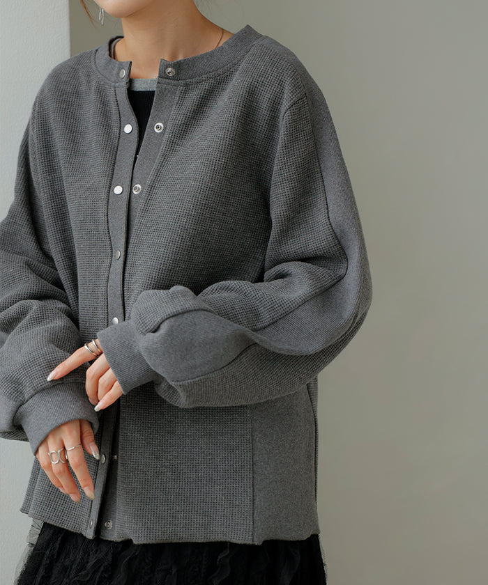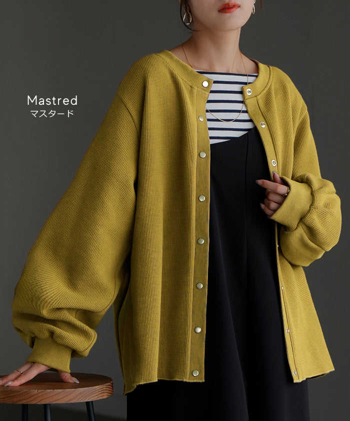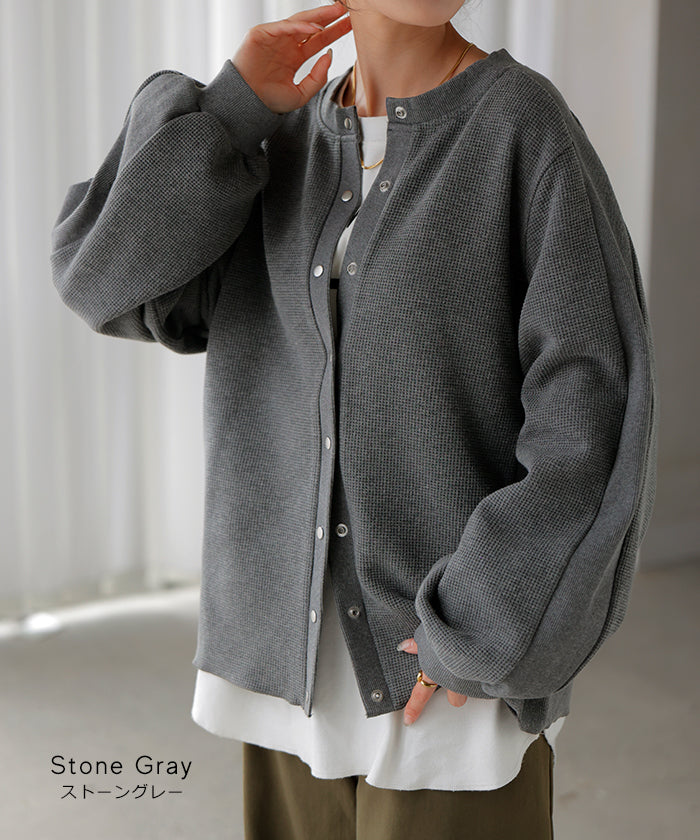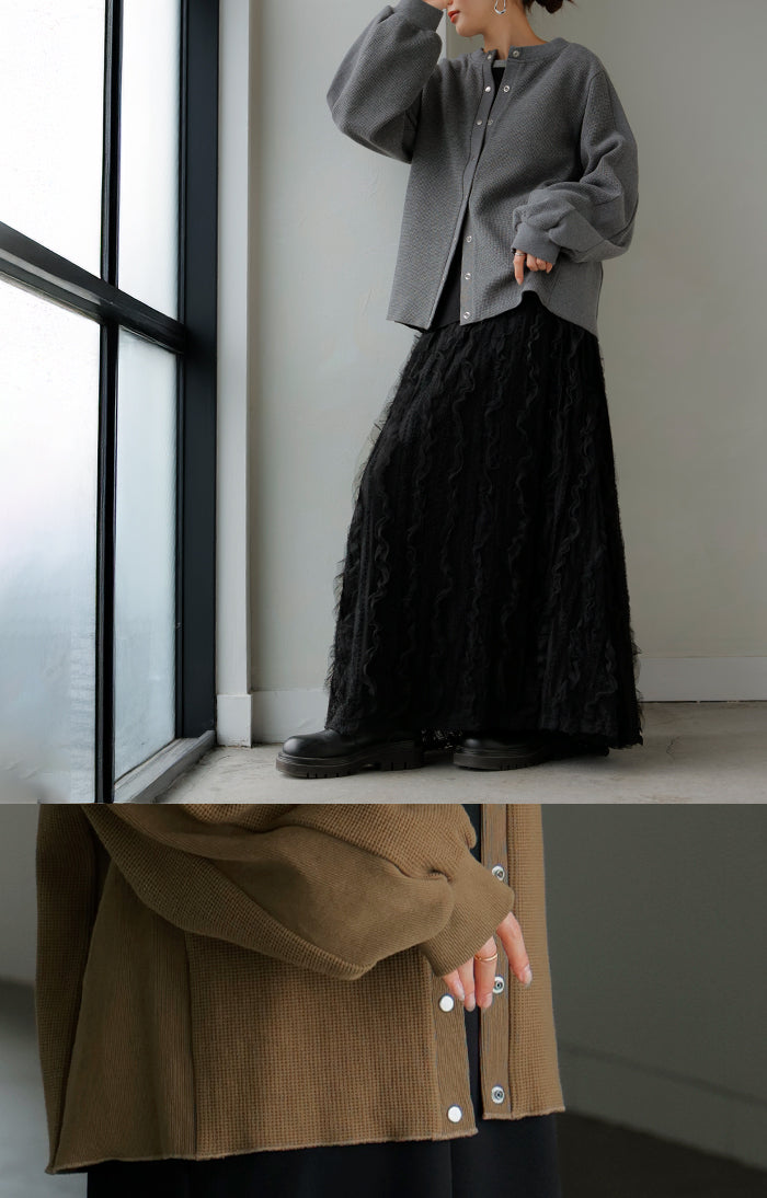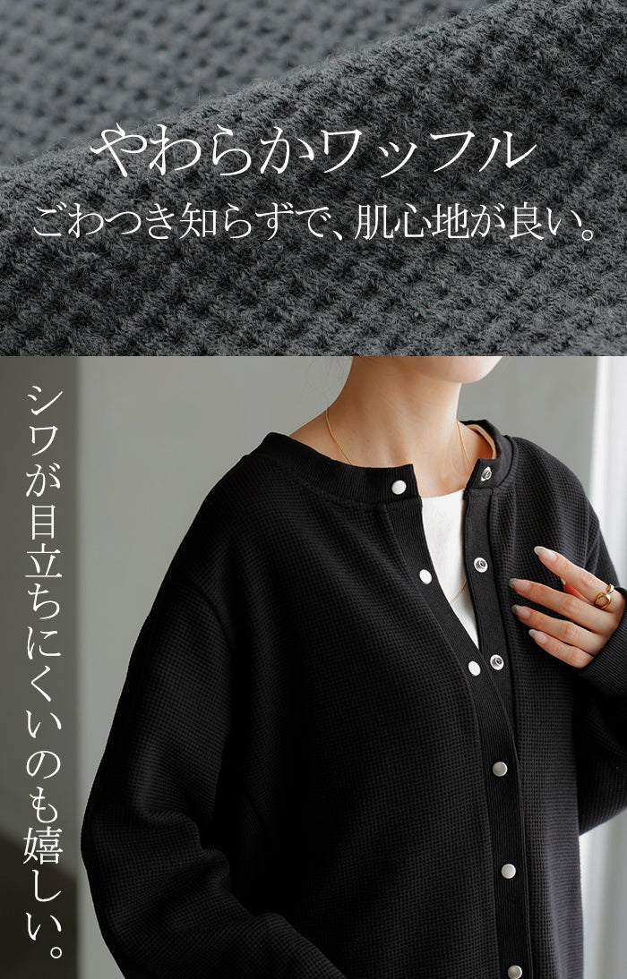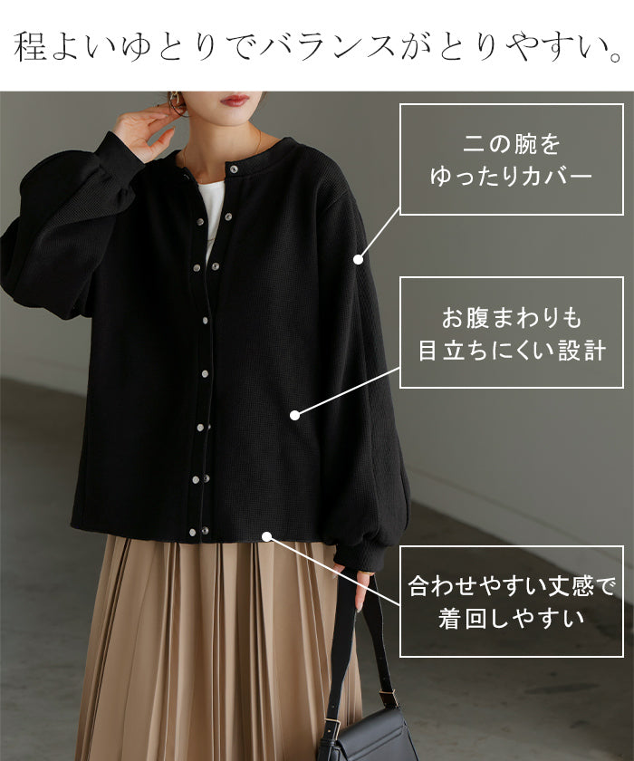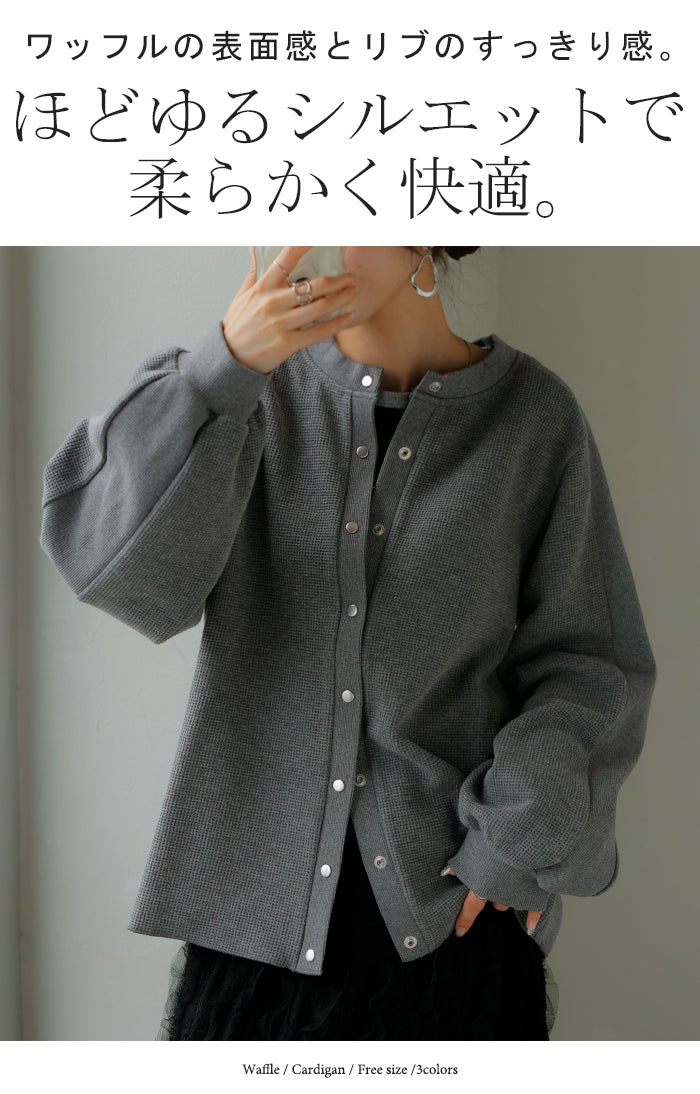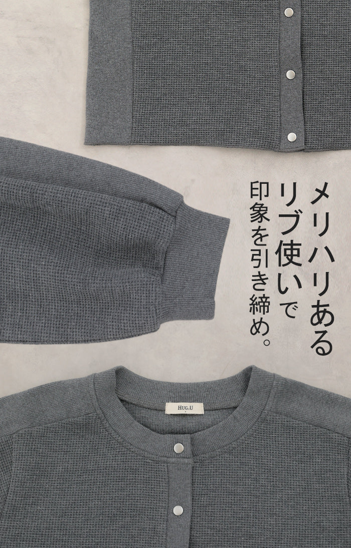 2025AW新作 カーディガン ワッフル ■一部11月下旬入荷 アウター トップス レディース 二の腕カバー 無地 長袖 ロング パフスリーブ レイヤード 重ね着 羽織 リブ ワッフル生地 クルーネック ゆったり 体型カバー 大きいサイズ カジュアル 黒 グレー 秋 冬 HUG.U