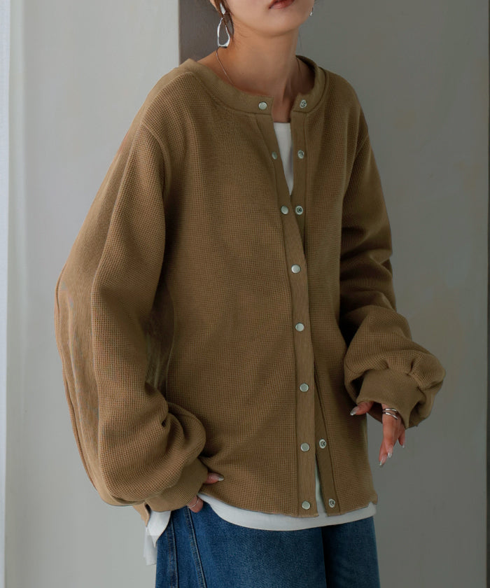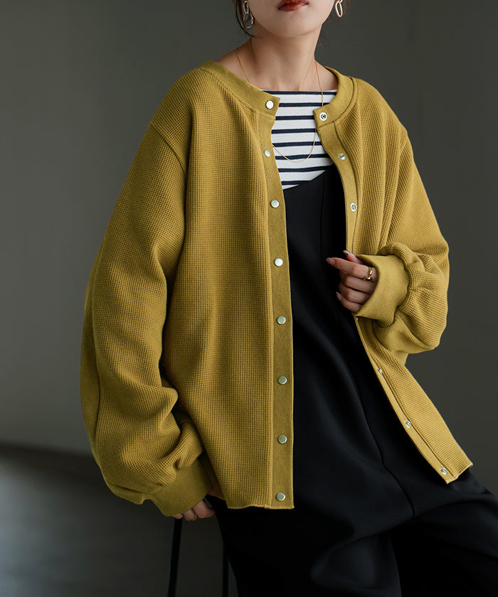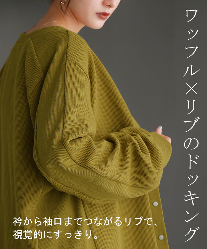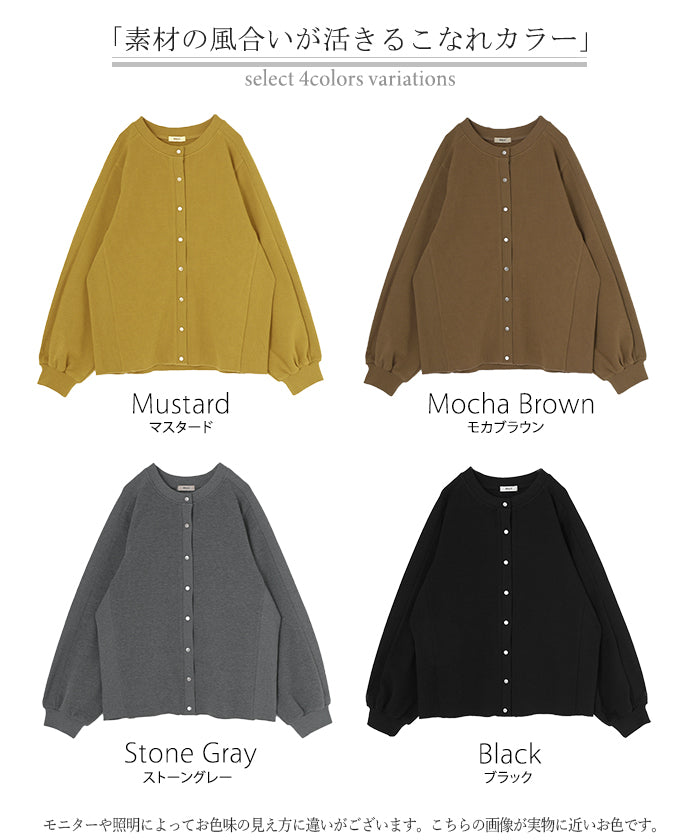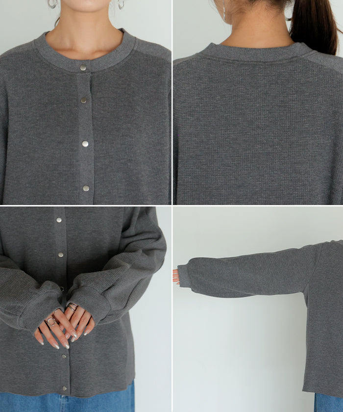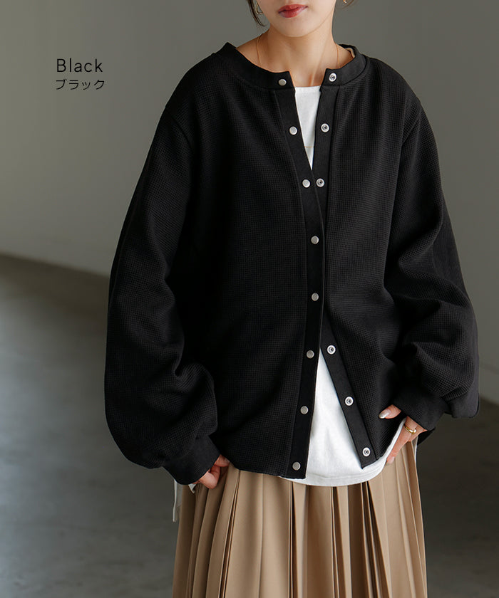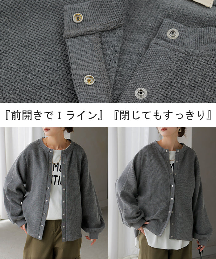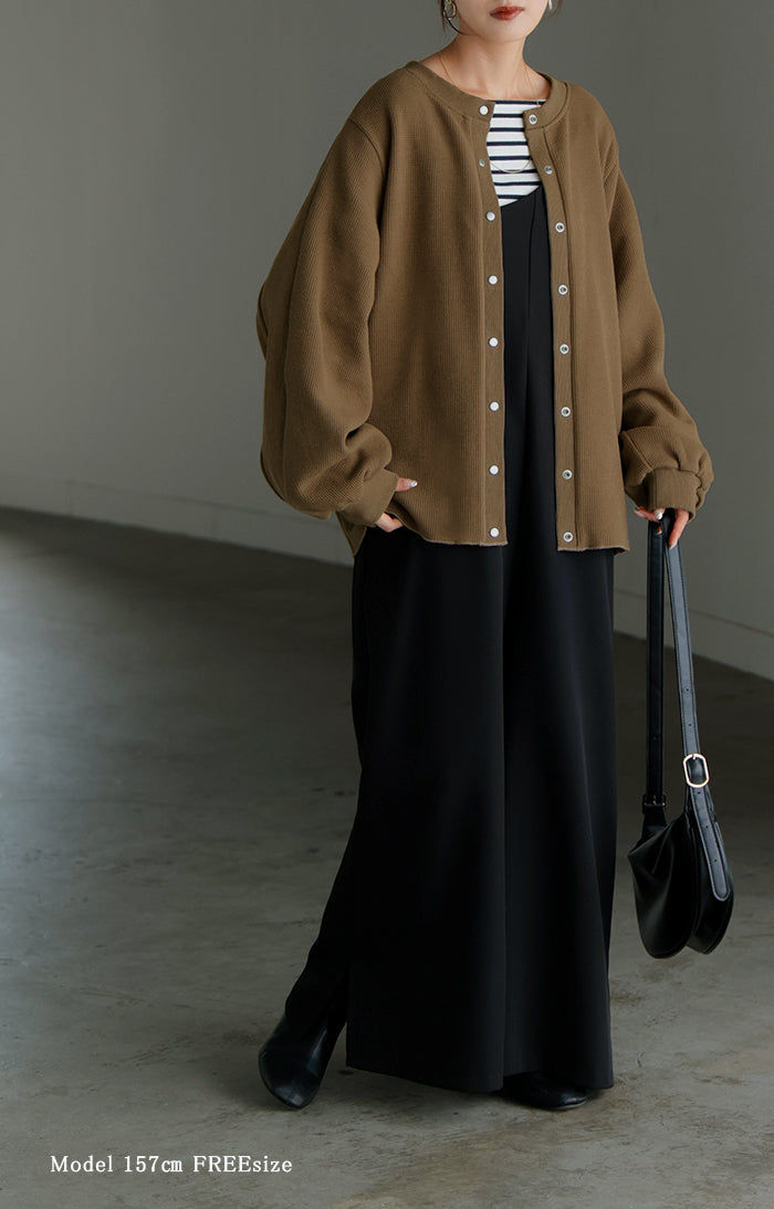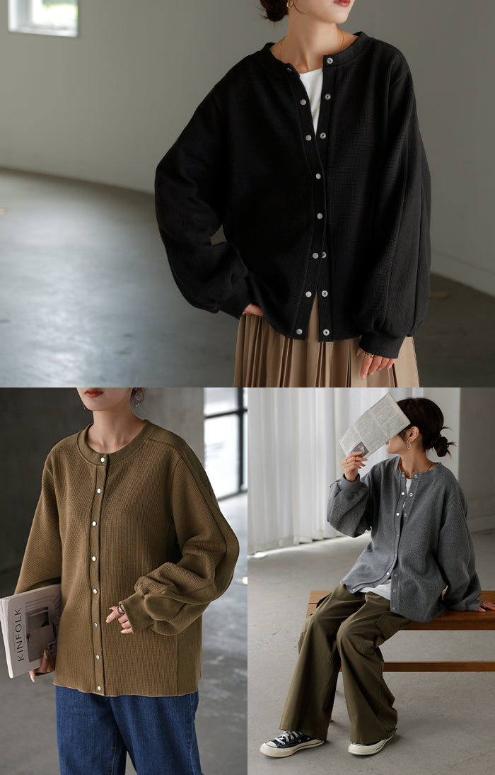 2025AW新作 カーディガン ワッフル ■一部11月下旬入荷 アウター トップス レディース 二の腕カバー 無地 長袖 ロング パフスリーブ レイヤード 重ね着 羽織 リブ ワッフル生地 クルーネック ゆったり 体型カバー 大きいサイズ カジュアル 黒 グレー 秋 冬 HUG.U