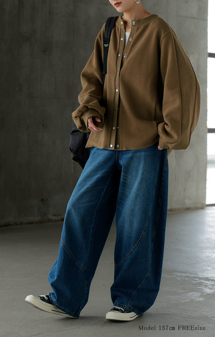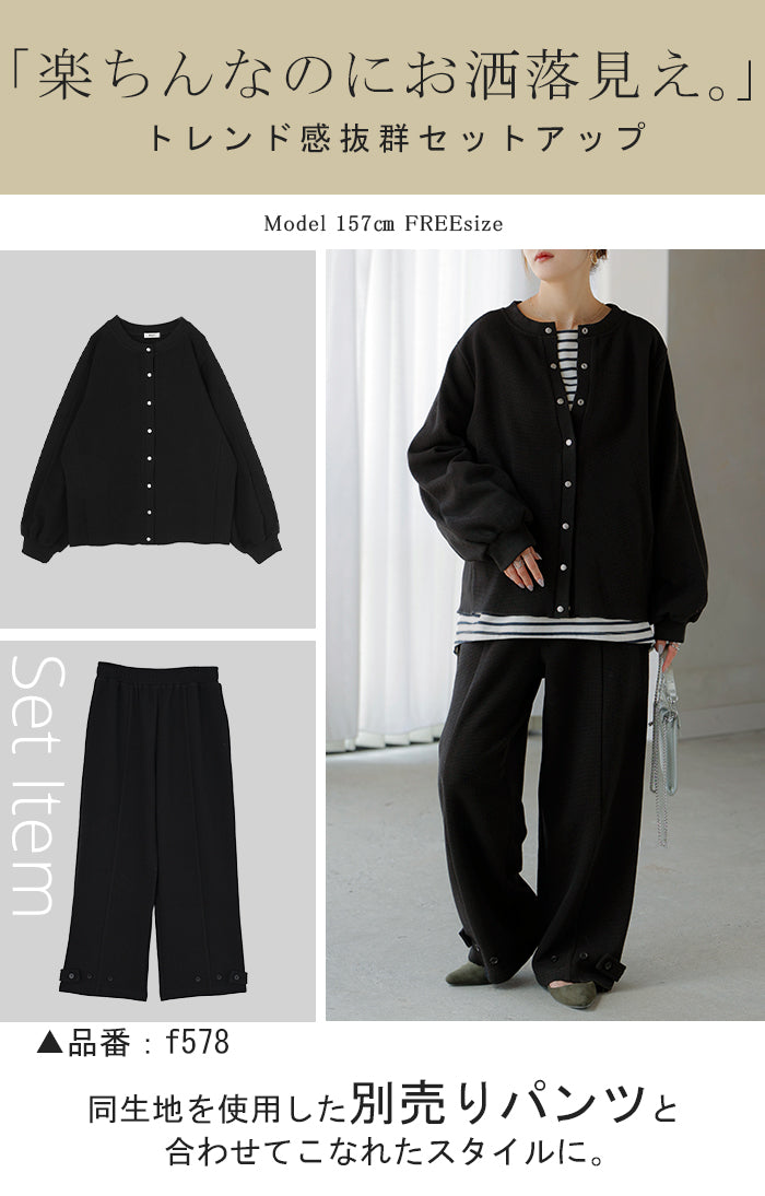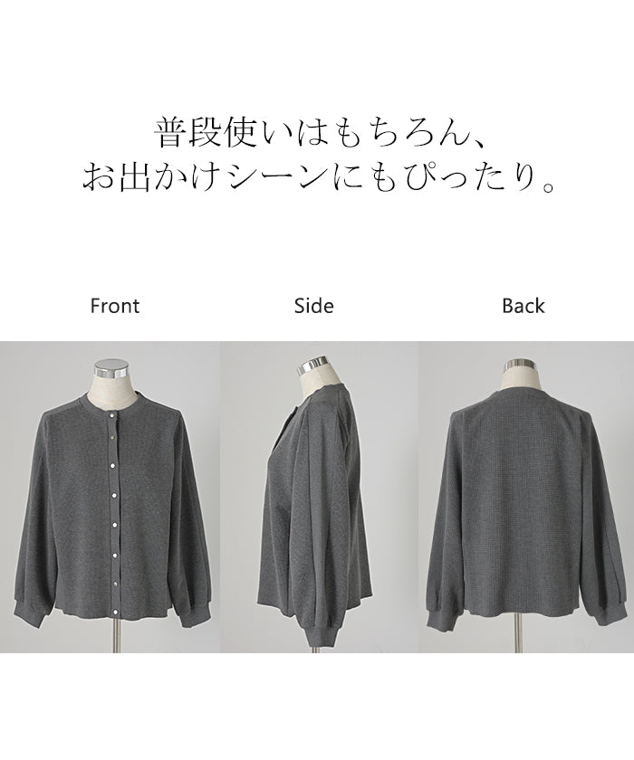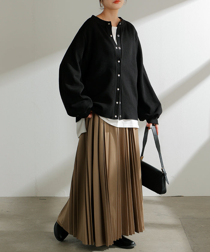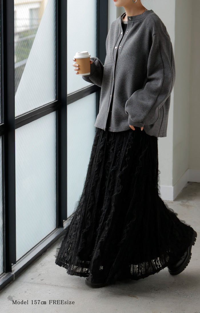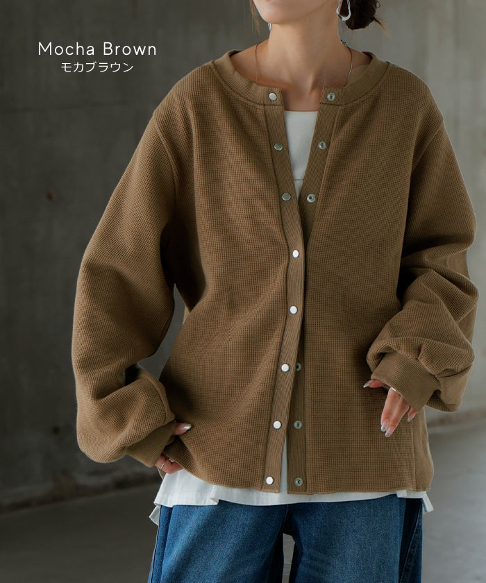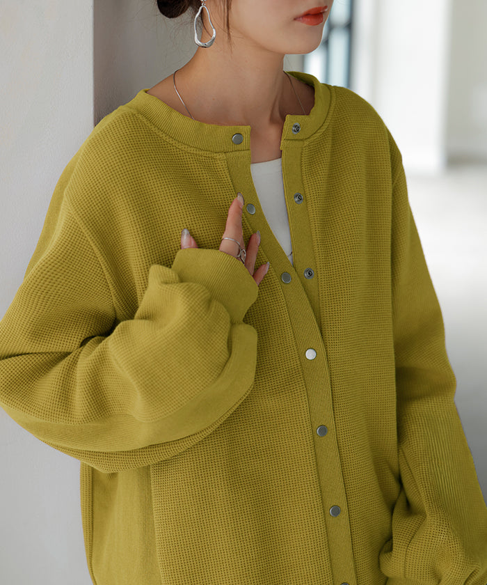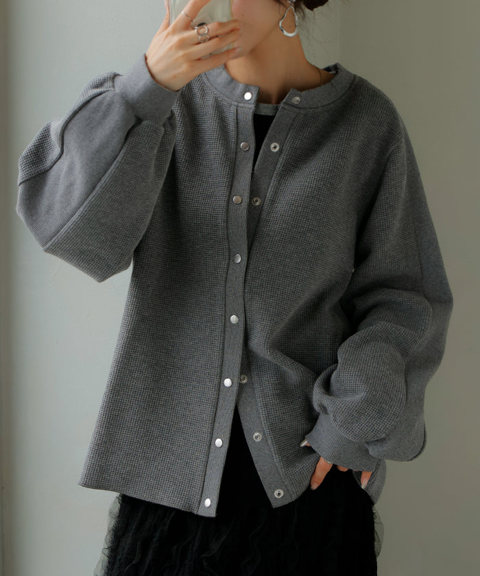 2025AW新作 カーディガン ワッフル ■一部11月下旬入荷 アウター トップス レディース 二の腕カバー 無地 長袖 ロング パフスリーブ レイヤード 重ね着 羽織 リブ ワッフル生地 クルーネック ゆったり 体型カバー 大きいサイズ カジュアル 黒 グレー 秋 冬 HUG.U