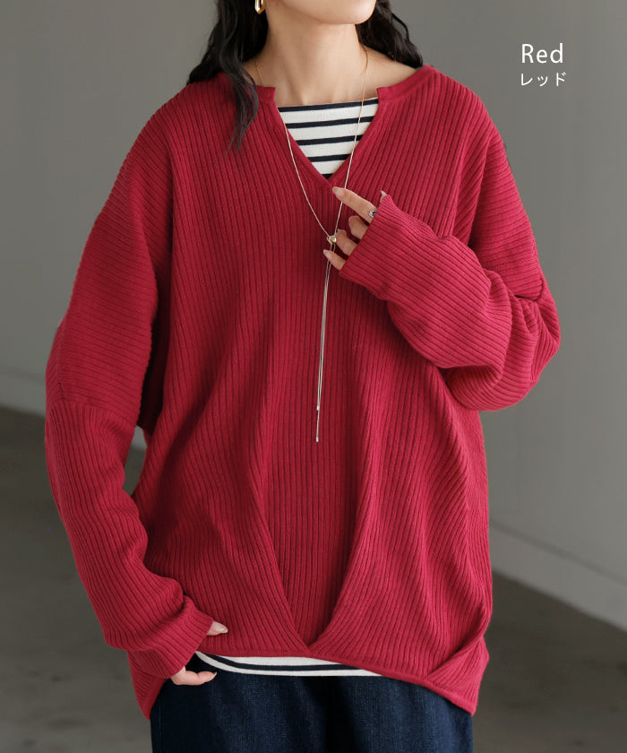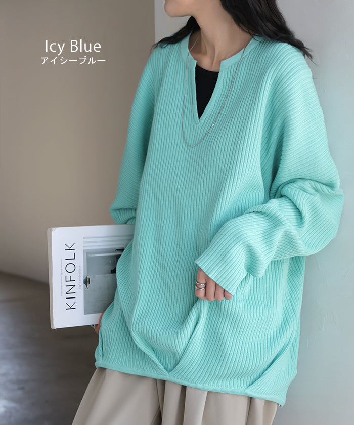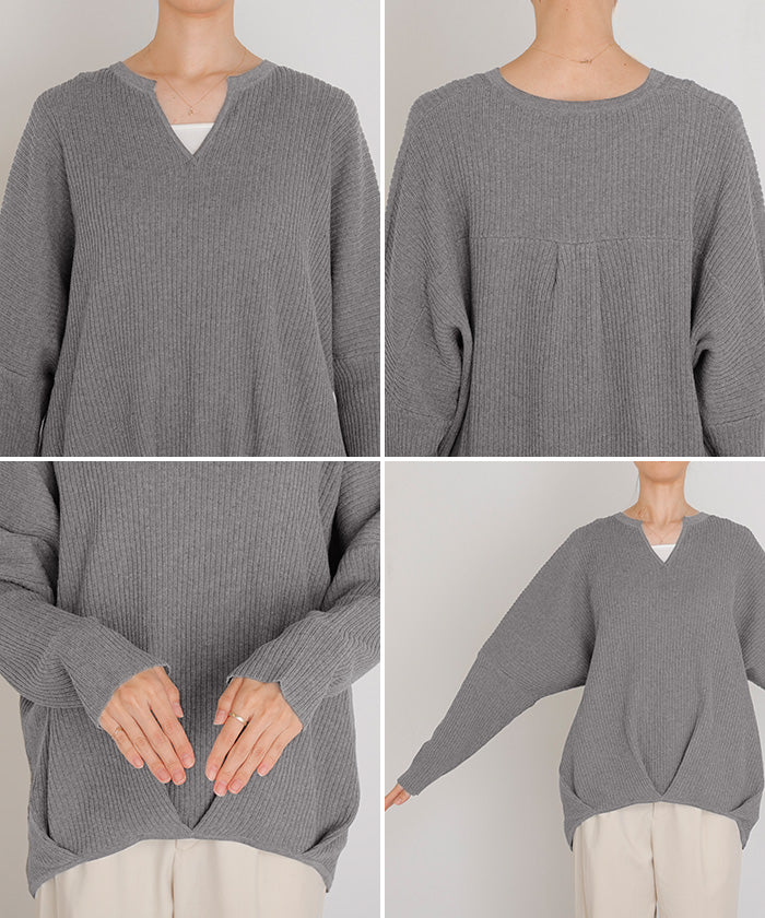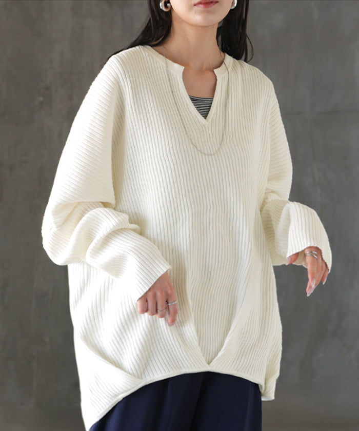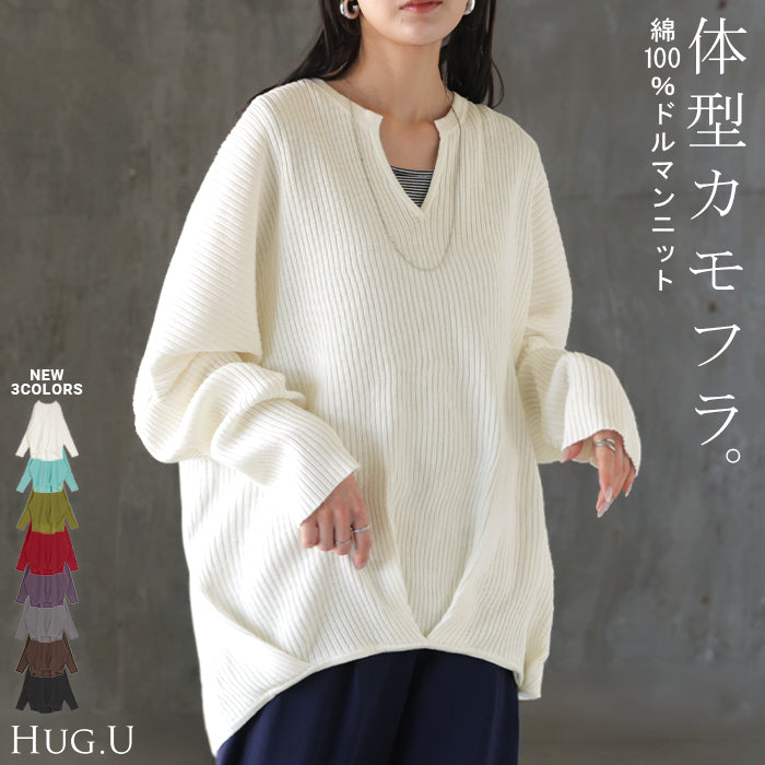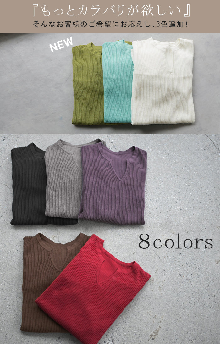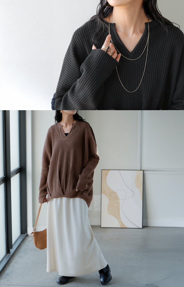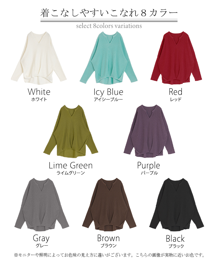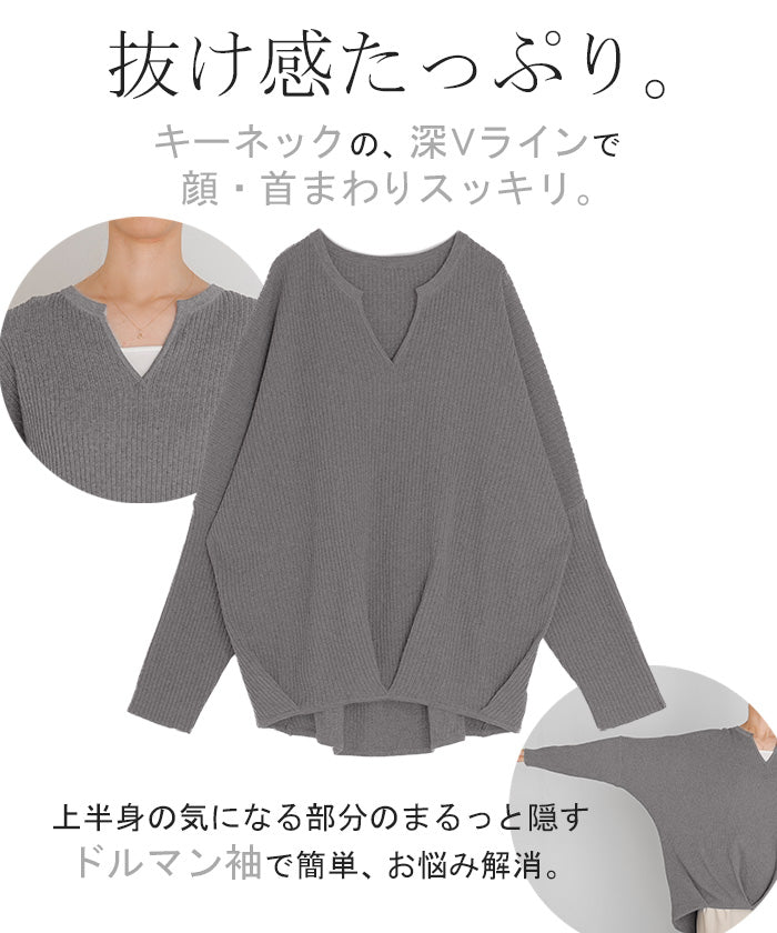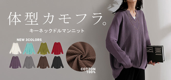 コットン100%のニットです。 キーネックは抜け感があり、上品に感じます。中にTシャツや薄手のハイネックなど重ねても着られます。 前見頃はお腹を隠して、後ろはお尻を隠してくれる丈です。後ろの方が長いデザインです。 薄手のニットですが、見た目よりかなり暖かいです。 綿100だからか、おしゃれ着用洗剤(必須!)で、洗濯機の普通コースで洗って色落ちや型崩れなどなく重宝しています(もちろん自己責任で!)。