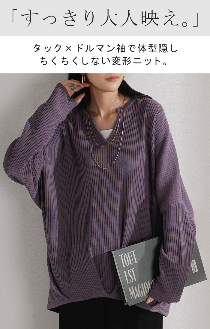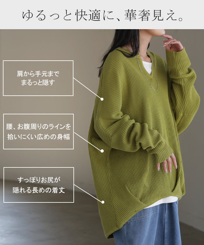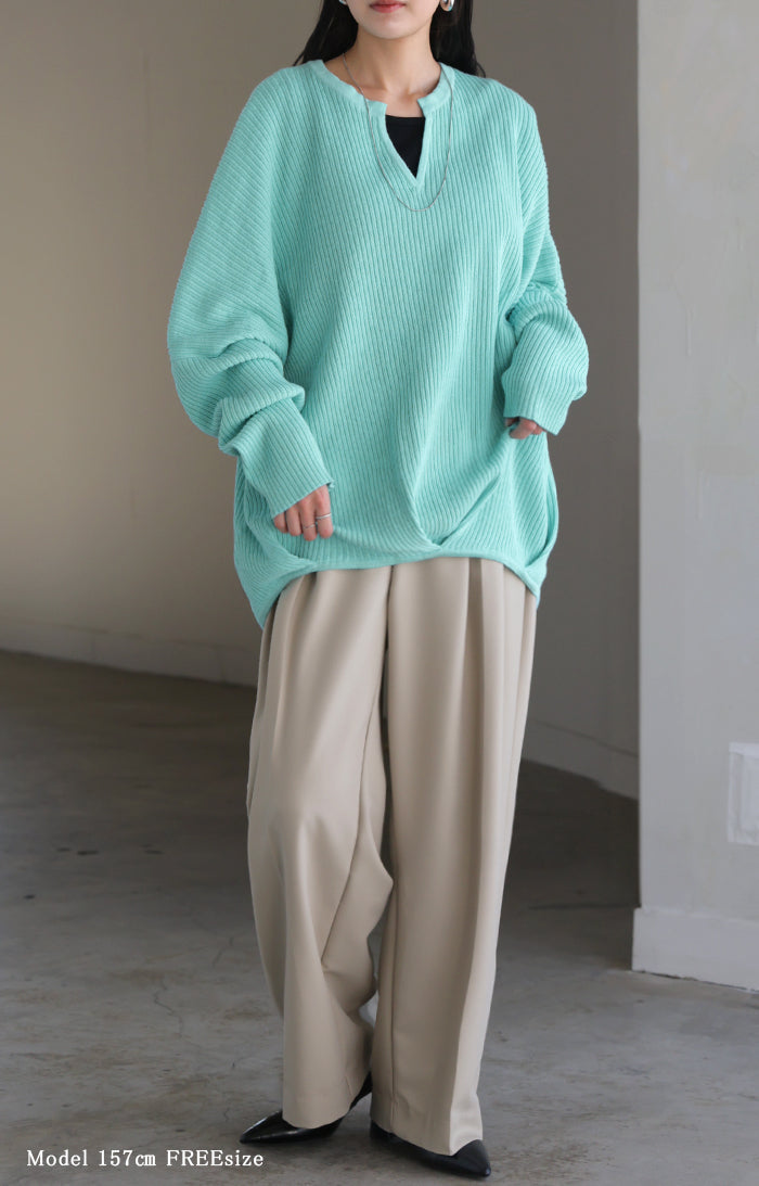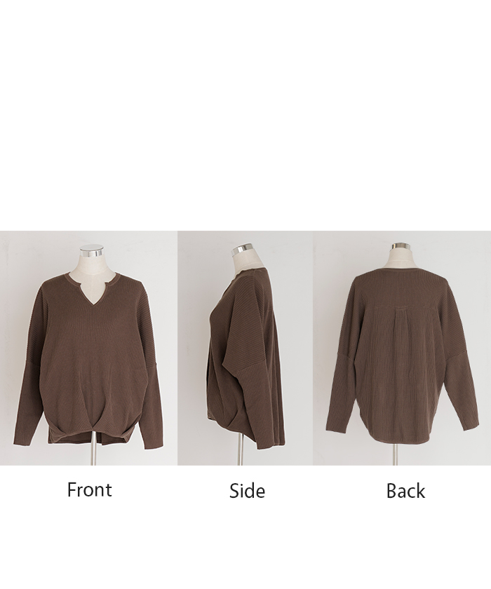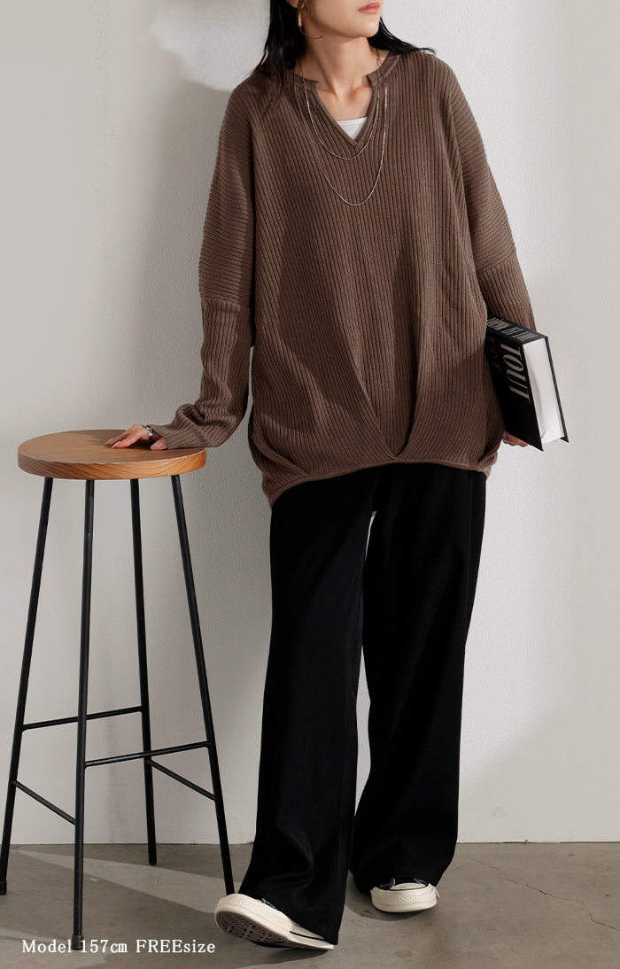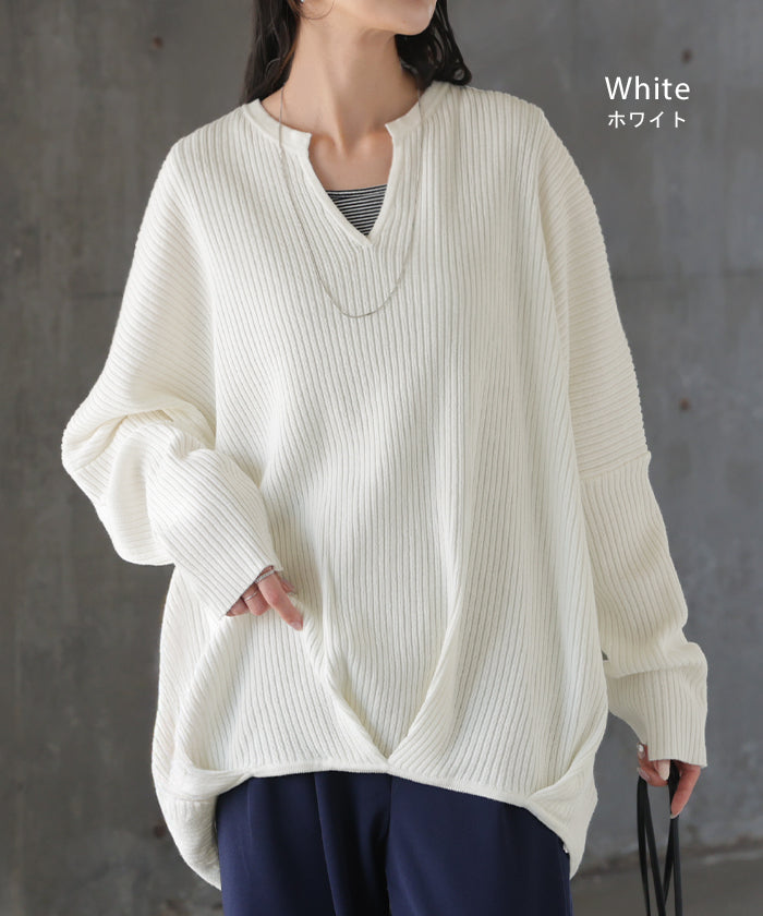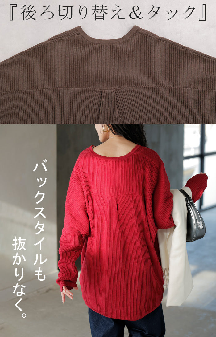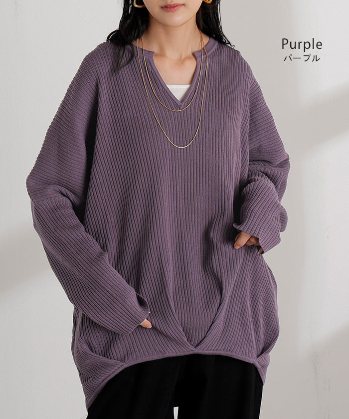 コットン100%のニットです。 キーネックは抜け感があり、上品に感じます。中にTシャツや薄手のハイネックなど重ねても着られます。 前見頃はお腹を隠して、後ろはお尻を隠してくれる丈です。後ろの方が長いデザインです。 薄手のニットですが、見た目よりかなり暖かいです。 綿100だからか、おしゃれ着用洗剤(必須!)で、洗濯機の普通コースで洗って色落ちや型崩れなどなく重宝しています(もちろん自己責任で!)。