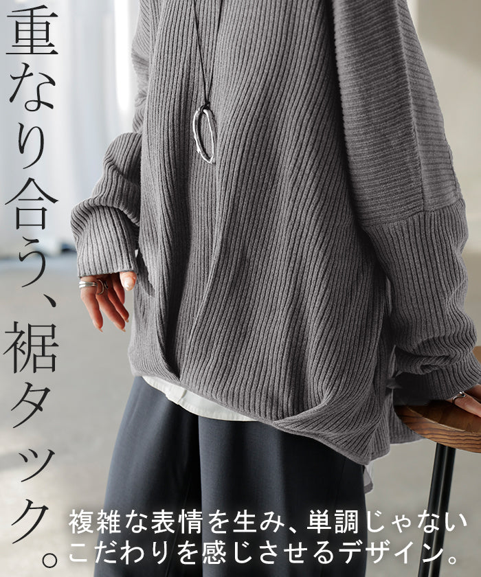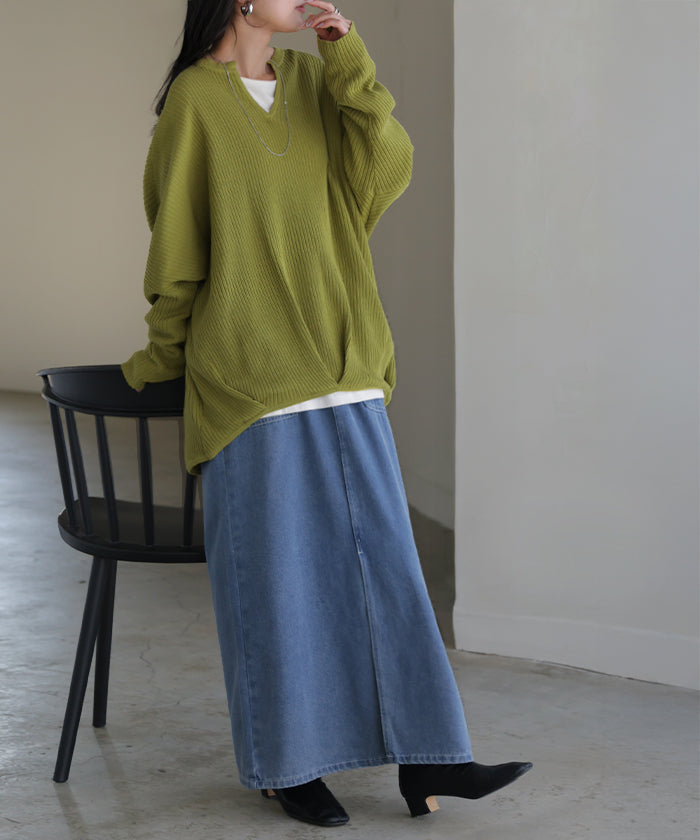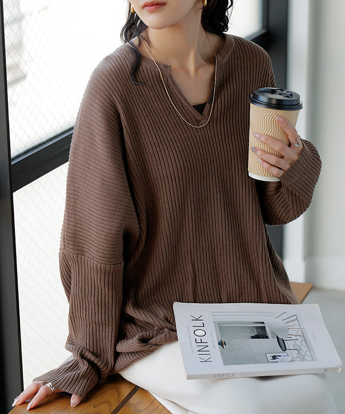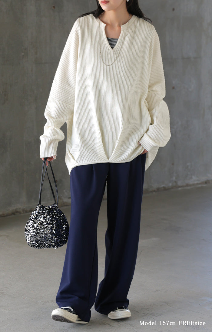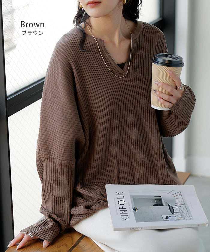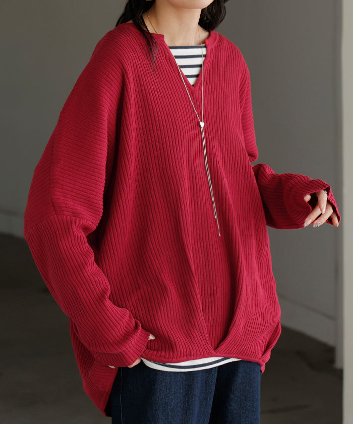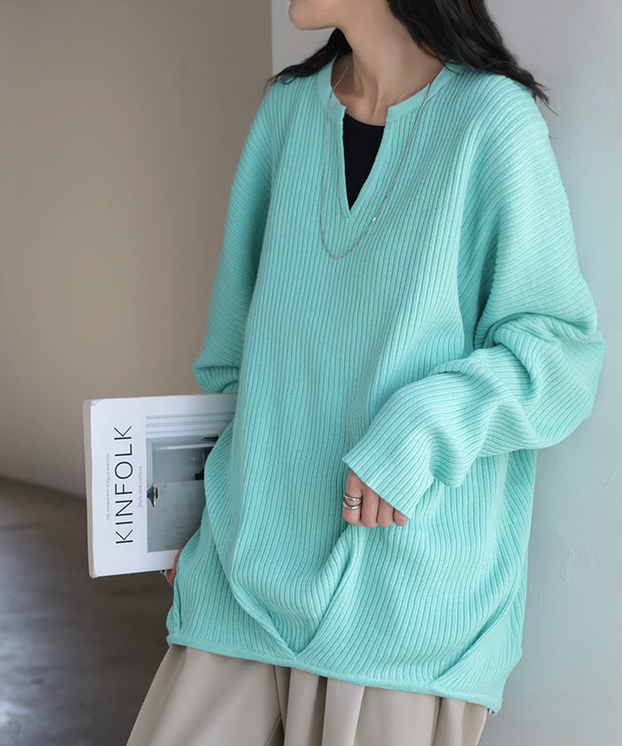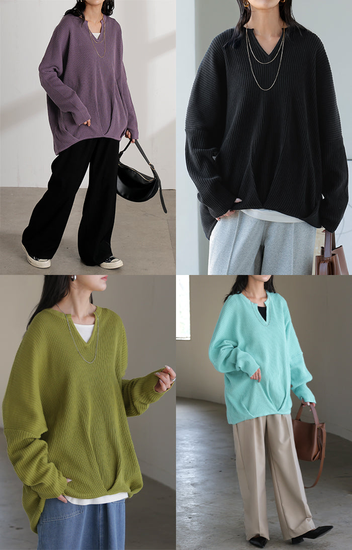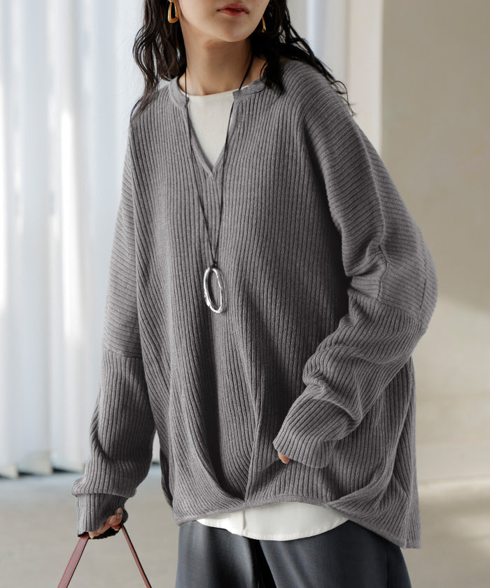 コットン100%のニットです。 キーネックは抜け感があり、上品に感じます。中にTシャツや薄手のハイネックなど重ねても着られます。 前見頃はお腹を隠して、後ろはお尻を隠してくれる丈です。後ろの方が長いデザインです。 薄手のニットですが、見た目よりかなり暖かいです。 綿100だからか、おしゃれ着用洗剤(必須!)で、洗濯機の普通コースで洗って色落ちや型崩れなどなく重宝しています(もちろん自己責任で!)。