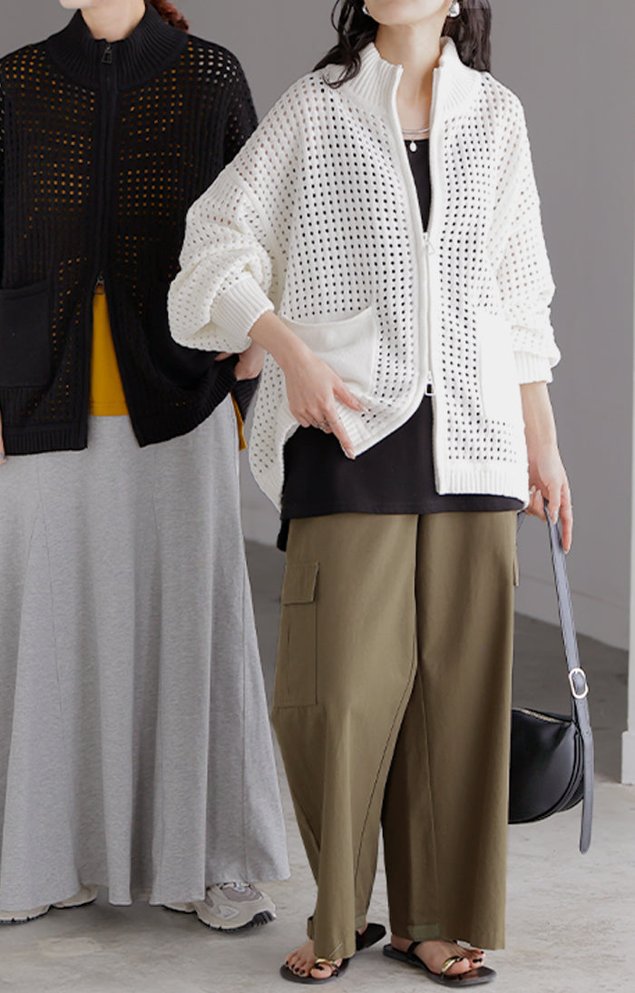 【早割10%OFF】 2026SS新作 カーディガン 綿100% ■一部3月中旬入荷 透かし編み トップス レディース サマーニット ダブルジップ 羽織り ニット コットン チクチクしない 長袖 透け感 体型カバー ゆったり 大きいサイズ 透け 着痩せ ジップアップ スタンドカラー カジュアル 春 夏 黒 白 HUG.U