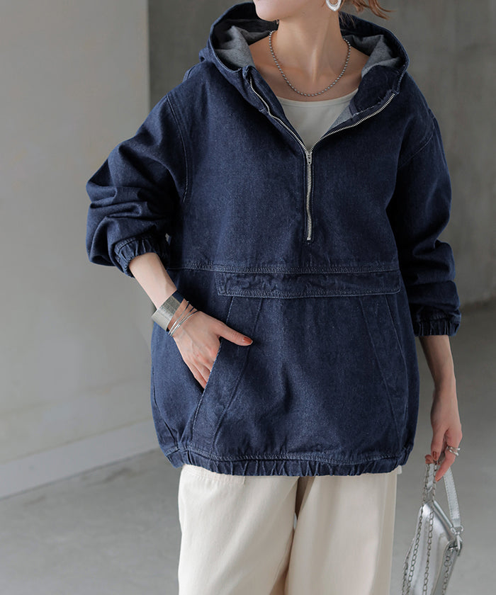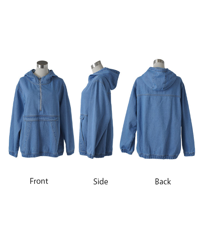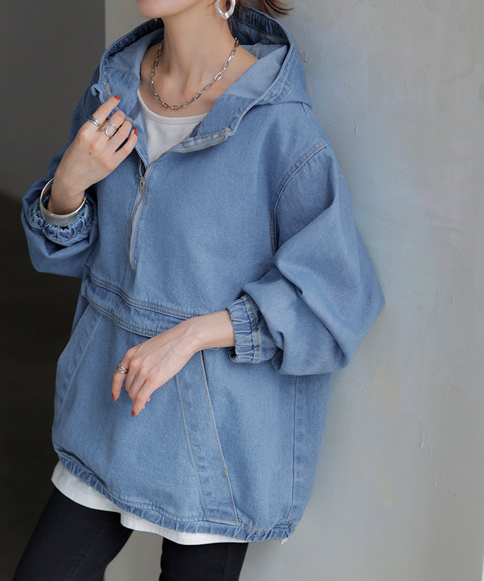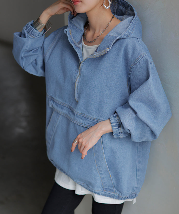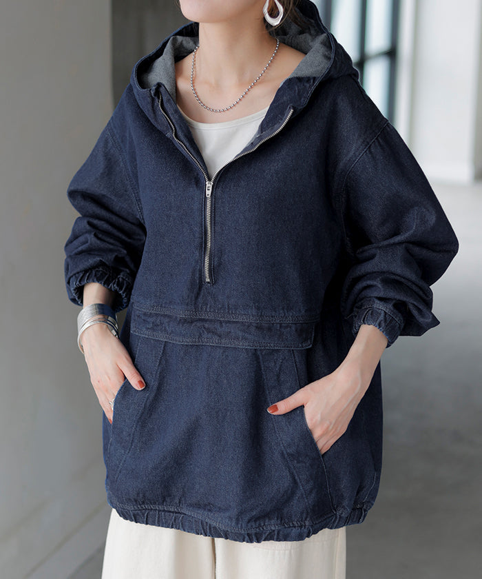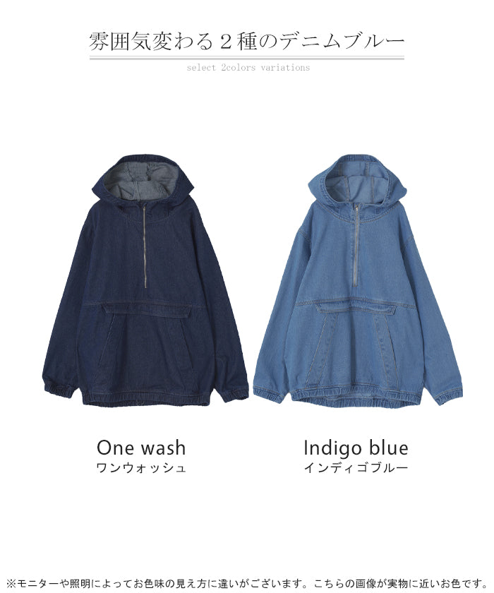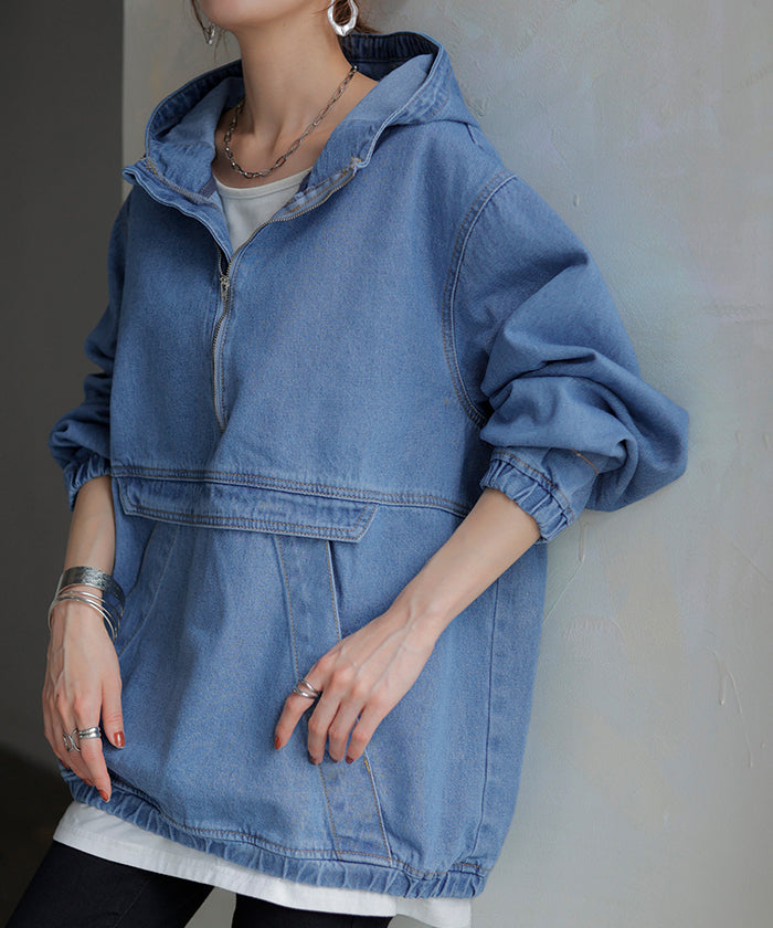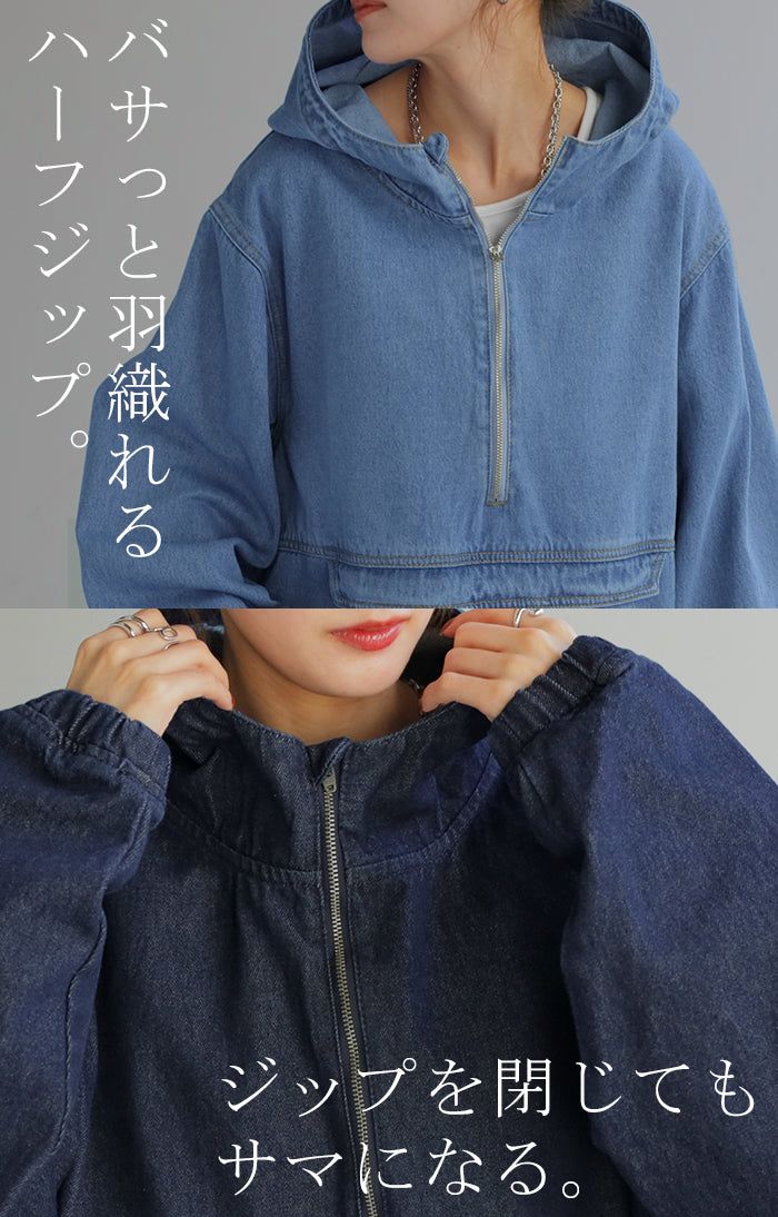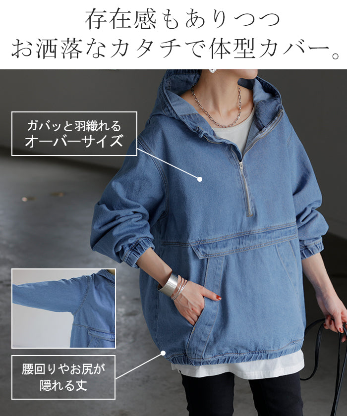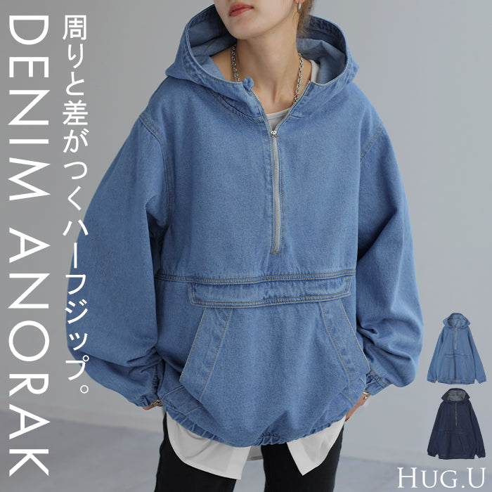 パーカー デニム ハーフジップ トップス レディース アノラック オーバーサイズ アウター アノラックパーカー ロング Gジャン デニムパーカー 羽織 お尻が隠れる フーディー ドロップショルダー ビッグ 無地 体型カバー 大きいサイズ 青 春 夏 HUG.U
