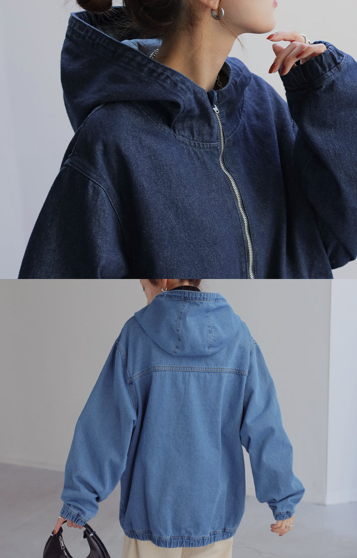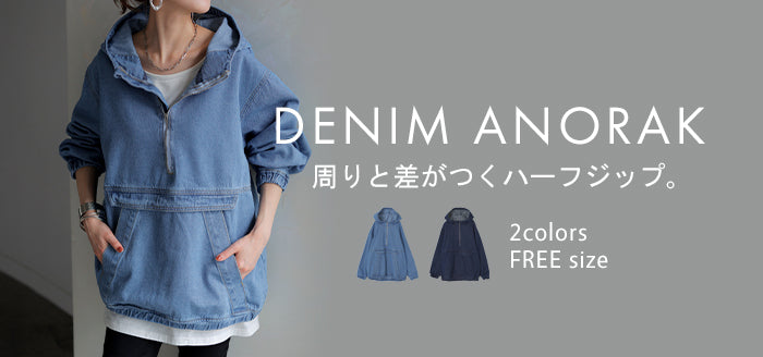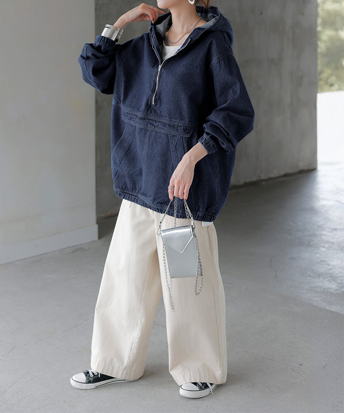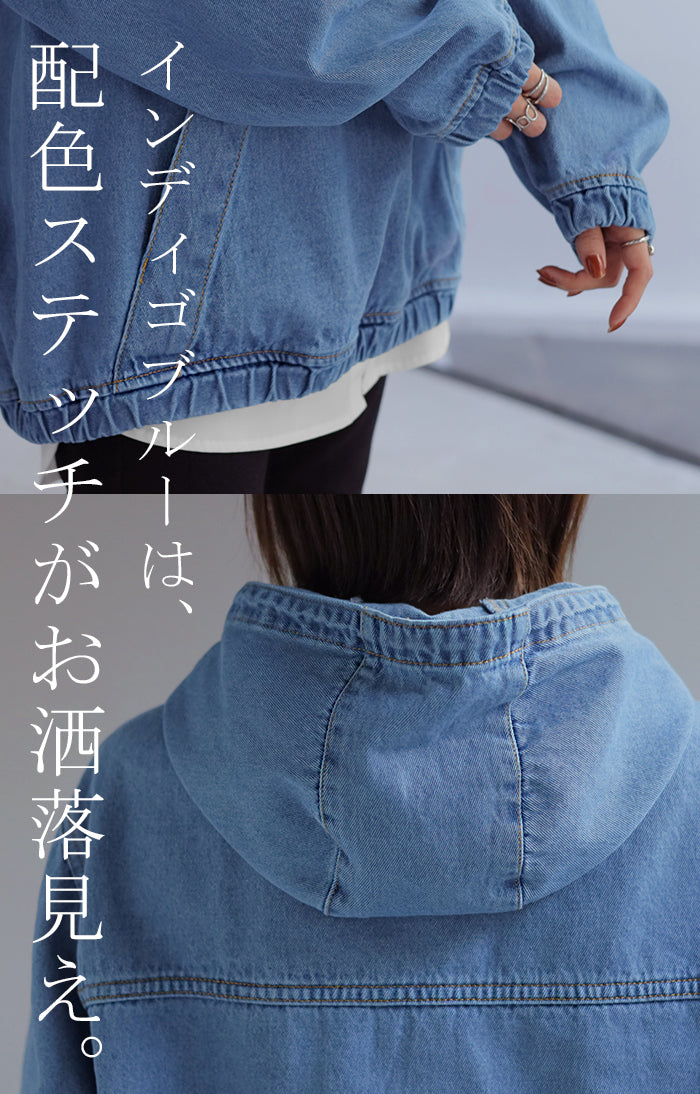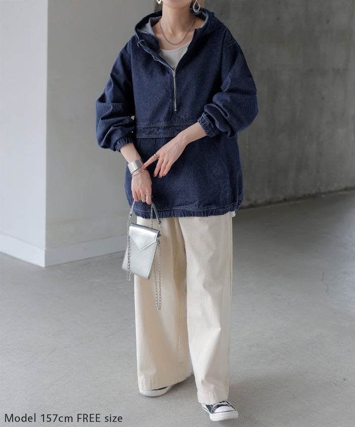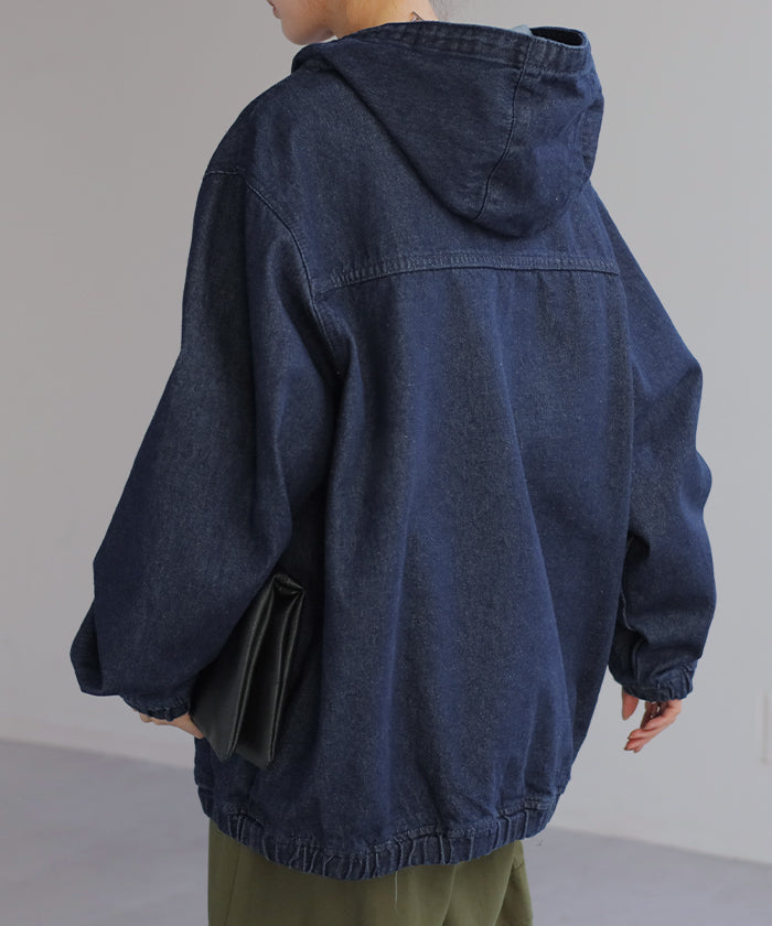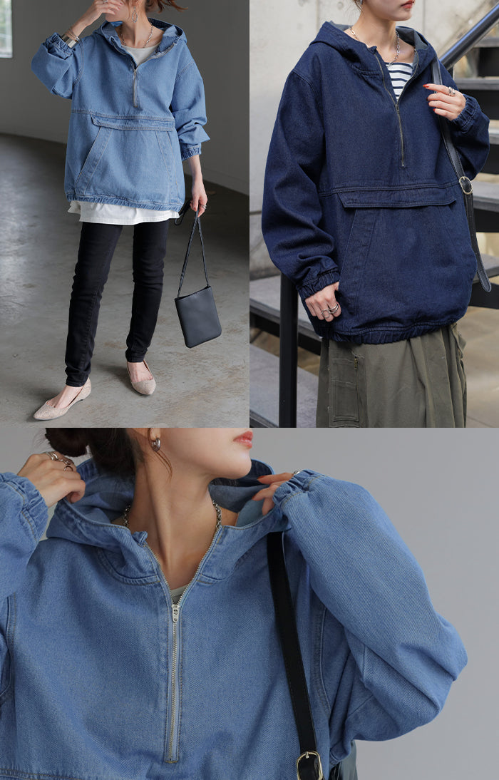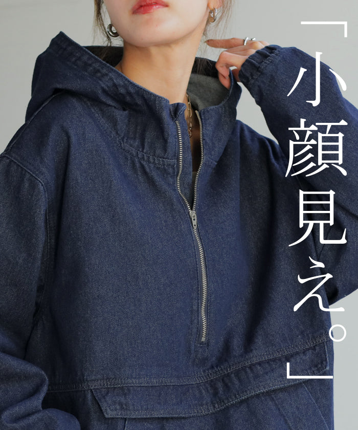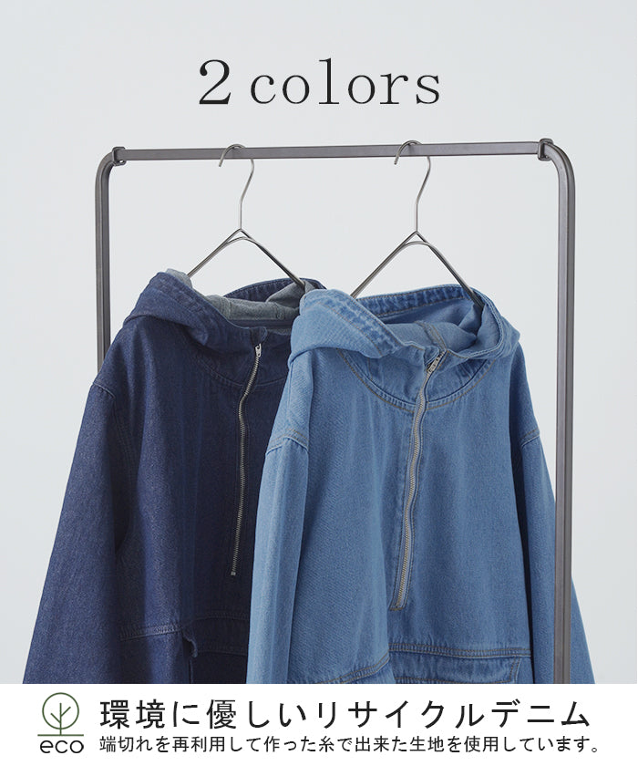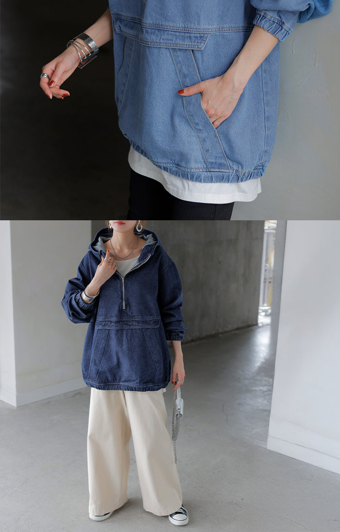 パーカー デニム ハーフジップ トップス レディース アノラック オーバーサイズ アウター アノラックパーカー ロング Gジャン デニムパーカー 羽織 お尻が隠れる フーディー ドロップショルダー ビッグ 無地 体型カバー 大きいサイズ 青 春 夏 HUG.U
