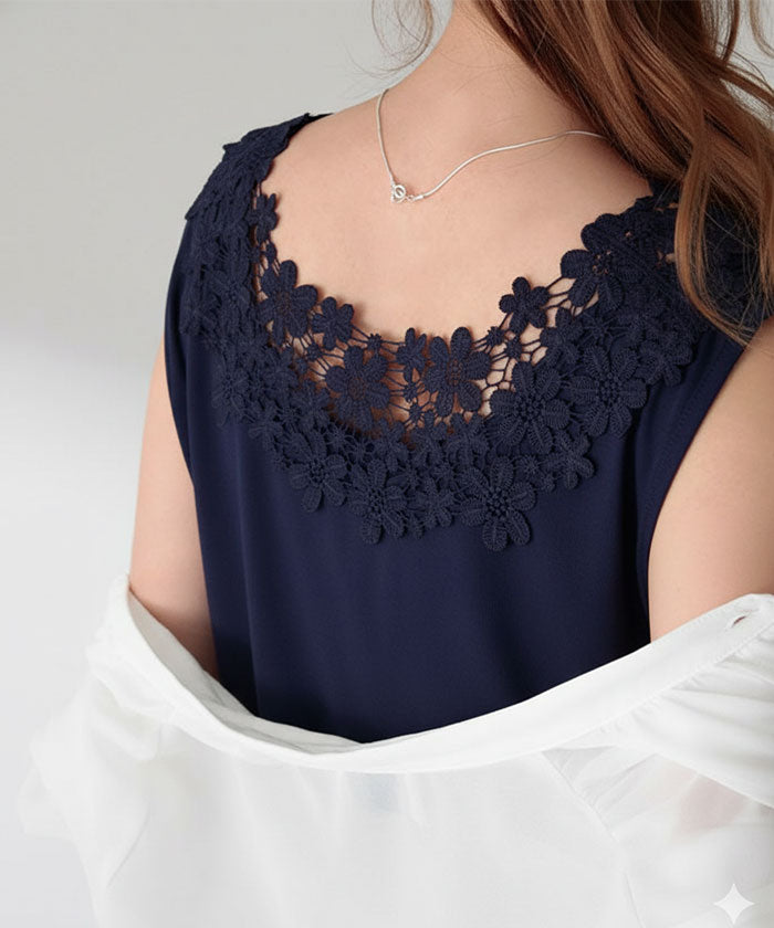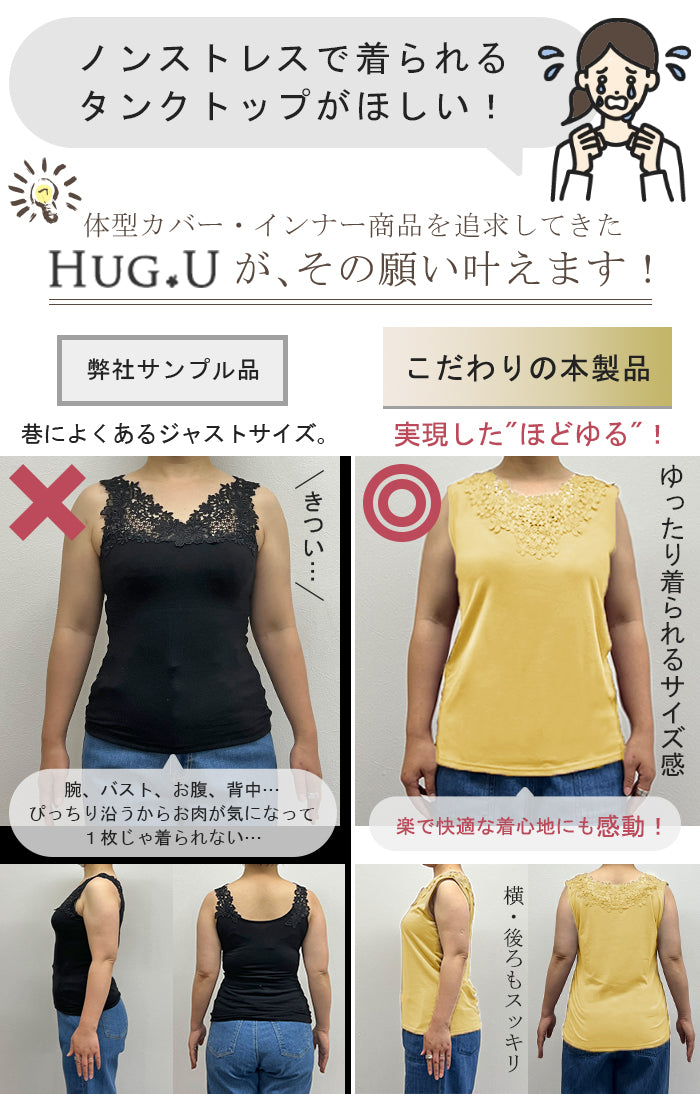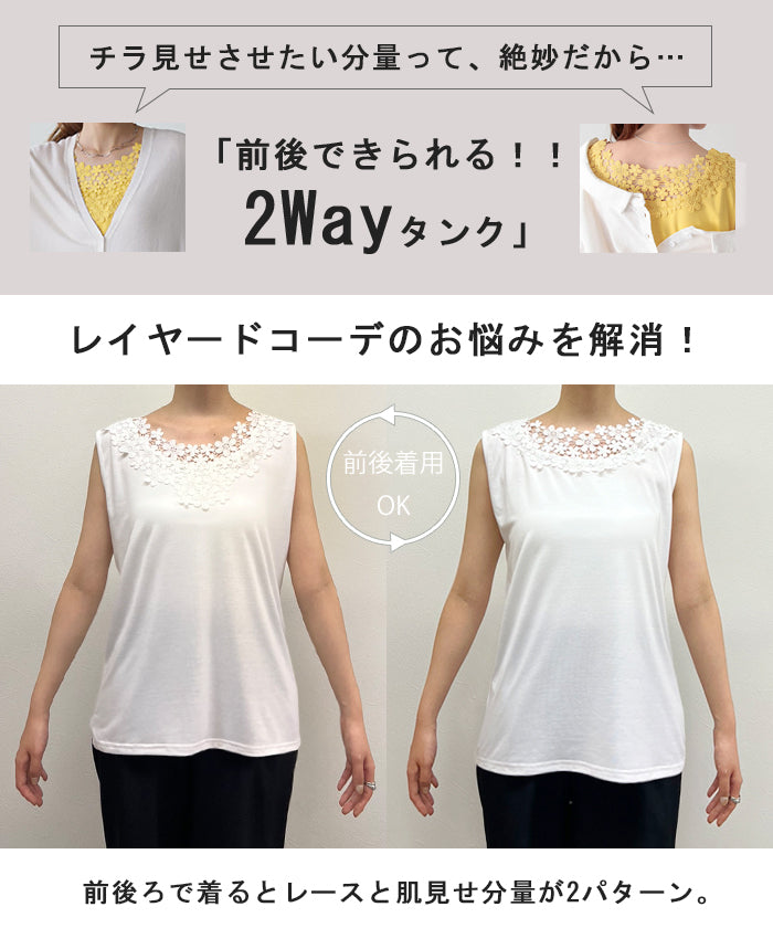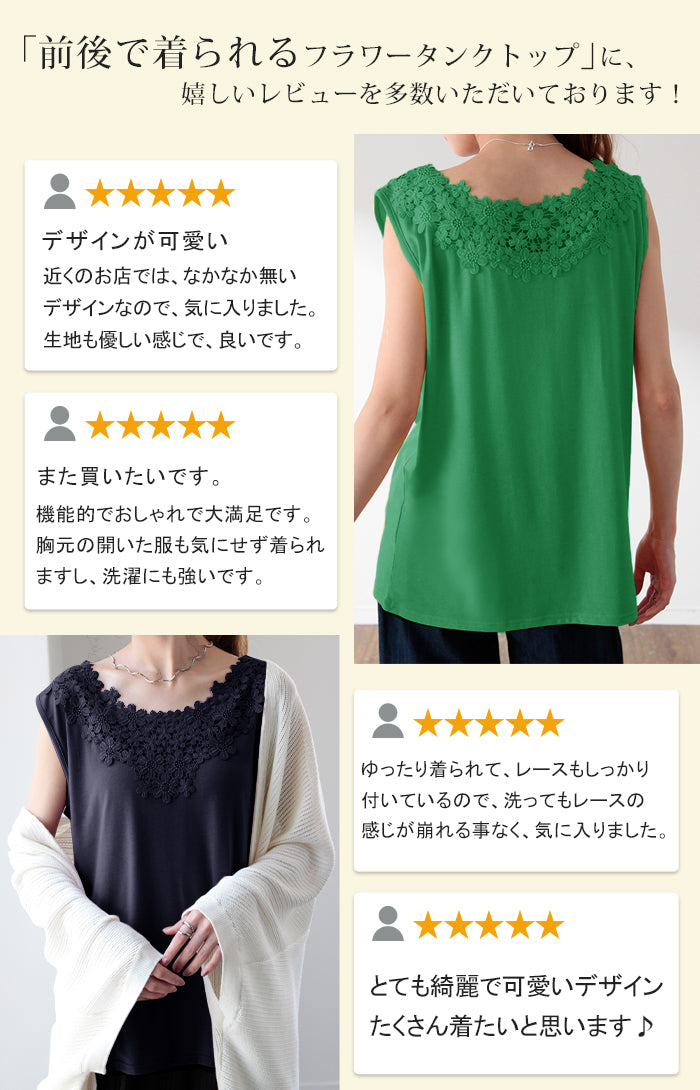 ゆったり 「前後で着られる」 フラワー タンクトップ レディース レース ロングタンク シアー チュニック丈 タンク トップス ノースリーブ 薄手 Uネック レイヤード インナー ロング 袖なし 透け 肌着 重ね着 きれいめ 大きいサイズ 黒 白 春 夏 HUG.U