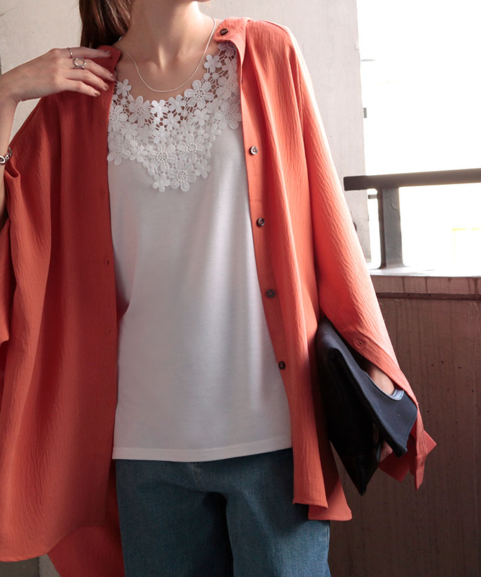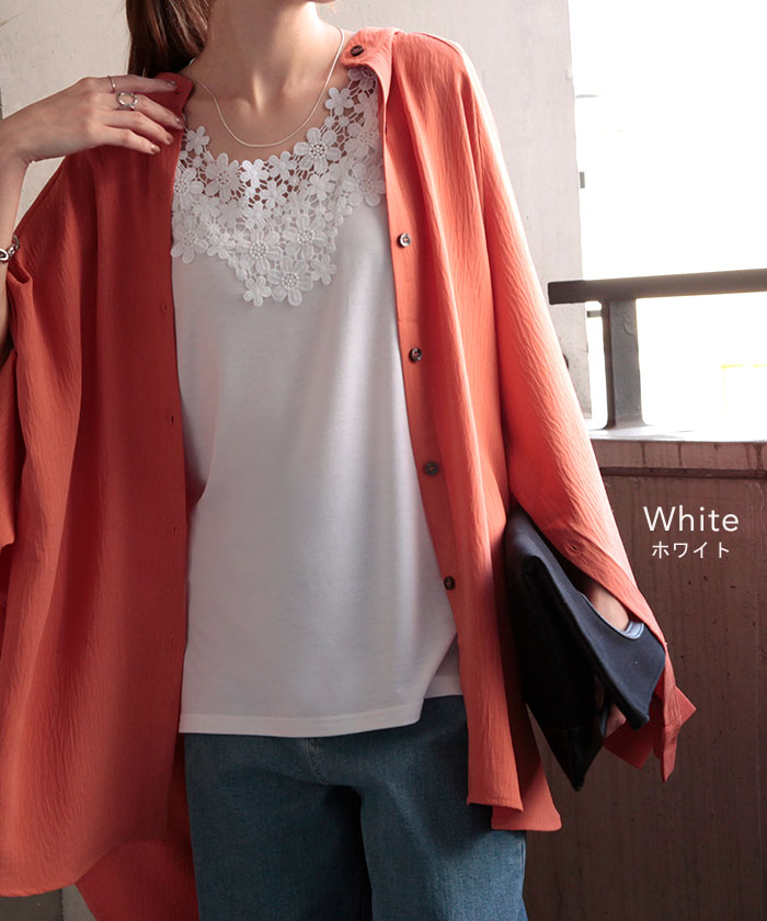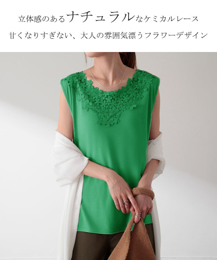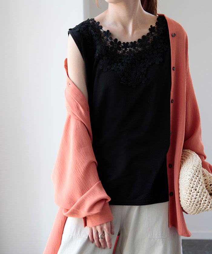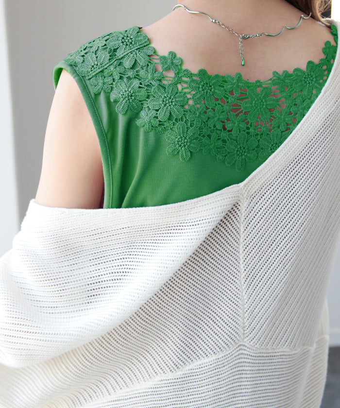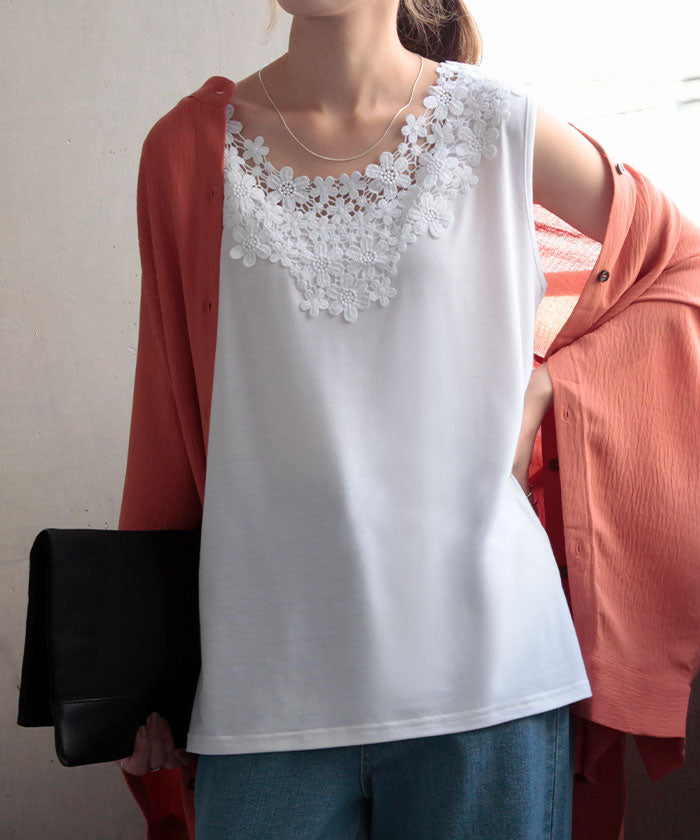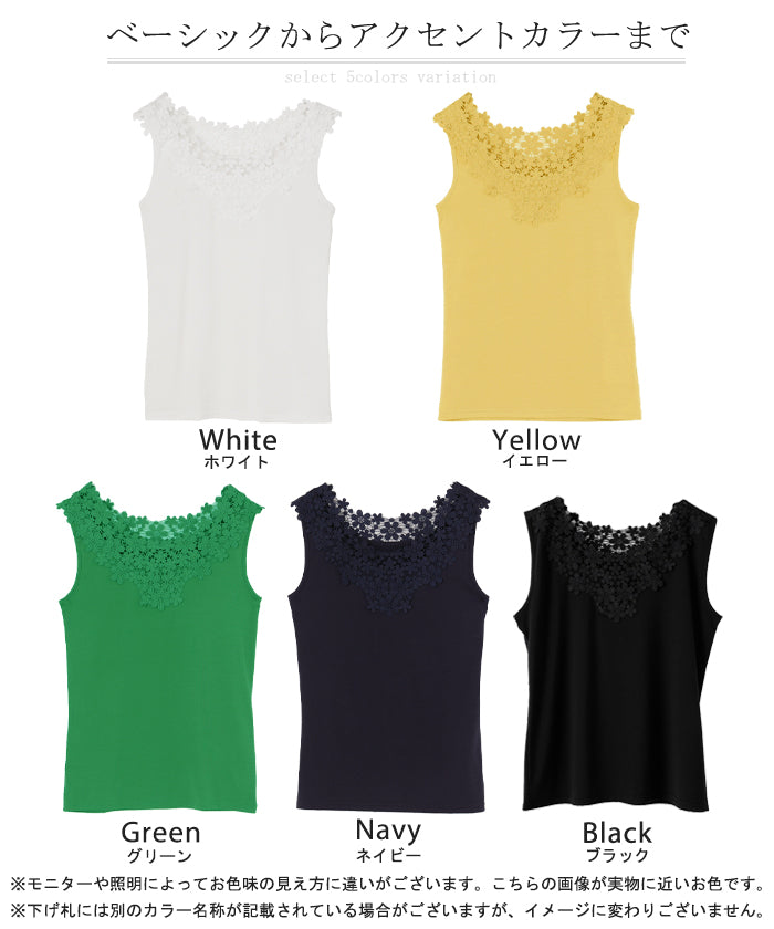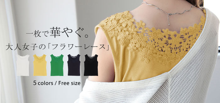 首周りにかけてたっぷりと使われたレースが印象的なタンクトップです。セクシーすぎず上品さが漂うバックコンシャスデザイン。シンプルなコーディネートにプラスワンするだけでコーデのアクセントに。※下げ札には別のカラー名称が記載されている場合がありますが、同色の別名でありイメージに違いはございません。