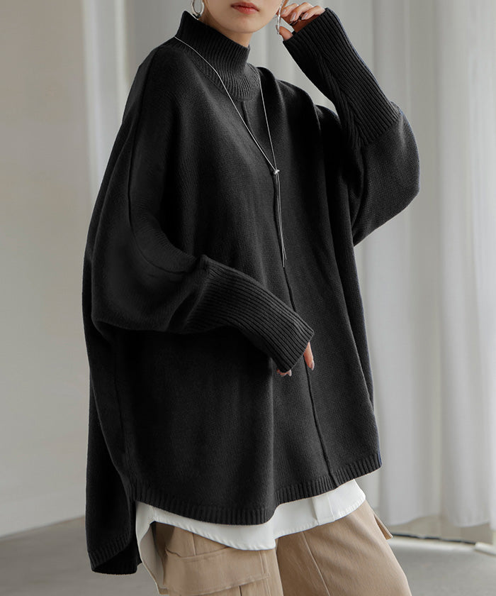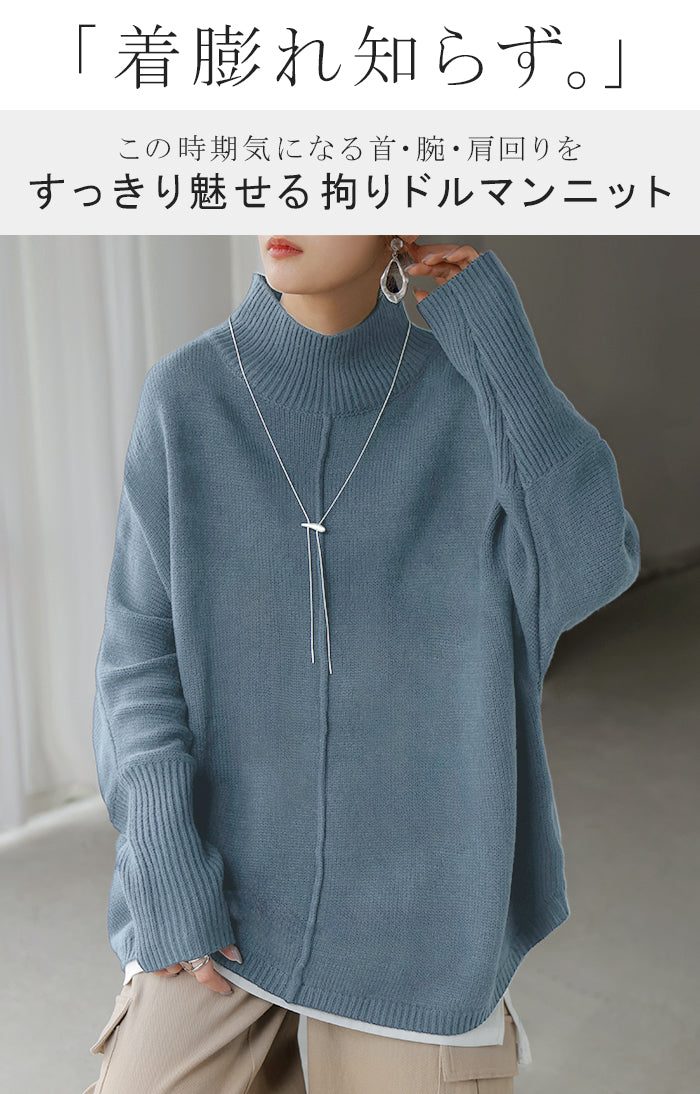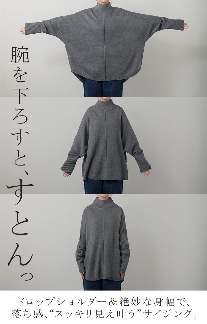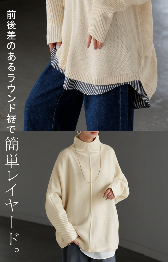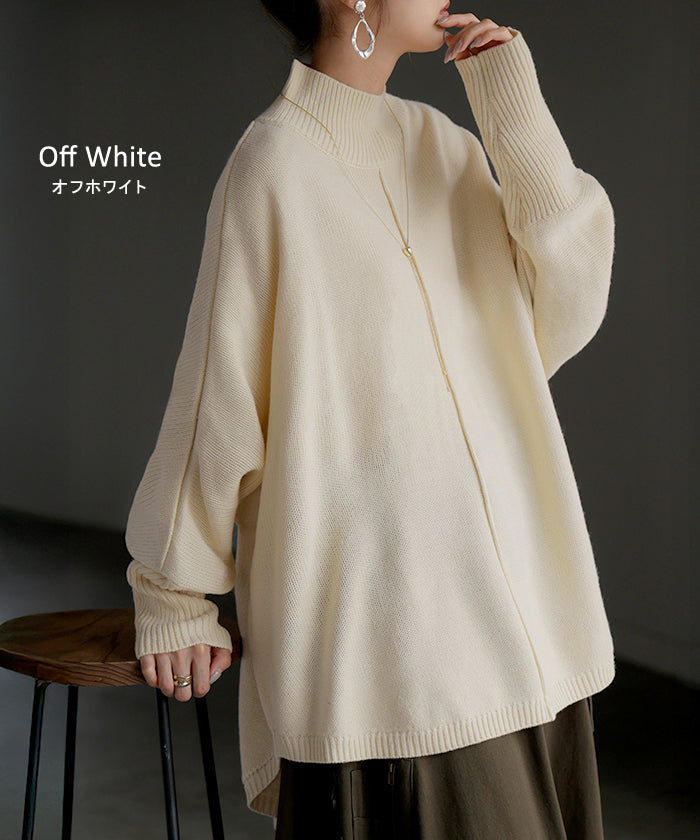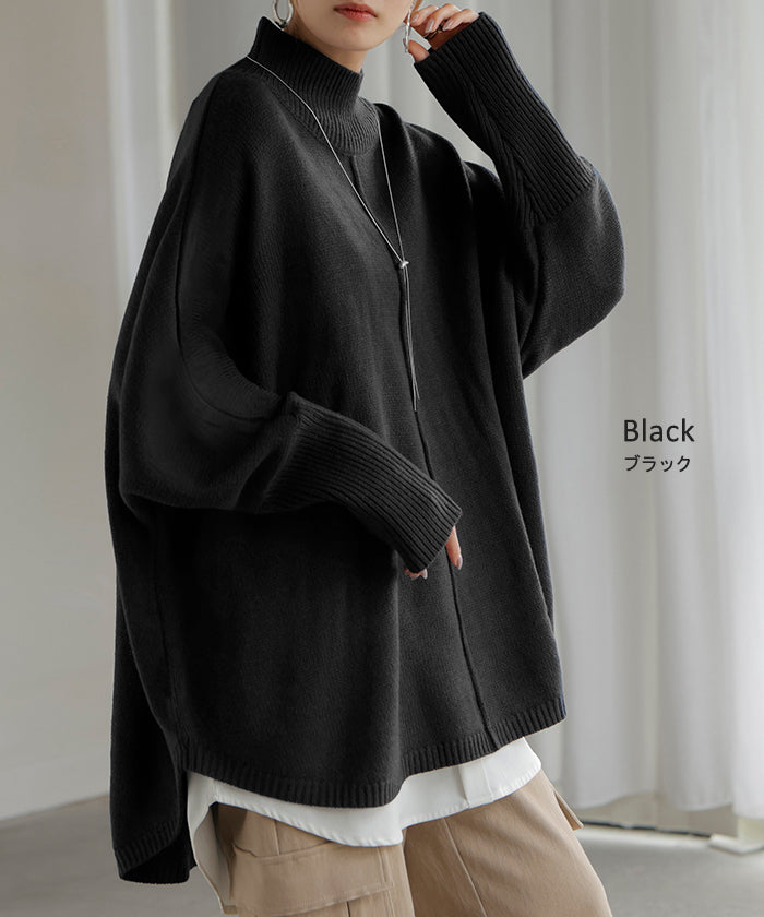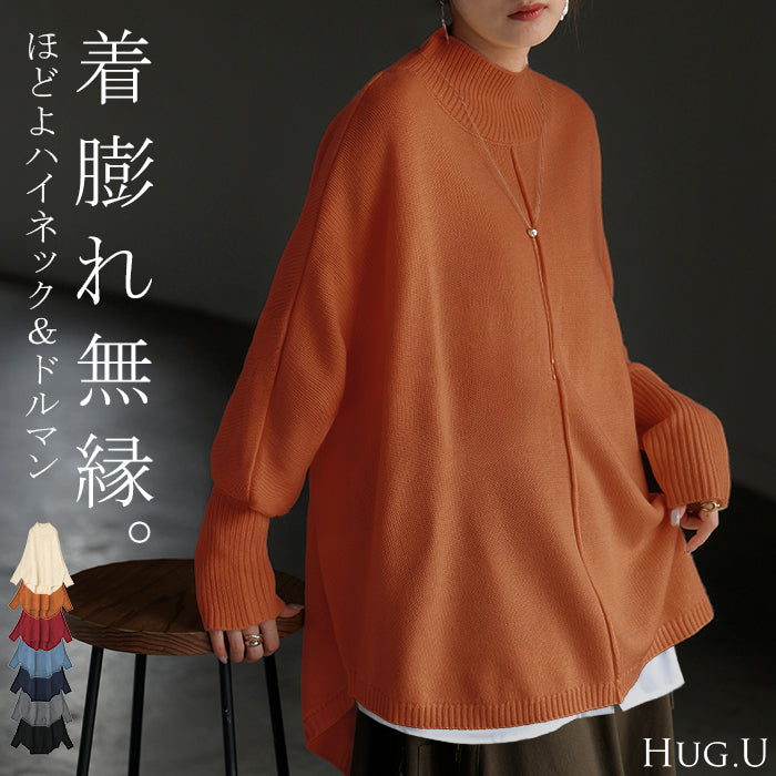 2025AW新作 ニット ハイネック ドルマン レディース トップス ロング セーター プルオーバー 長袖 長い ドルマンスリーブ タートルネック リブ 無地 チュニック レイヤード チクチクしない ゆったり 体型カバー 大きいサイズ お尻が隠れる カジュアル 黒 白 秋 冬 HUG.U