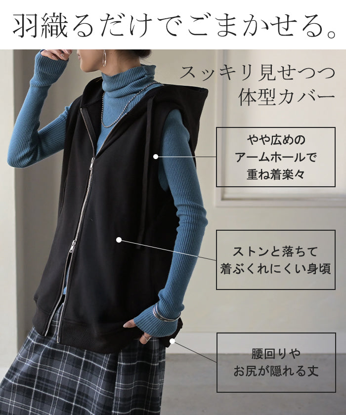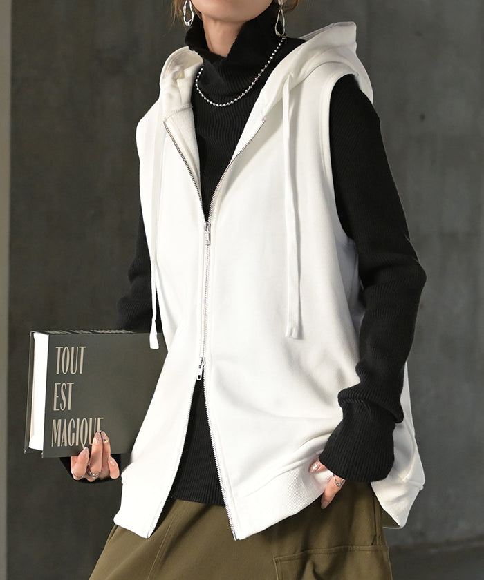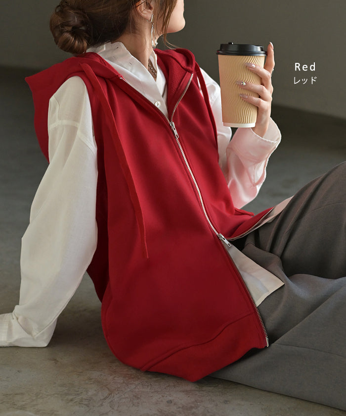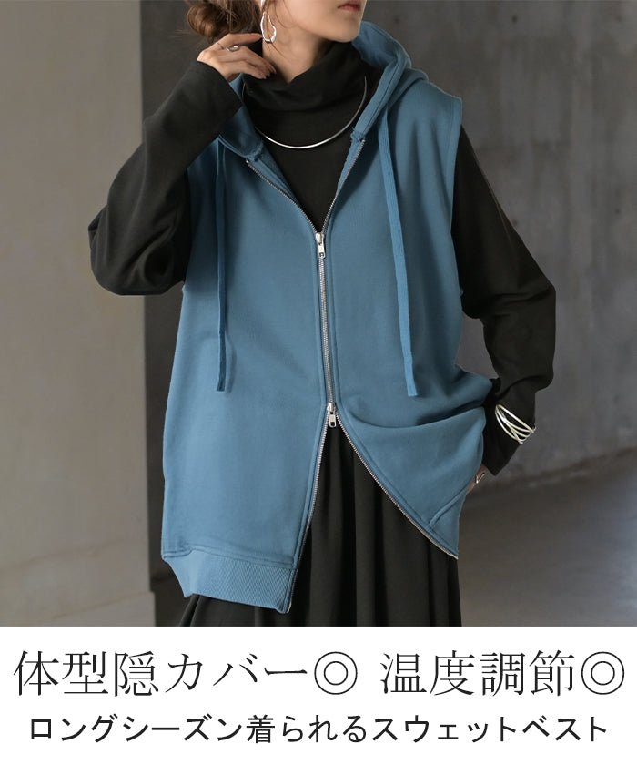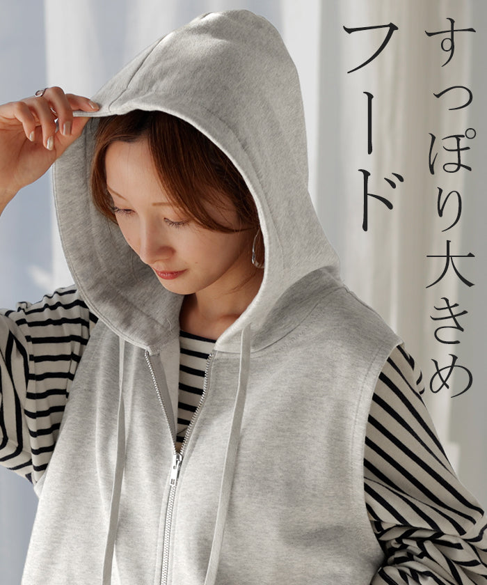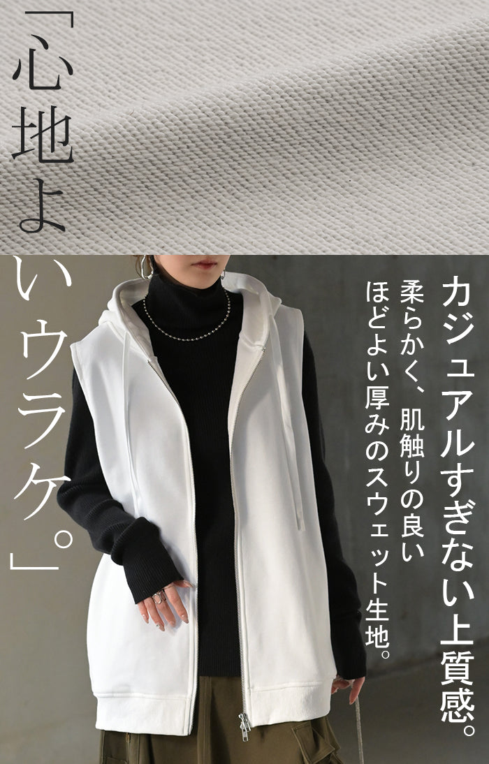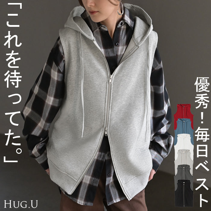 ベスト スウェット パーカー スポーティー ジレ スウェットベスト アウター レディース ライトアウター トップス ノースリーブ トレーナー フード フーディー ビッグ ゆったり 羽織 厚手 体型カバー 大きいサイズ お尻が隠れ 白 黒 春 夏 HUG.U