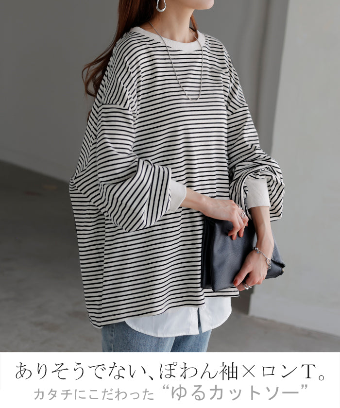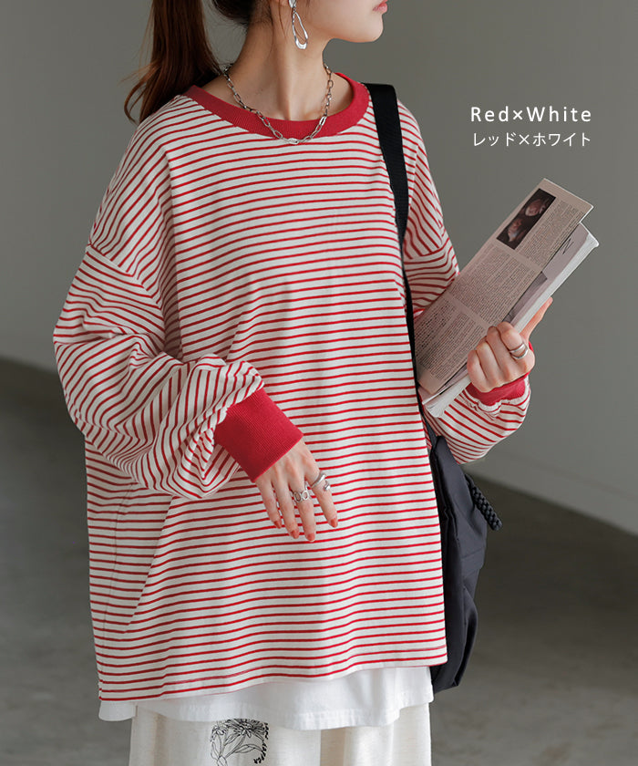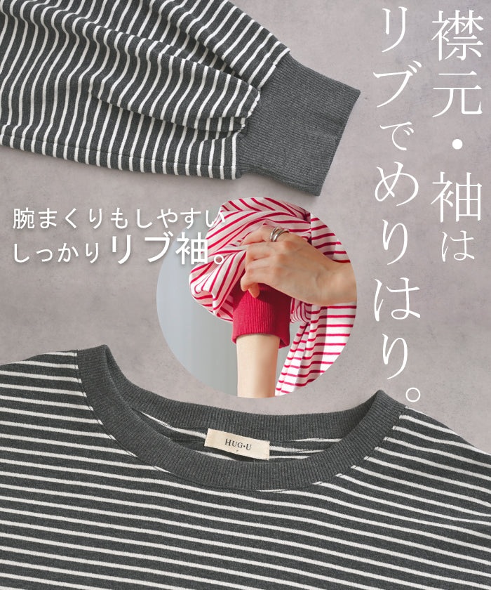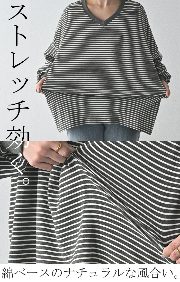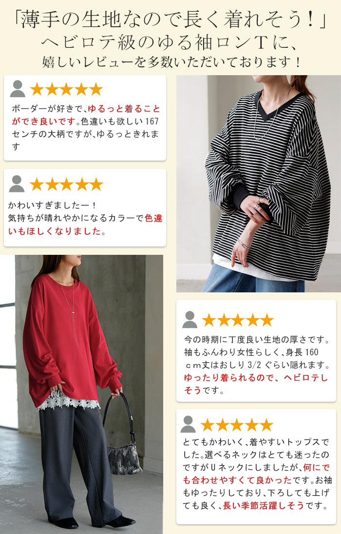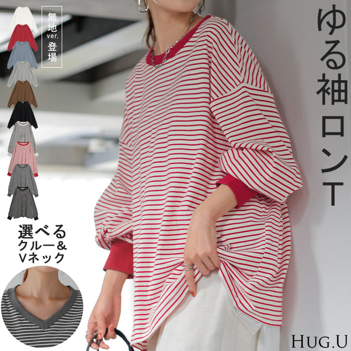 ロンT 「 選べるネック。」 ボーダー トップス レディース 長袖 Tシャツ カットソー ロング ティーシャツ チュニック ビッグ Vネック クルーネック 長い ドルマン ゆったり 無地 体型カバー お尻が隠れる 大きいサイズ おしゃれ 赤 黒 春 夏 HUG.U