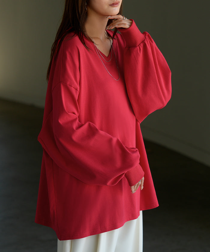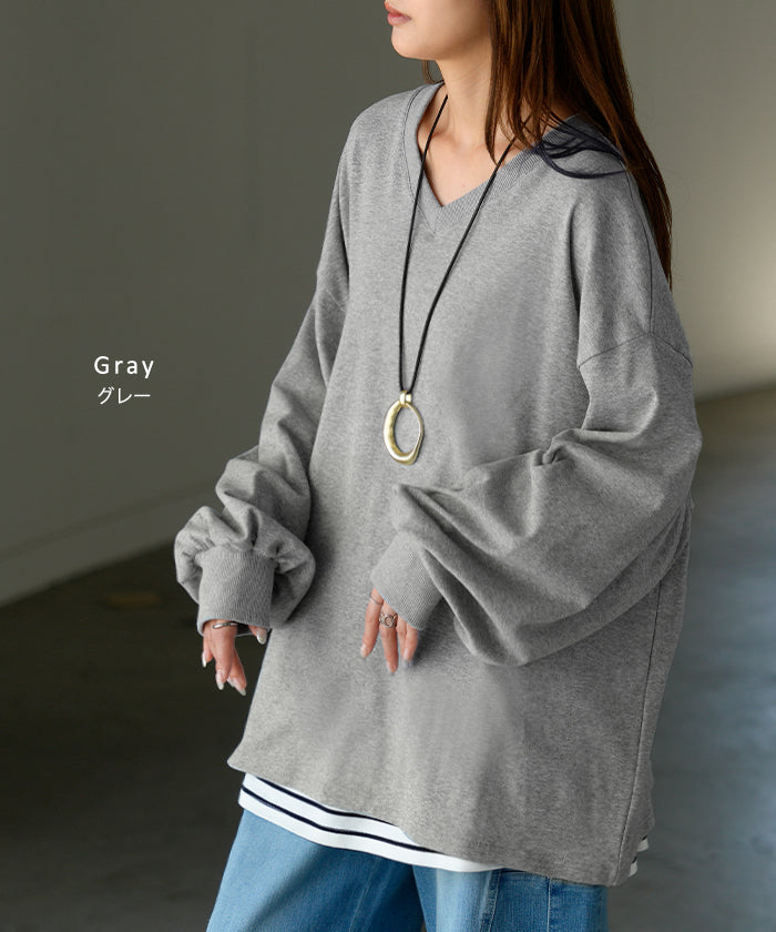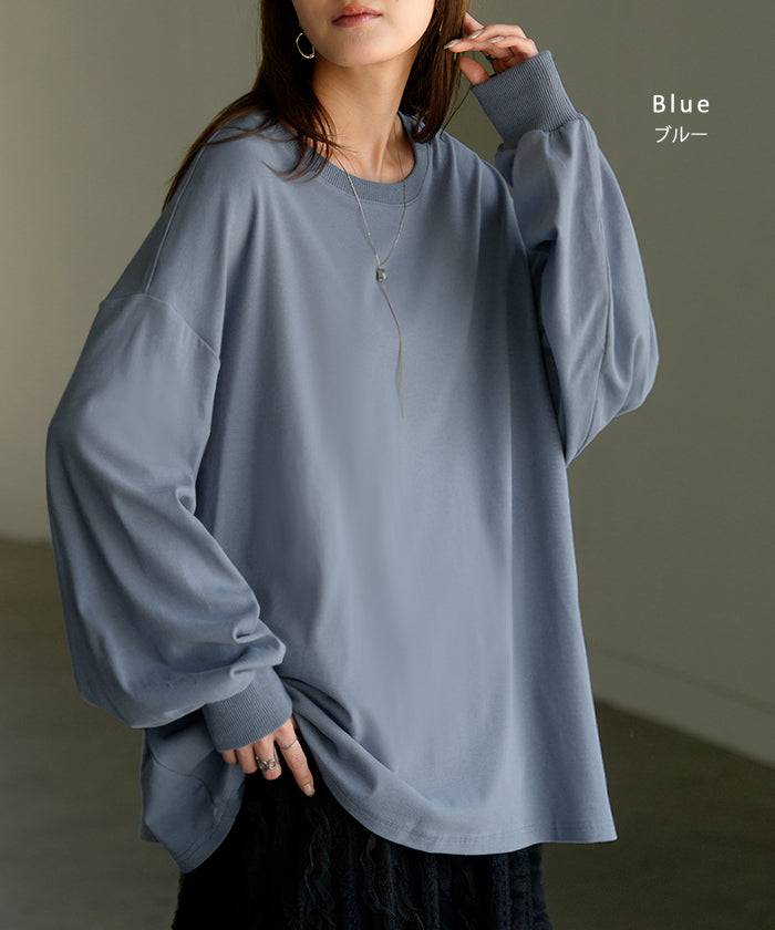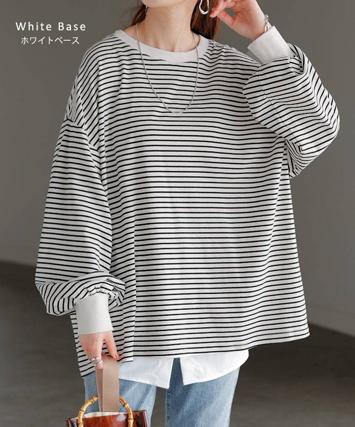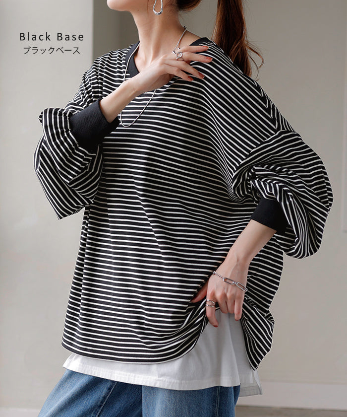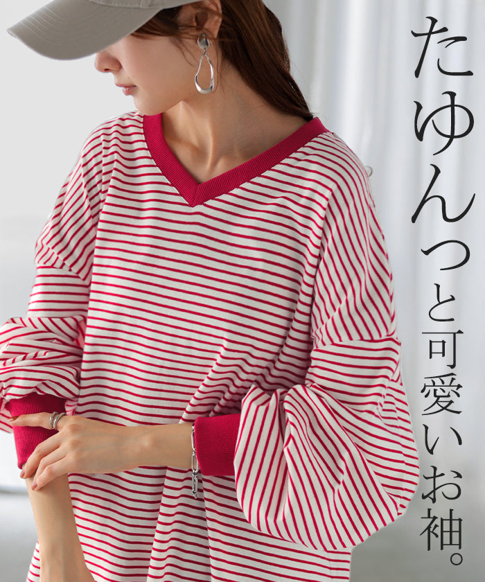 ロンT 「 選べるネック。」 ボーダー トップス レディース 長袖 Tシャツ カットソー ロング ティーシャツ チュニック ビッグ Vネック クルーネック 長い ドルマン ゆったり 無地 体型カバー お尻が隠れる 大きいサイズ おしゃれ 赤 黒 春 夏 HUG.U