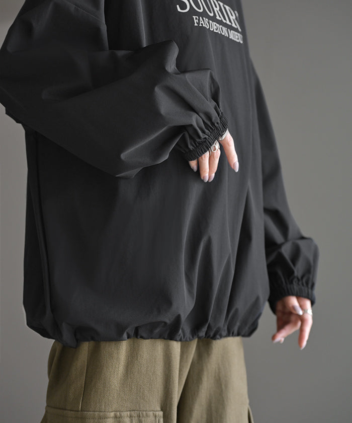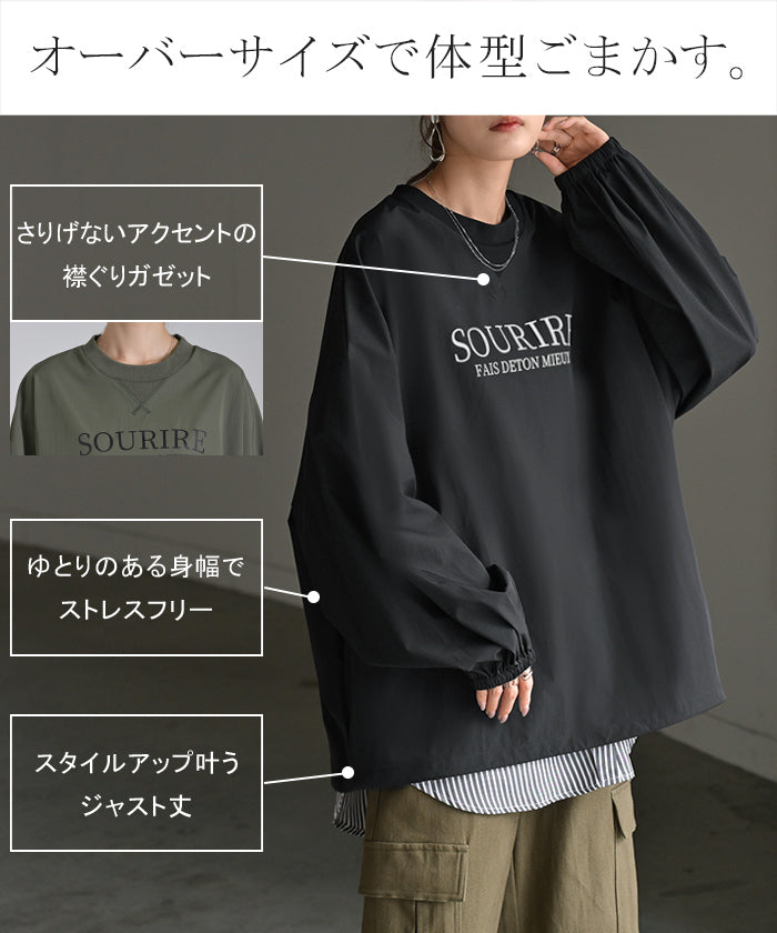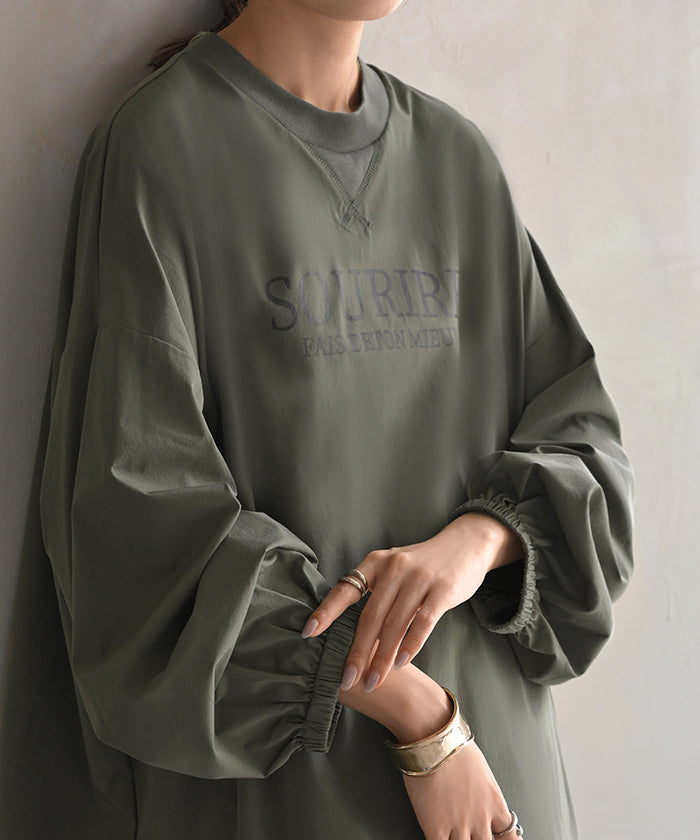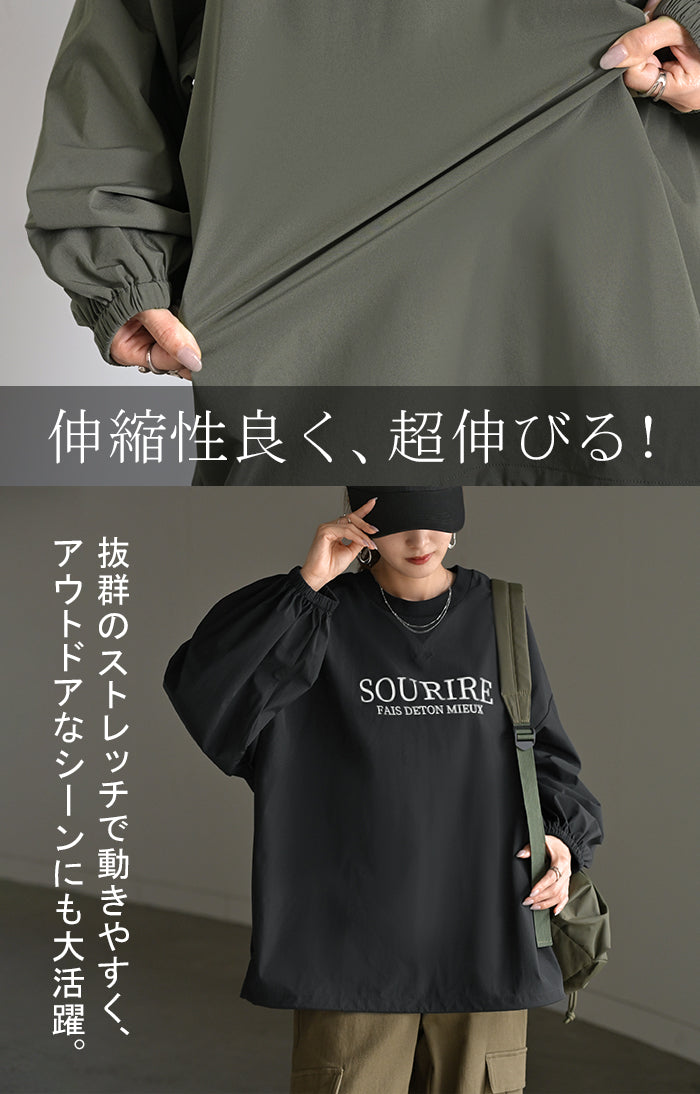 2025AW新作 プルオーバー ナイロン ロゴ ■一部10月下旬入荷 レディース トップス 長袖 プリント 軽量 ナイロンプルオーバー カットソー ロング チュニック ビッグ ボリュームスリーブ ストレッチ ゆったり 体型カバー 大きいサイズ おしゃれ カジュアル 黒 カーキ 秋 冬 HUG.U メール便