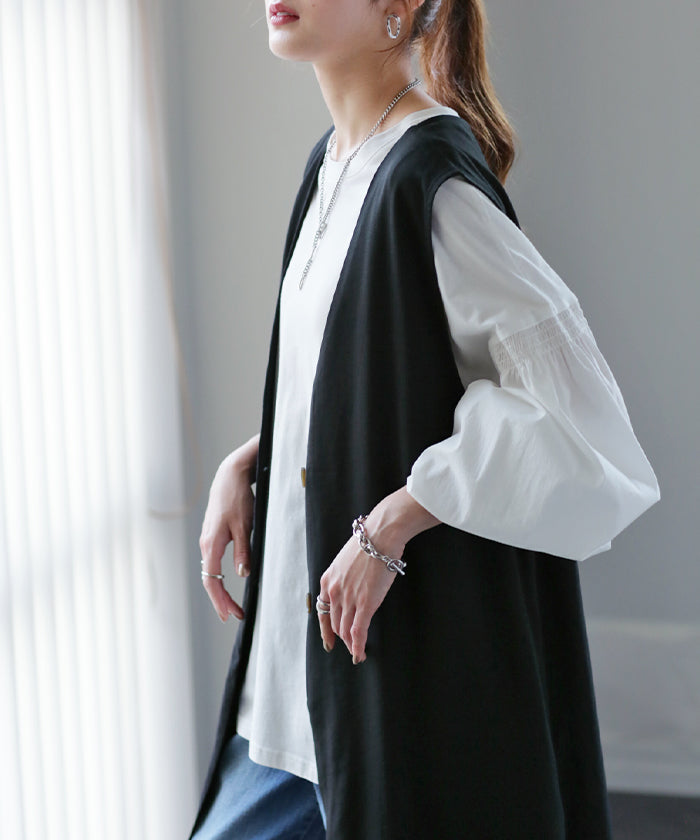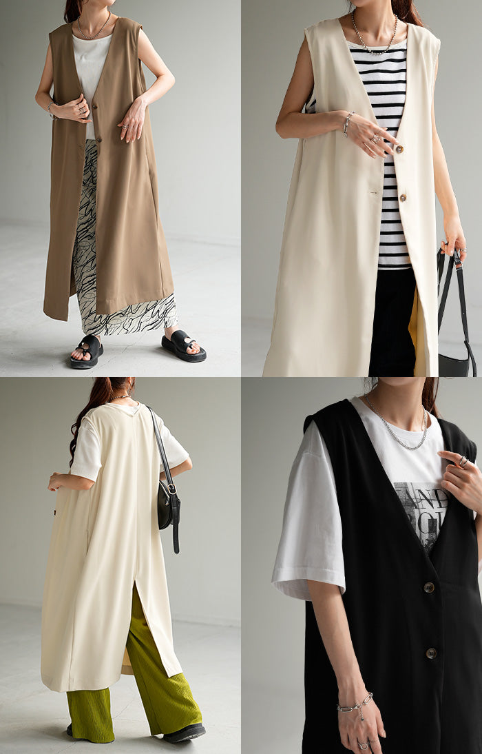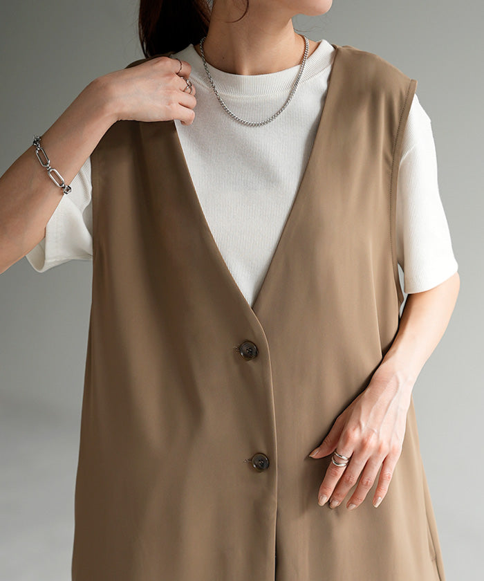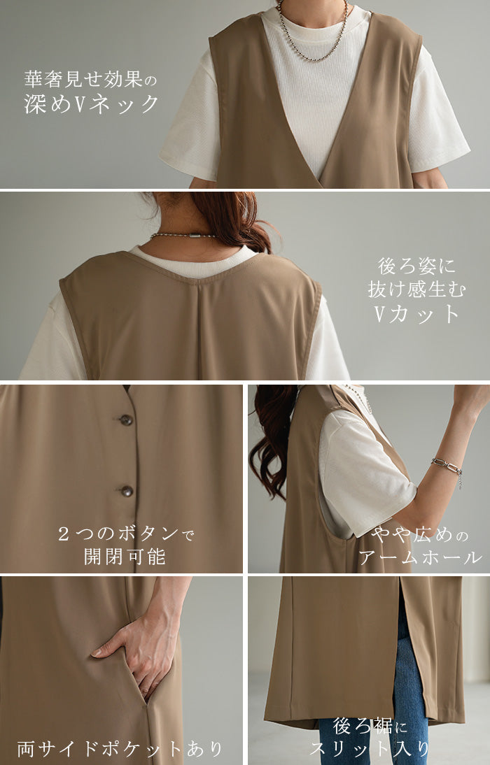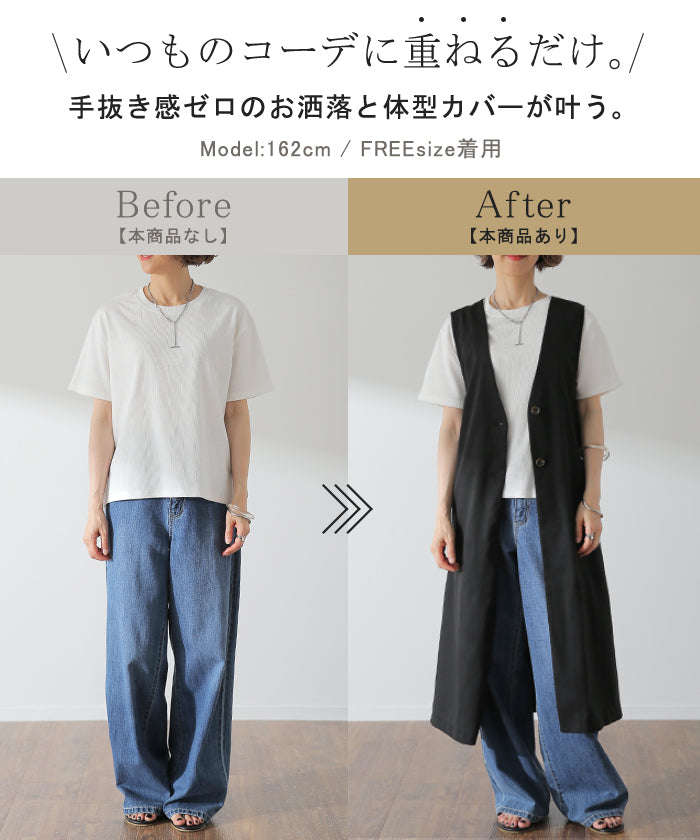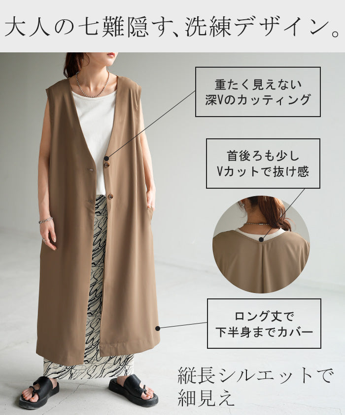さっと軽やかに羽織れてコーディネートがぐっと引き締まるロングベスト。着回し性が高いだけではありません!面積が多い分サラッと気になる部分は体型カバー、スラっと見えするのも高ポイント。さりげなく長めにとったVネックも大人見えポイントです。