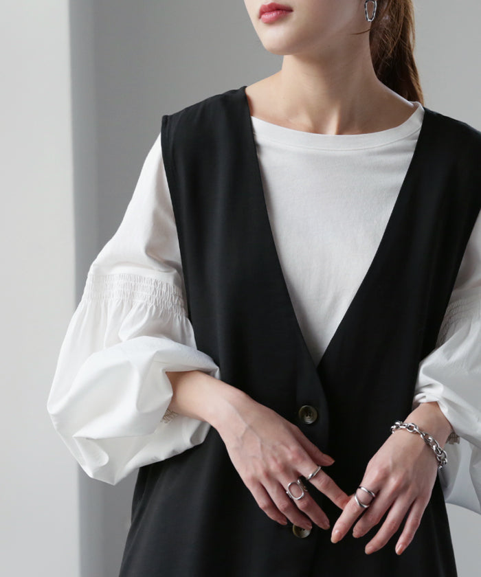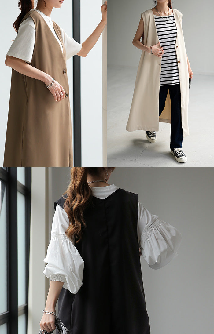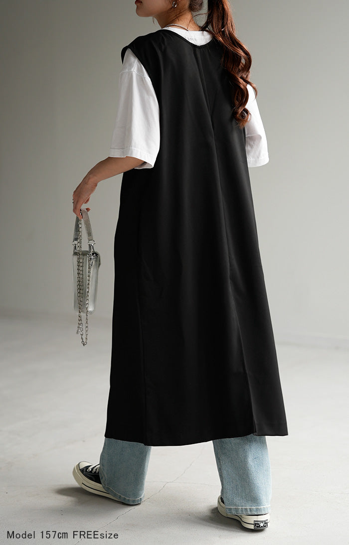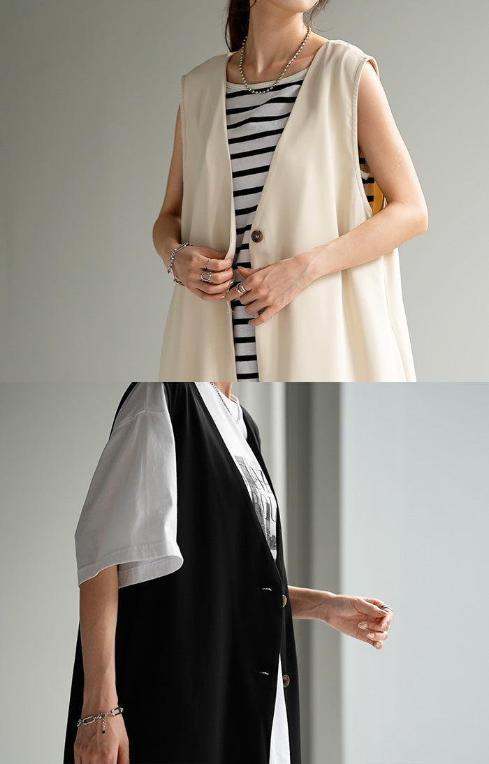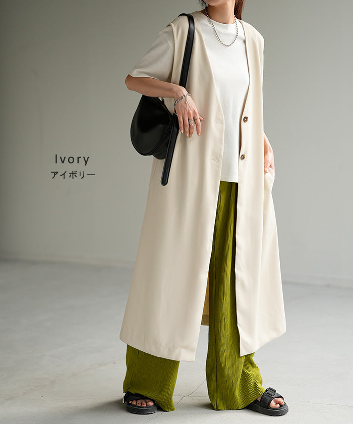 さっと軽やかに羽織れてコーディネートがぐっと引き締まるロングベスト。着回し性が高いだけではありません!面積が多い分サラッと気になる部分は体型カバー、スラっと見えするのも高ポイント。さりげなく長めにとったVネックも大人見えポイントです。