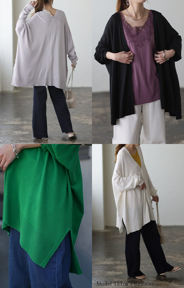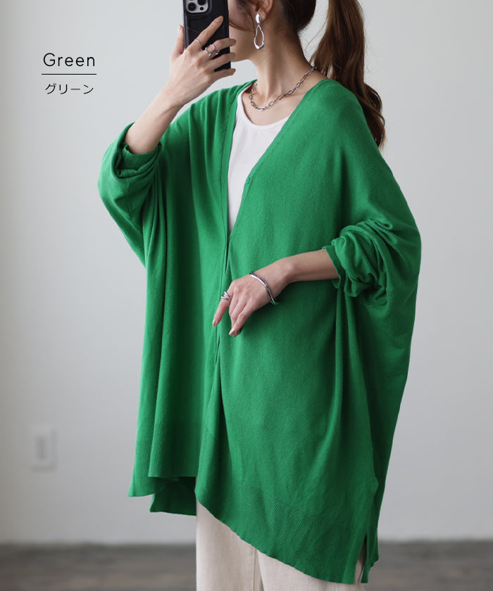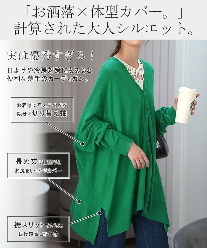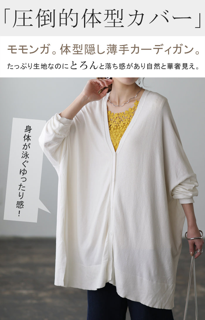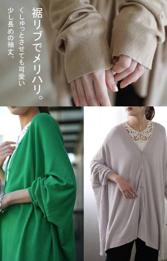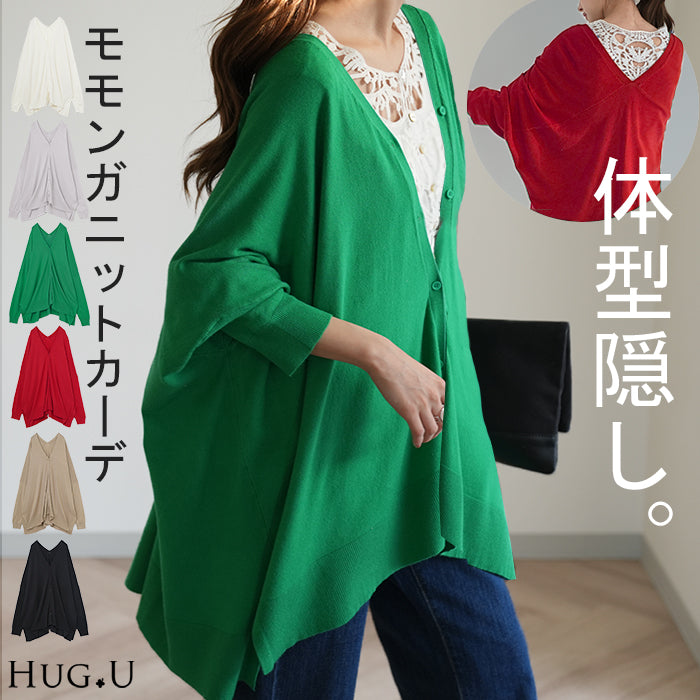 「 モモンガ 」 ニット カーディガン 体型カバー レディース セーター トップス ニットカーディガン 軽い カーデ ドレープ 長袖 ライトニット レイヤード 羽織 チュニック お尻が隠れる ゆったり 長め コクーン リブ グリーン 黒 春 夏 HUG.U