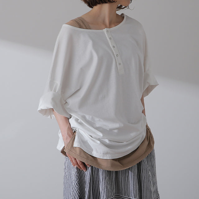 細番手の糸を使用したカットソーで伸縮性は勿論、きめ細やかな素材だからこそのソフトな肌当たりがとても心地よいです。 レイヤードを楽しめる本商品は、あえて綺麗すぎない、生地ムラを持たせることで豊かな表情を持たせています。カラー展開も9色とコーディネートの想像が膨らむ多色展開です!