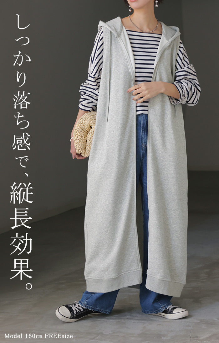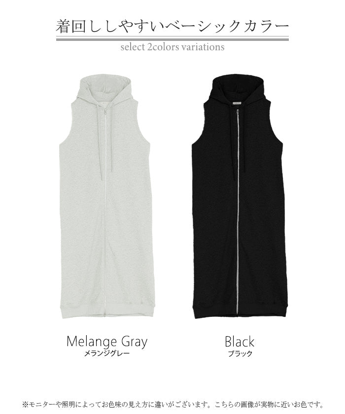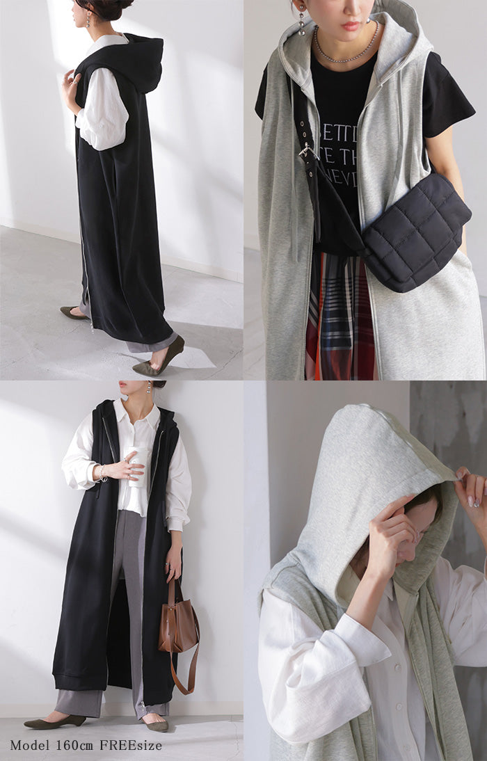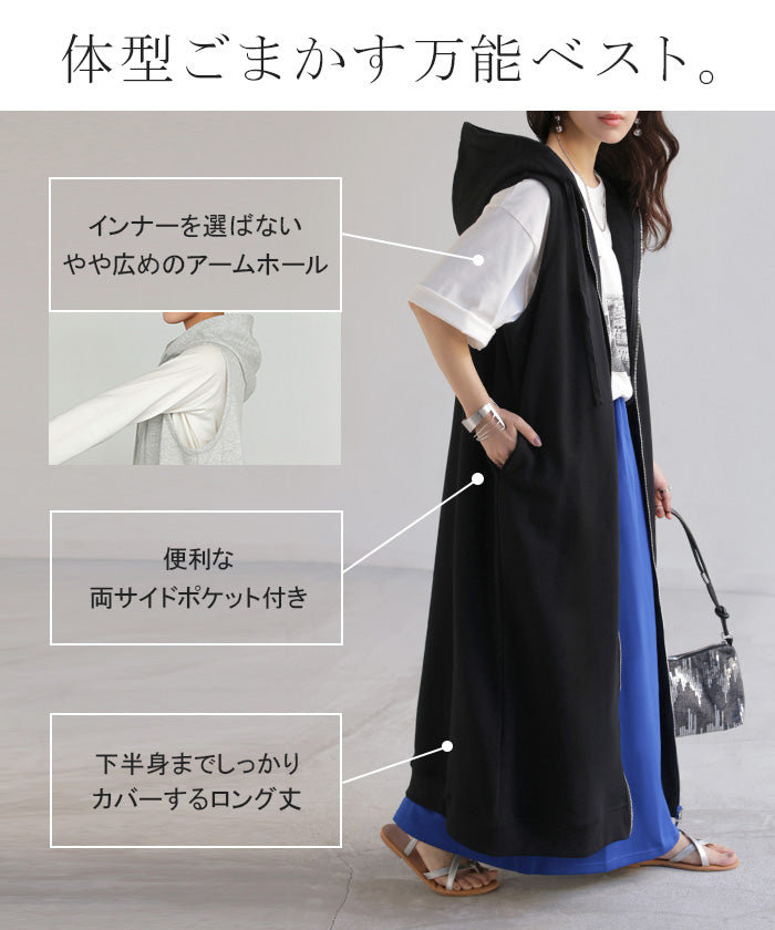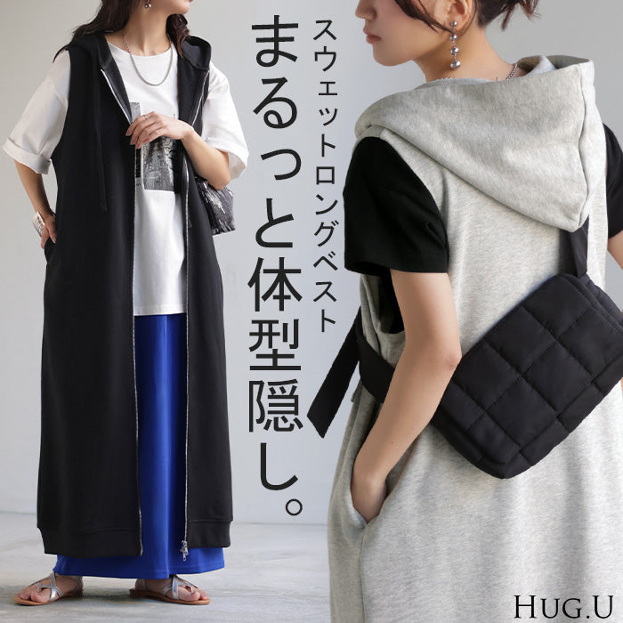 2025AW新作 ベスト ロング スウェット レディース トップス アウター ジレ ロングジレ ノースリーブ パーカー 羽織 裏毛 ポケット フード レイヤード 体型カバー おしゃれ カジュアル 前開き ダブルジップ ゆったり お尻が隠れる 大きいサイズ 黒 グレー 秋 冬 HUG.U