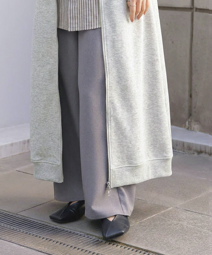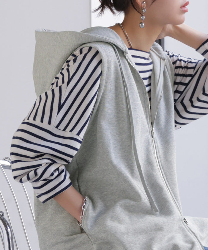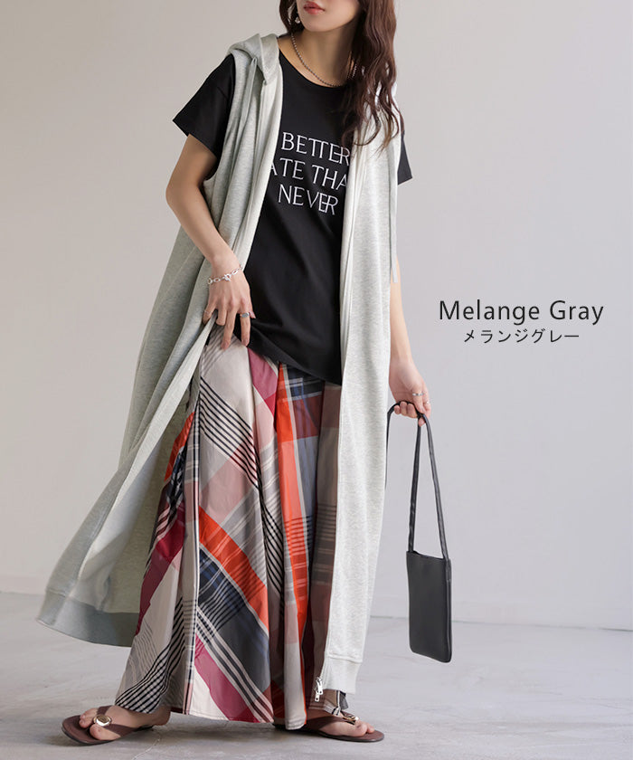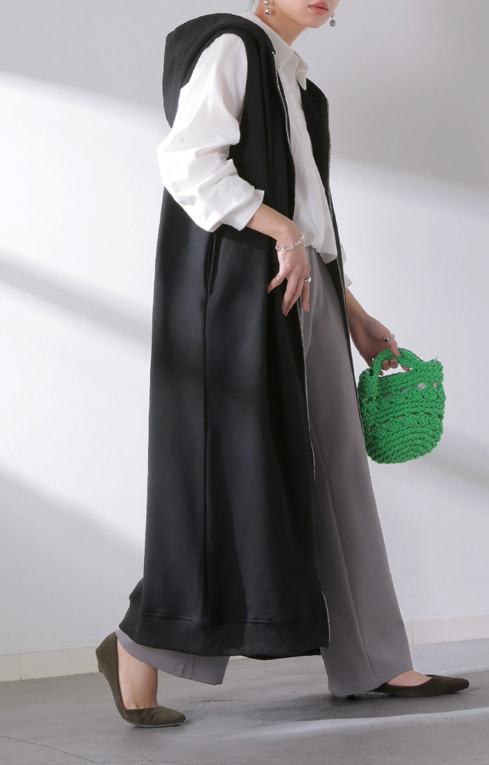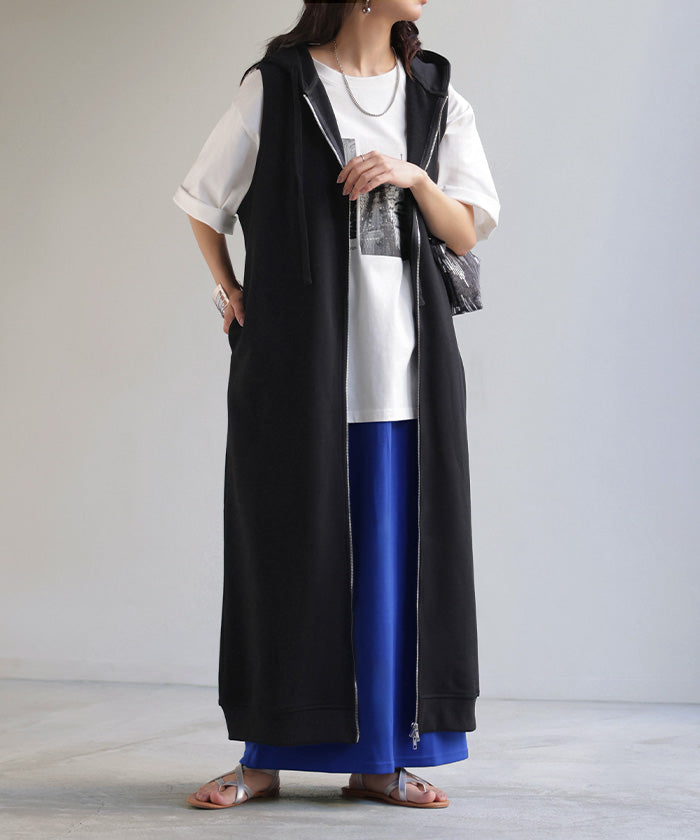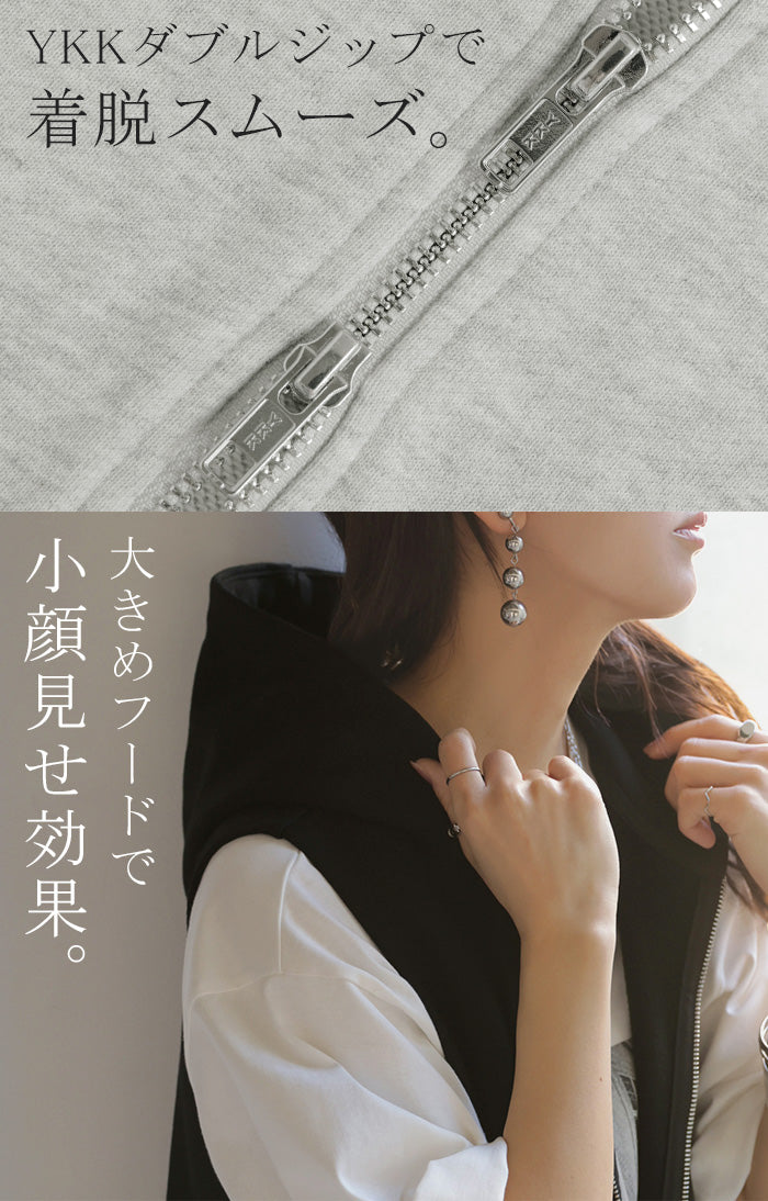 2025AW新作 ベスト ロング スウェット レディース トップス アウター ジレ ロングジレ ノースリーブ パーカー 羽織 裏毛 ポケット フード レイヤード 体型カバー おしゃれ カジュアル 前開き ダブルジップ ゆったり お尻が隠れる 大きいサイズ 黒 グレー 秋 冬 HUG.U