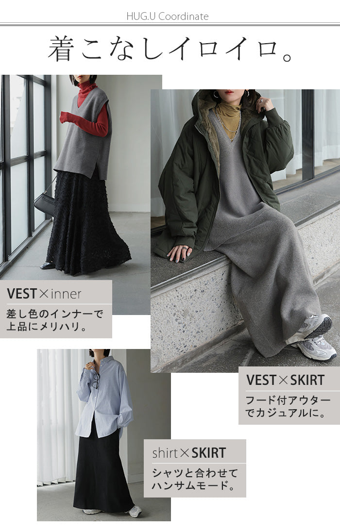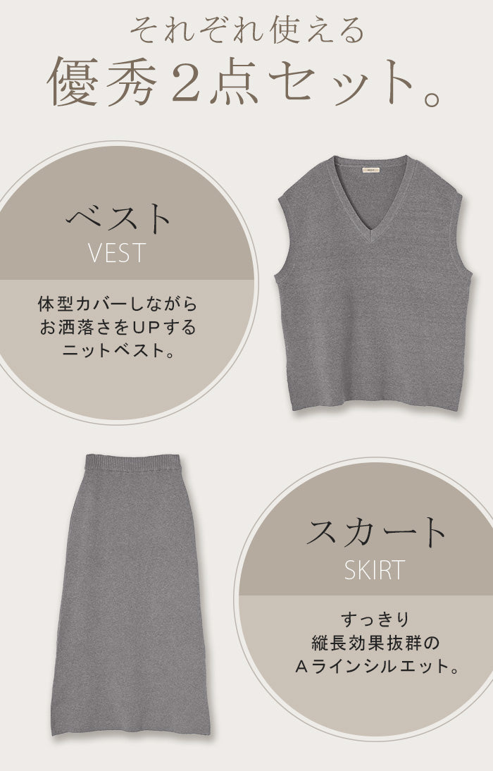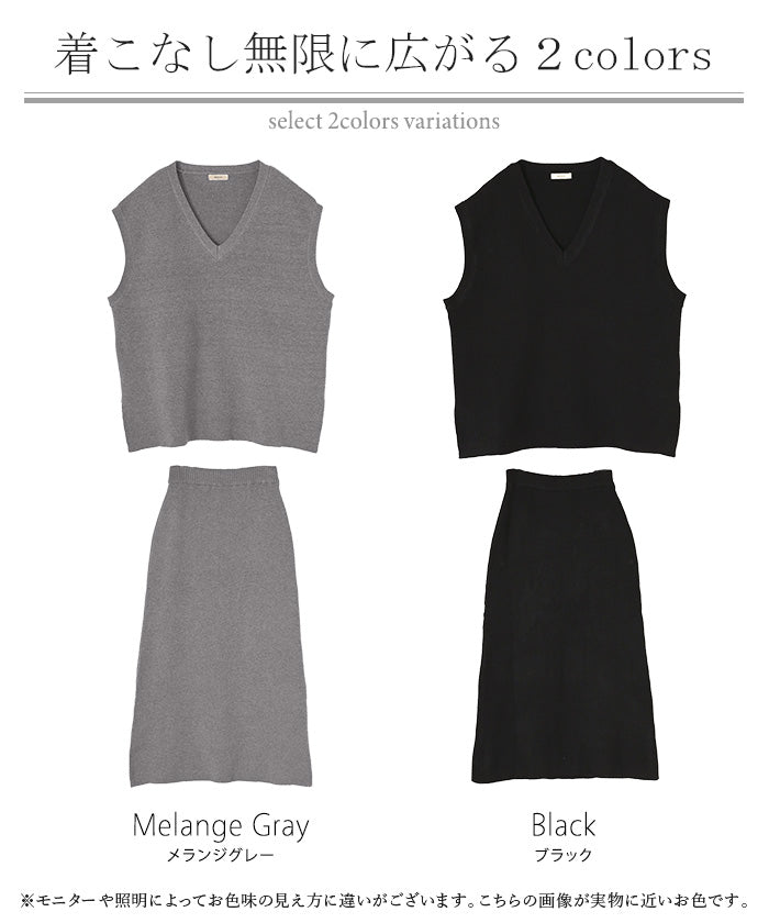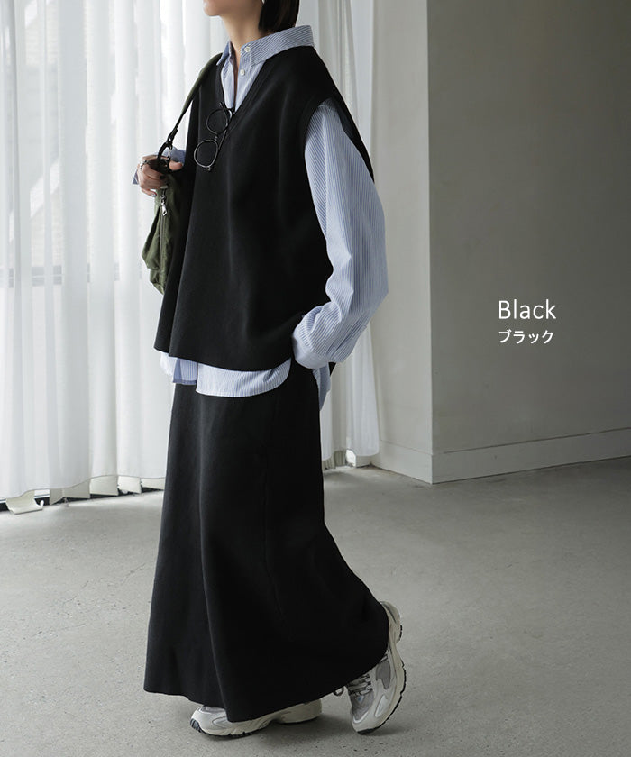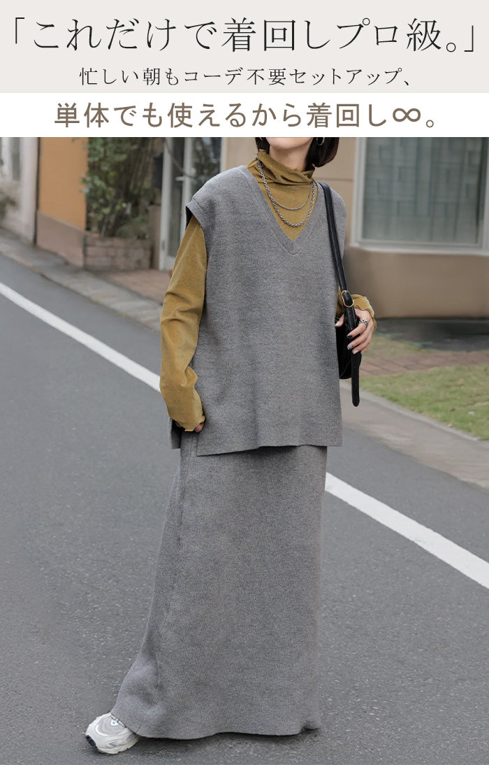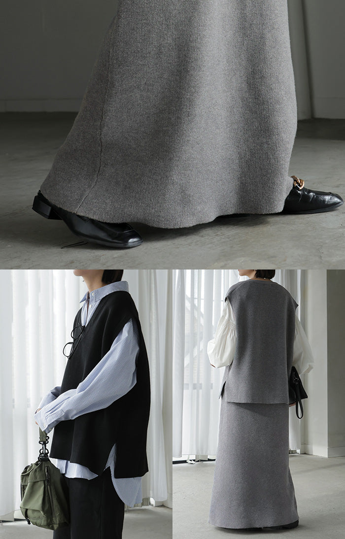 2025AW新作 セットアップ 「 ニットベスト × スカート 」 2点セット レイヤード ニット ベスト ニットスカート ジレ トップス チュニック ロング レディース ロングスカート 体型カバー 重ね着 ノースリーブ タンク Aライン ゴム きれいめ 黒 グレー 秋 冬 HUG.U