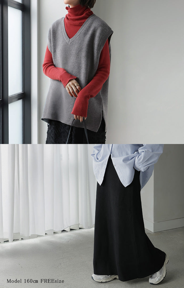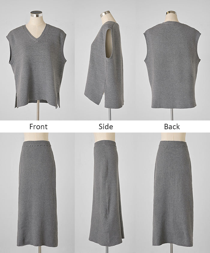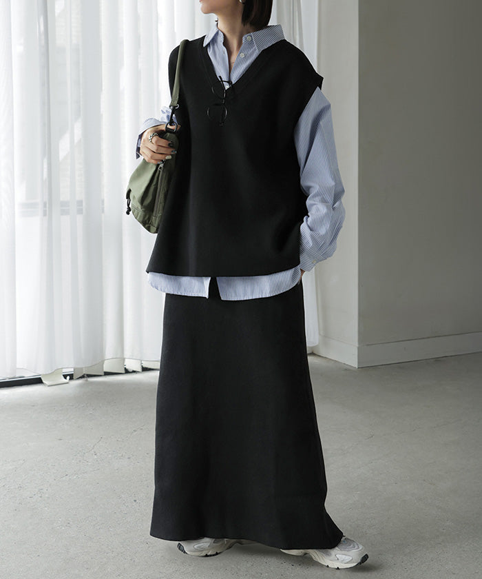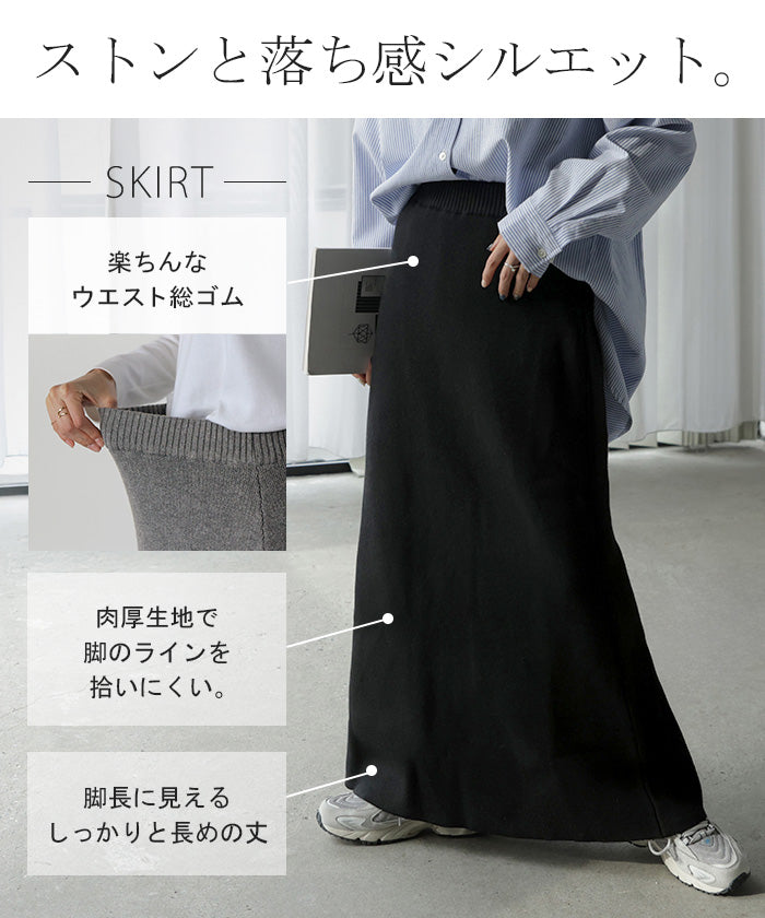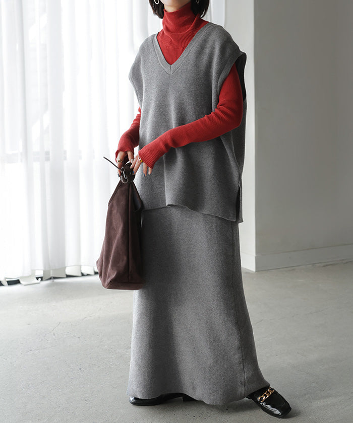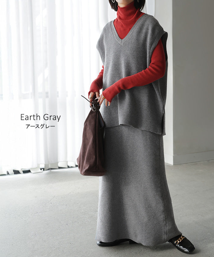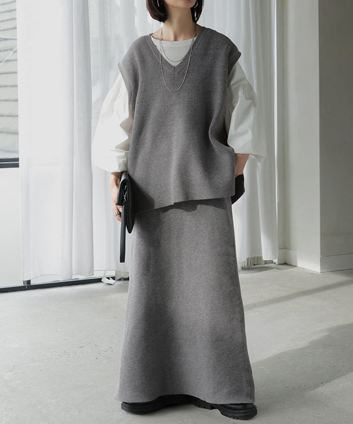 2025AW新作 セットアップ 「 ニットベスト × スカート 」 2点セット レイヤード ニット ベスト ニットスカート ジレ トップス チュニック ロング レディース ロングスカート 体型カバー 重ね着 ノースリーブ タンク Aライン ゴム きれいめ 黒 グレー 秋 冬 HUG.U