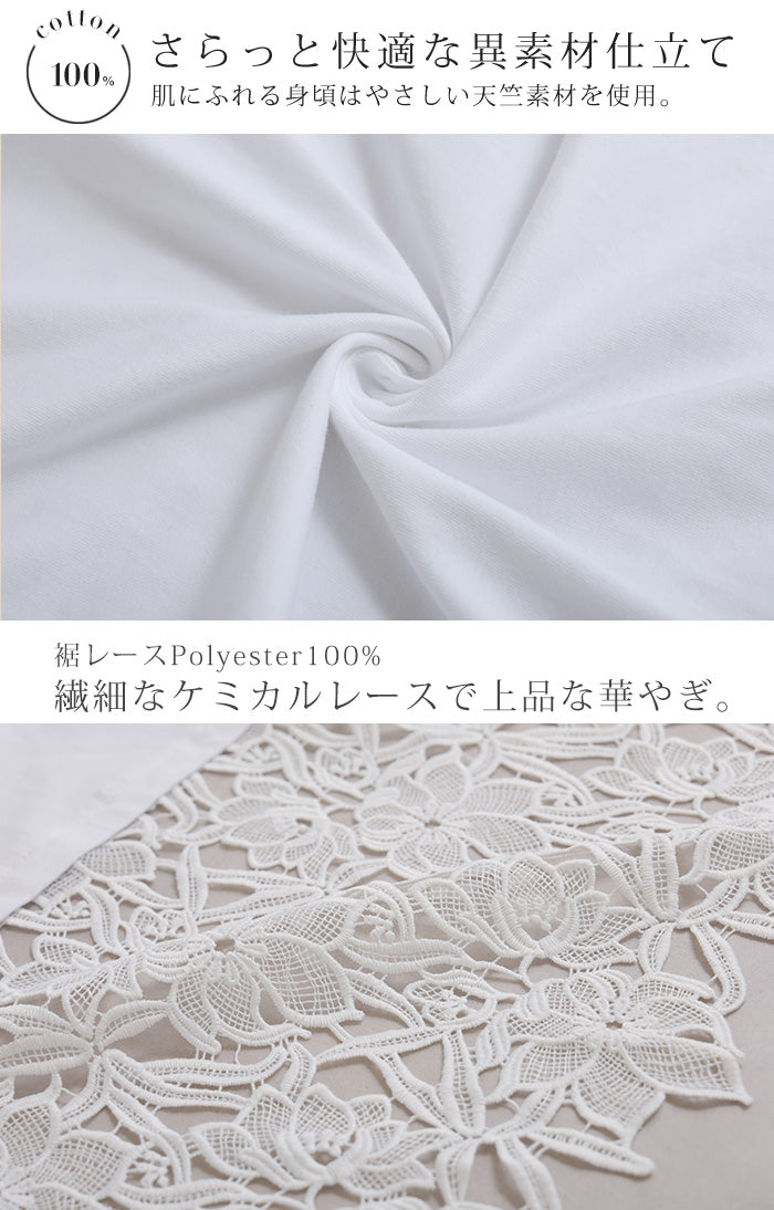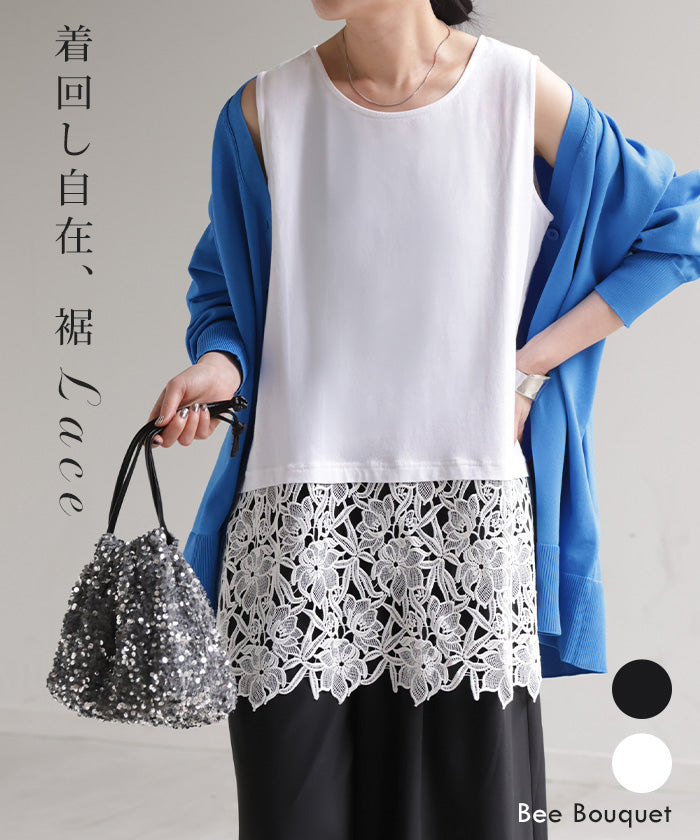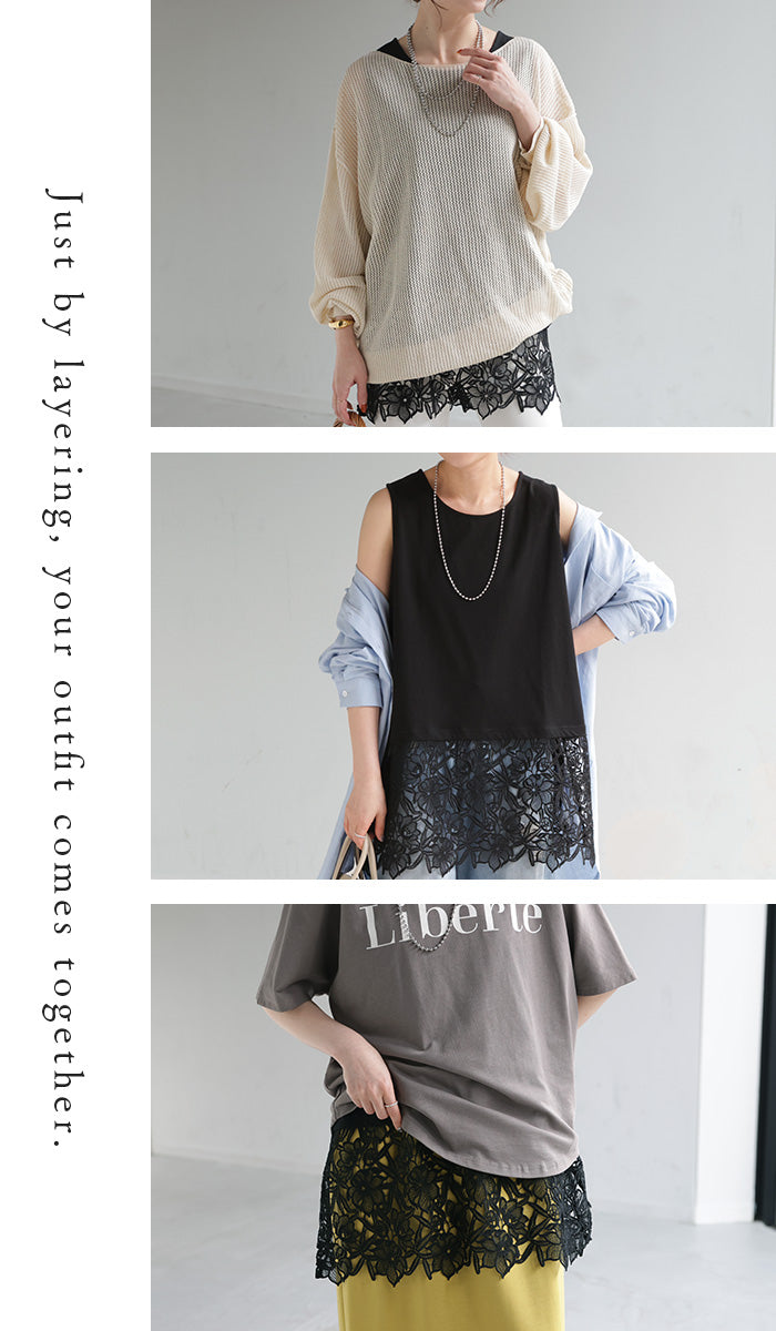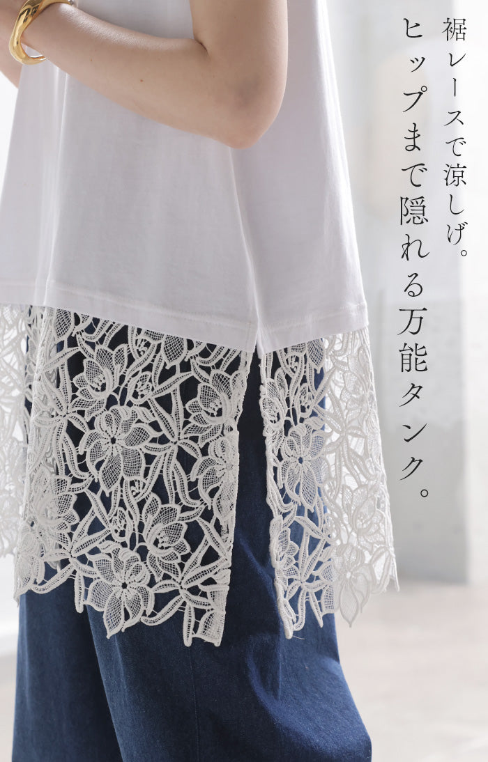 タンクトップ インナー レース 花柄 レディース トップス タンク キャミソール クルーネック レイヤード スリット 裾レース 綿 異素材MIX 花柄レース 重ね 柔らかい 着回し ゆったり 体型カバー 大きいサイズ カジュアル きれいめ お尻隠れる 黒 白 ビーブーケ