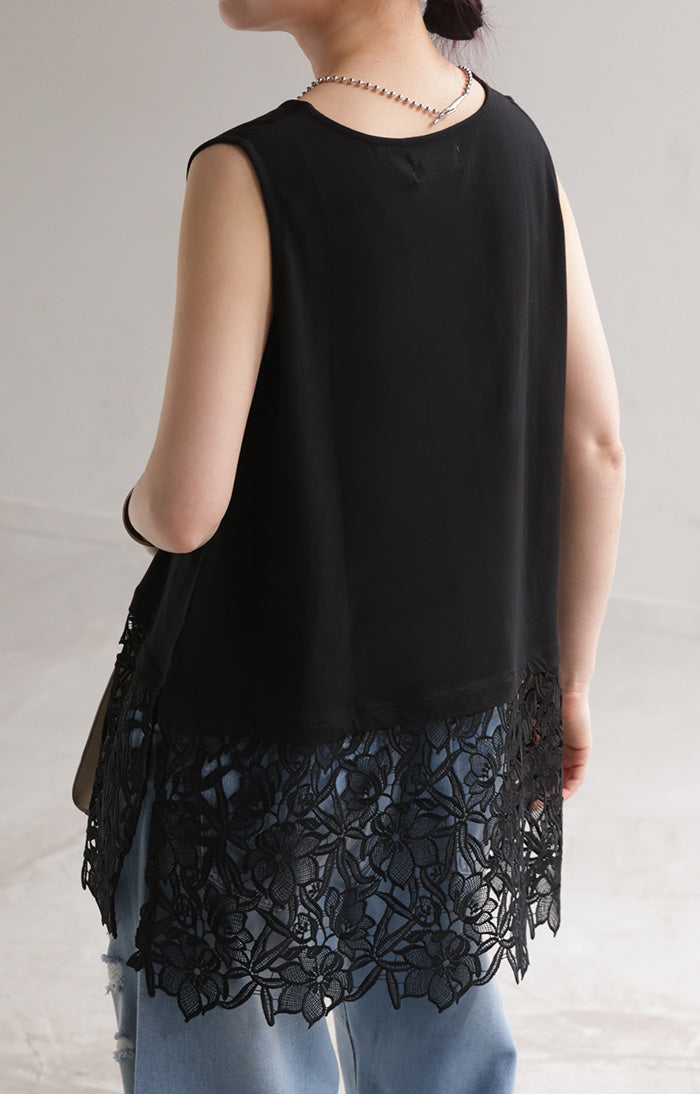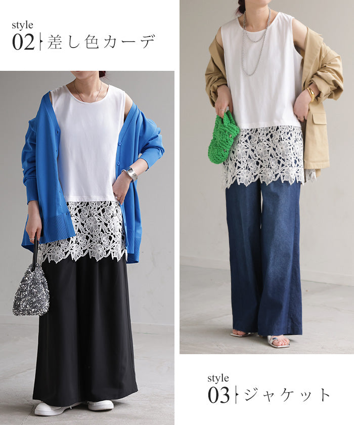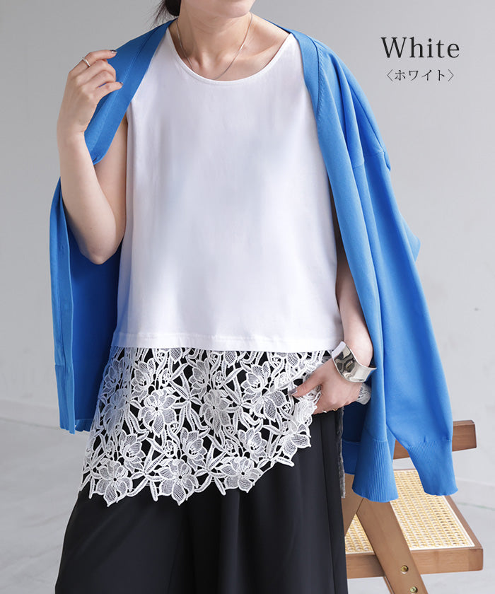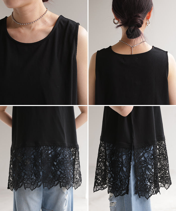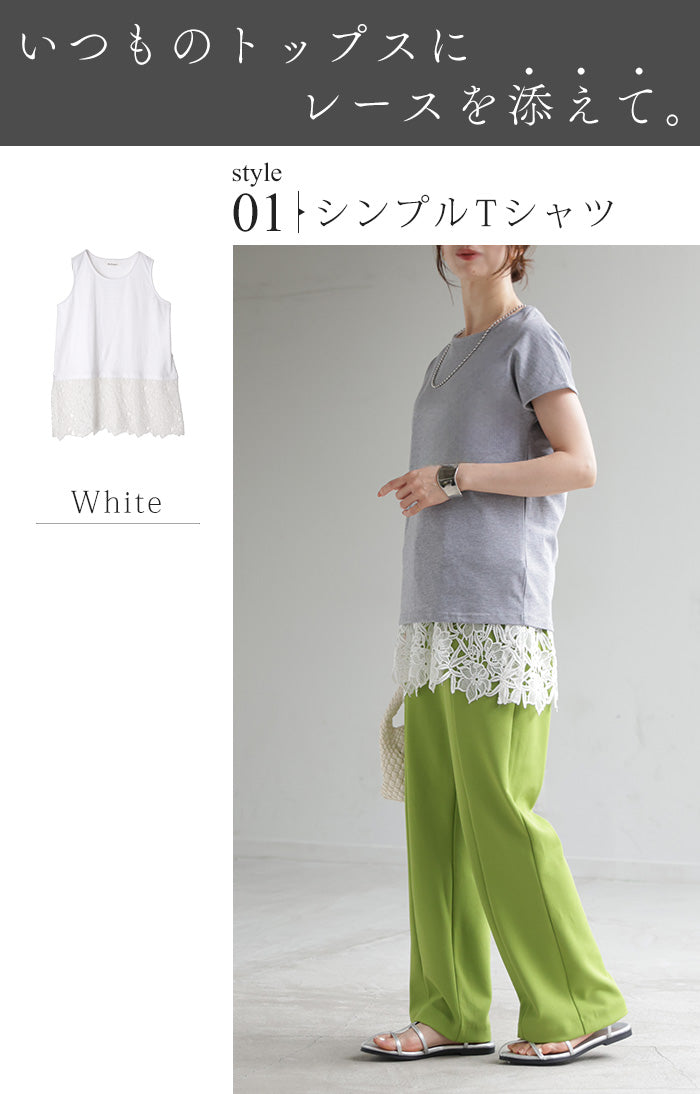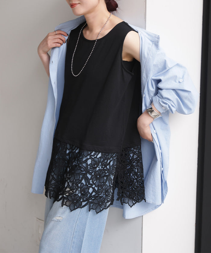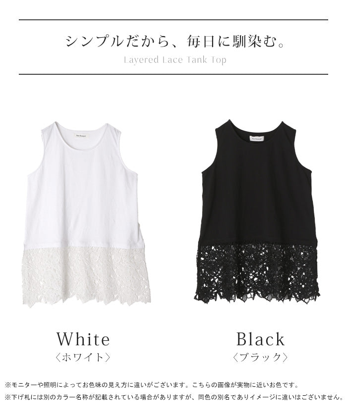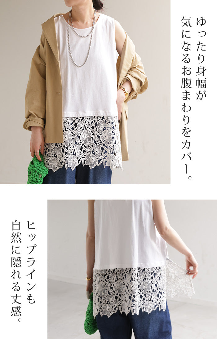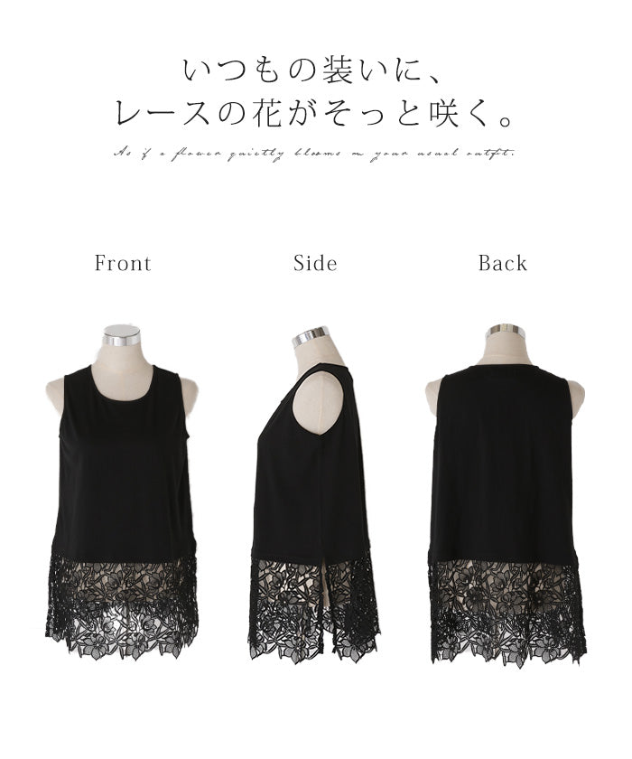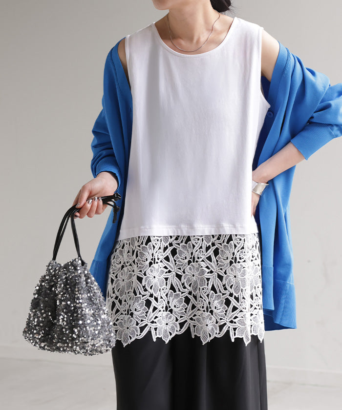 ドッキングデザインで華やかな印象の裾レースタンクトップです。