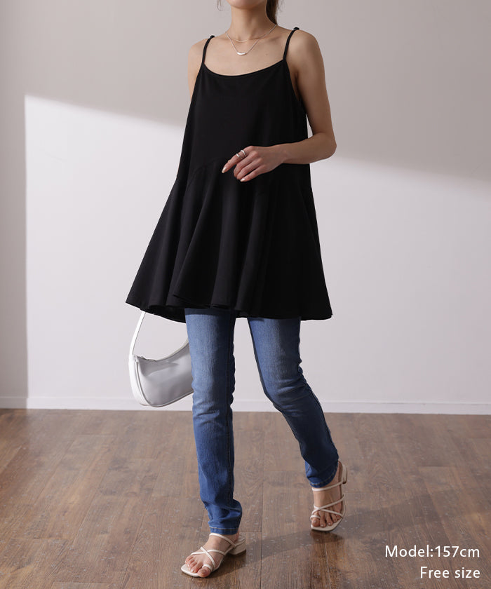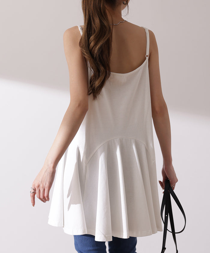 ペプラムシルエットが華やな印象のキャミソールトップスです。ウエストから広がるフレアなラインで女性らしさがグッとアップします。華奢な肩紐と高めのウエスト切り替えで細見え効果もあります。