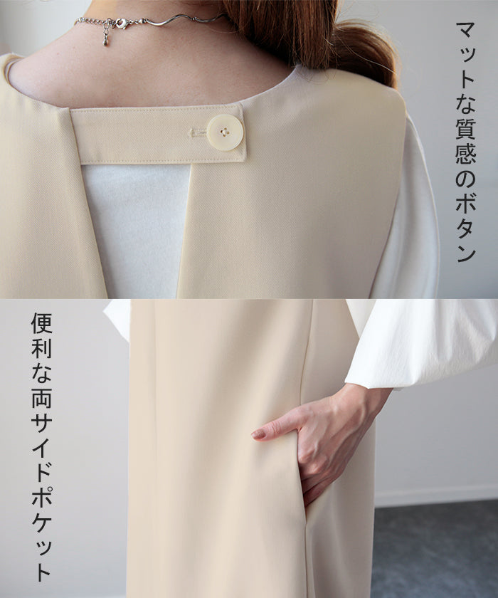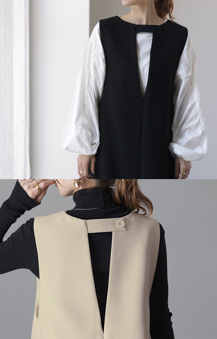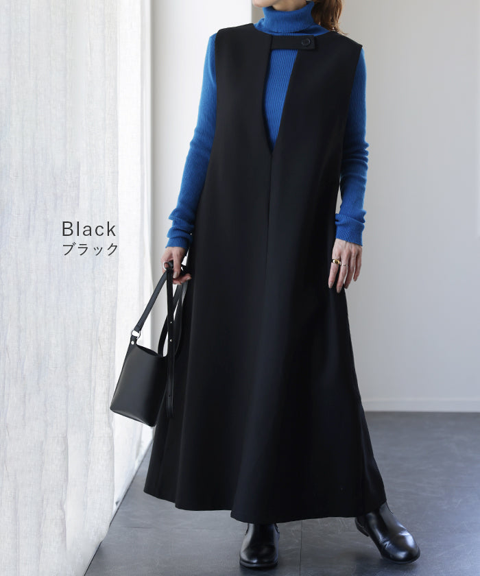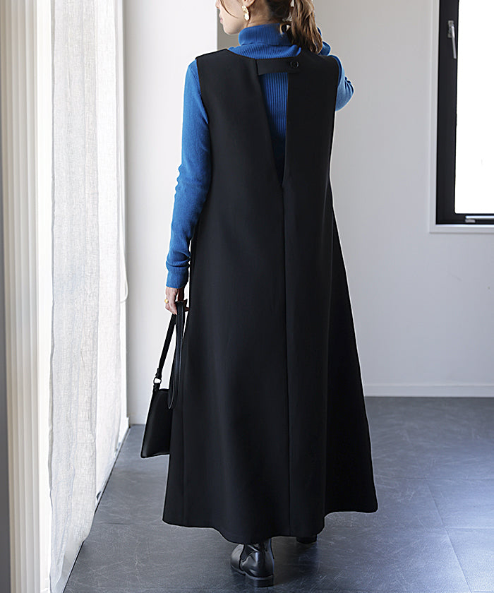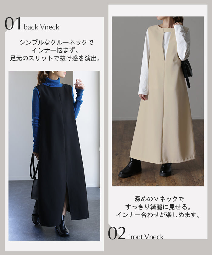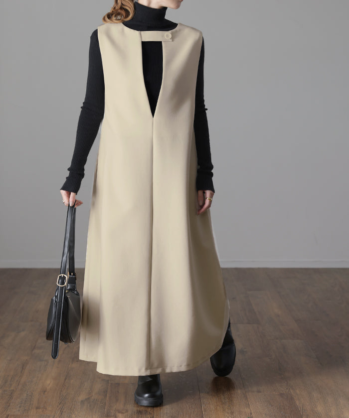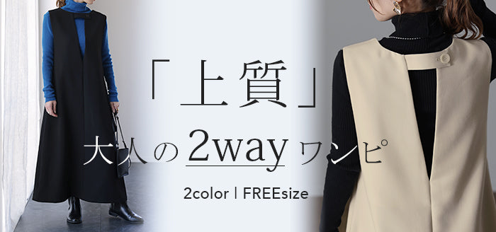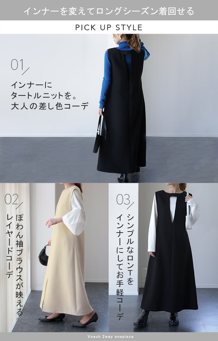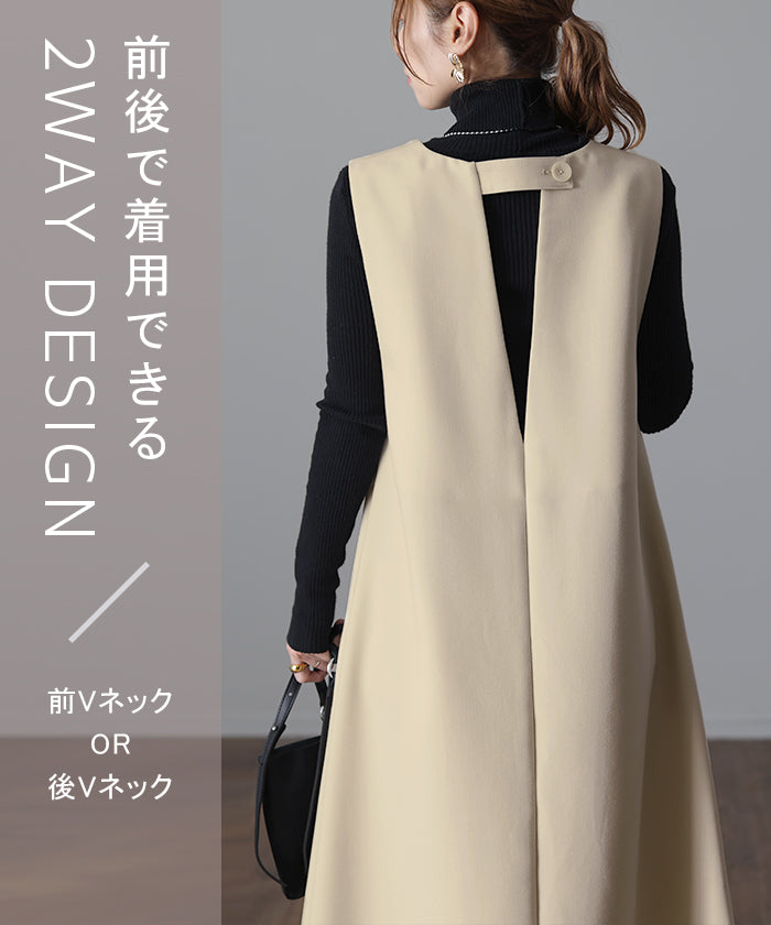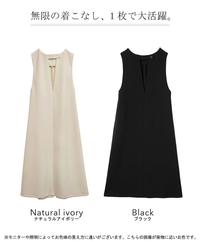 大人の女性らしさを演出するノースリーブワンピースです。前後2WAY仕様なので気分によって変化を付けたスタイリングが可能。インナー次第でもガラッと雰囲気の変わるオールマイティーな1枚です。
