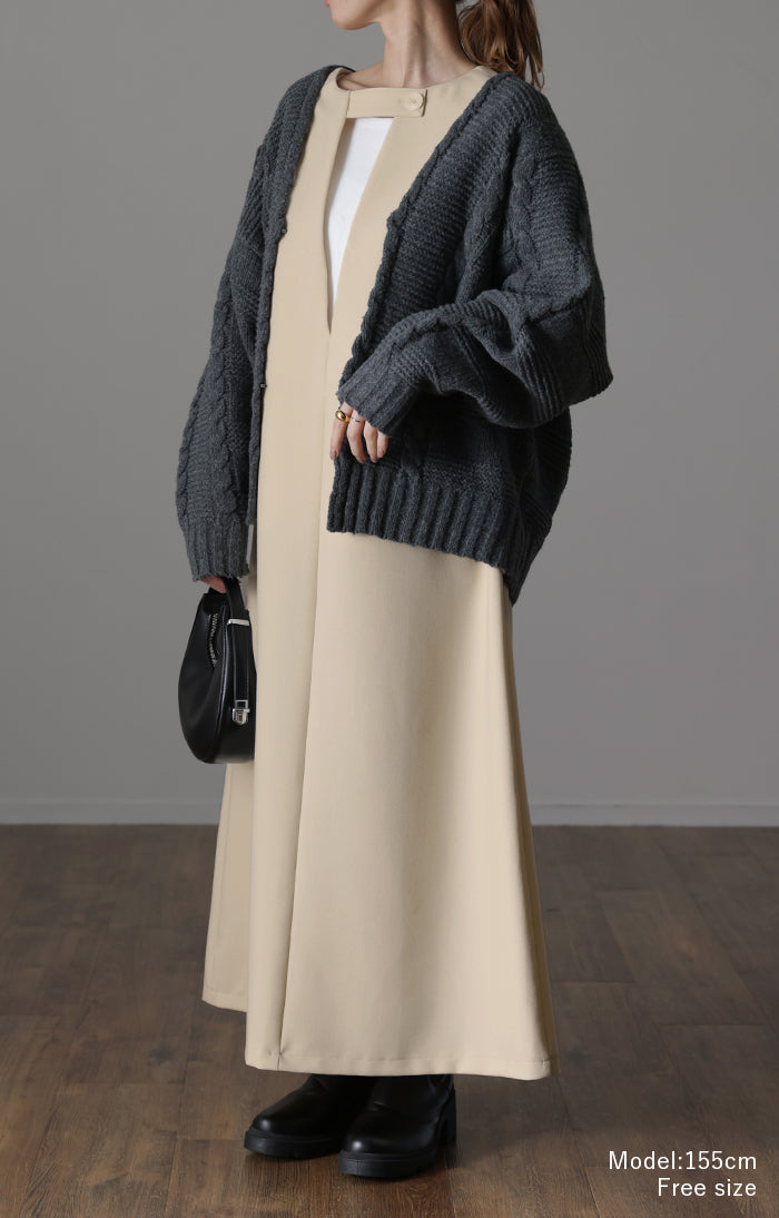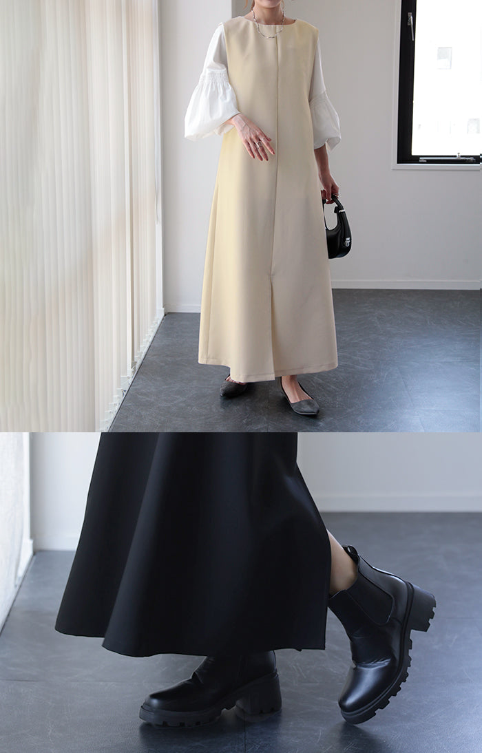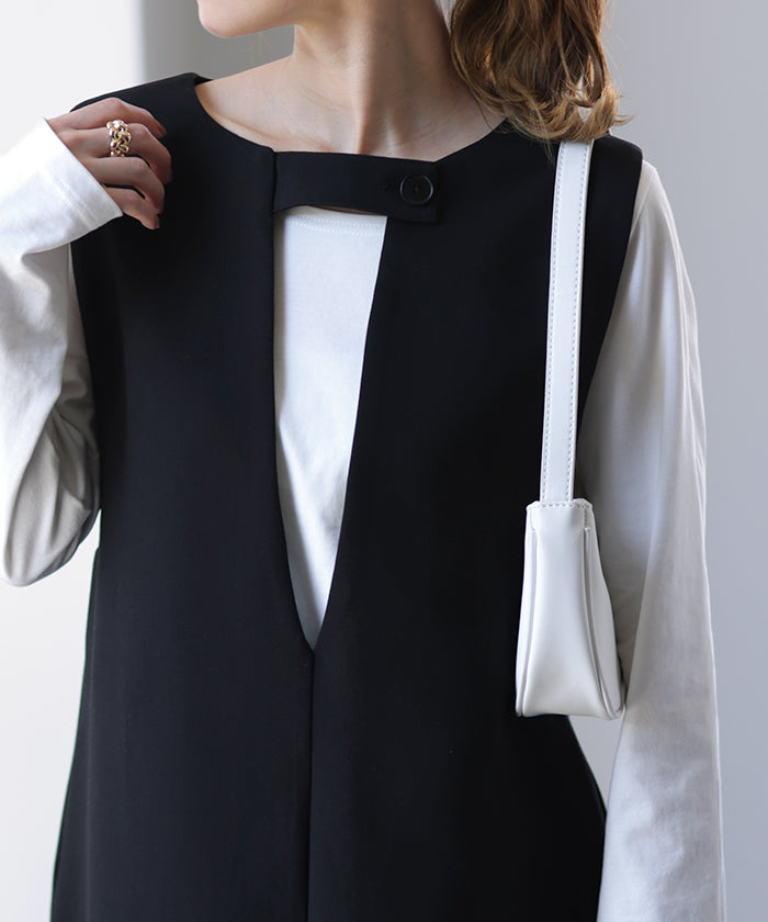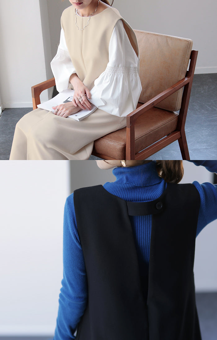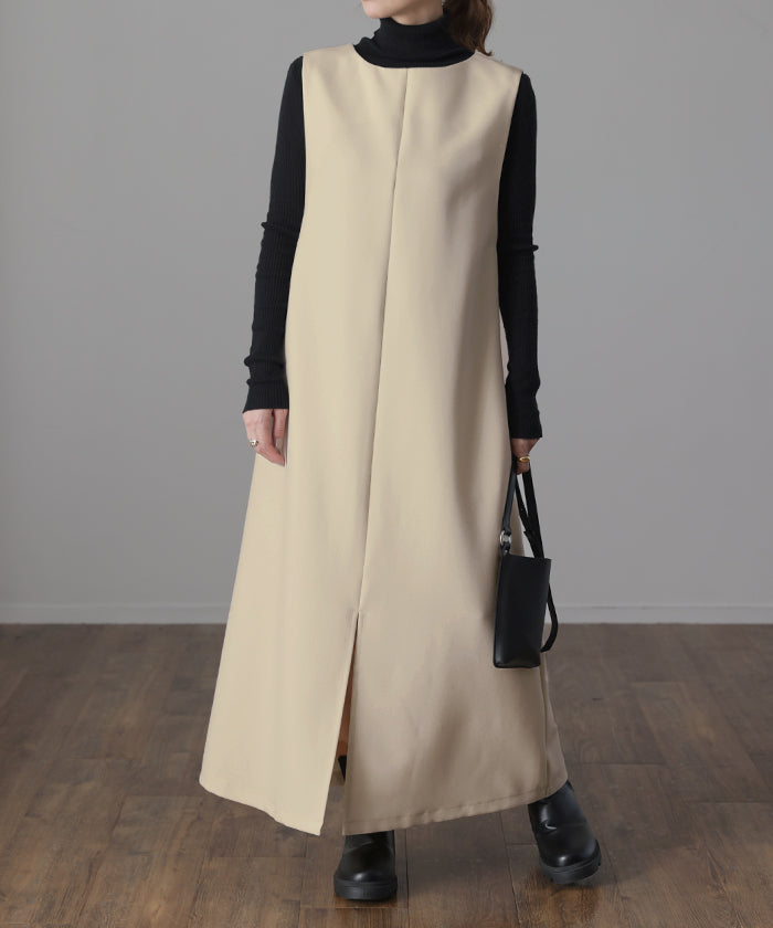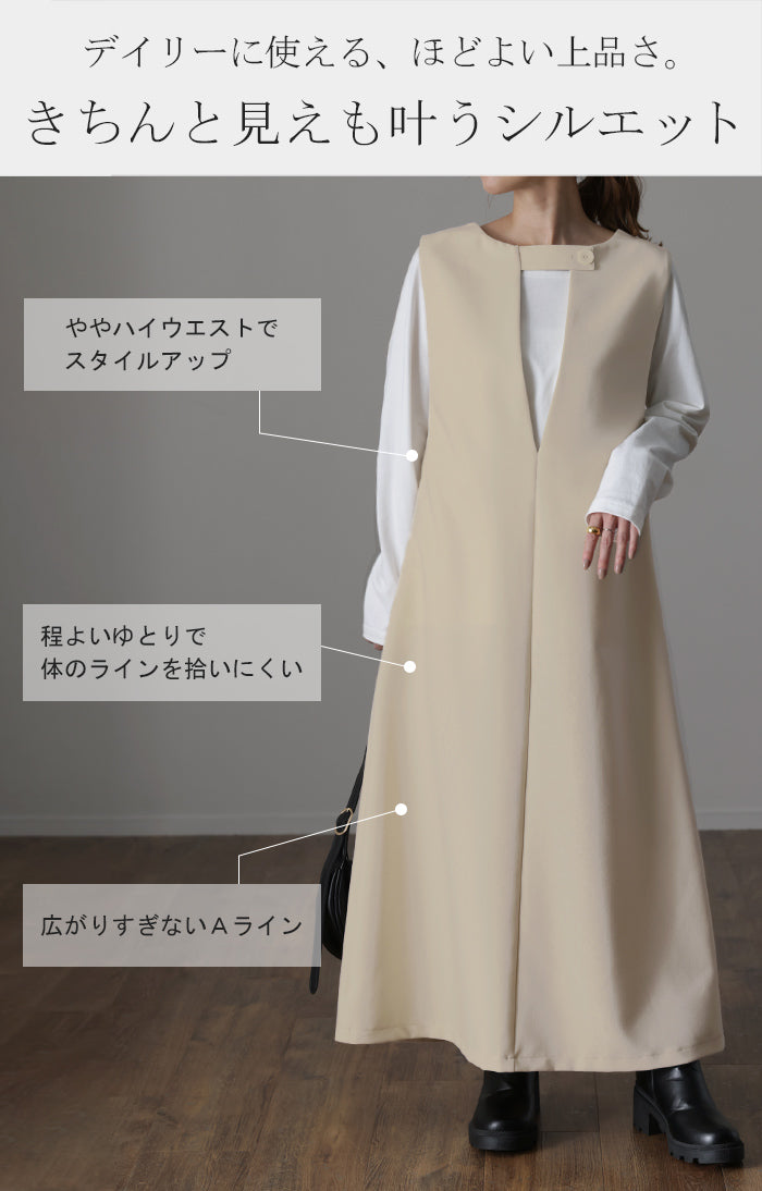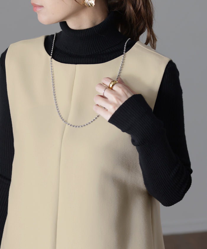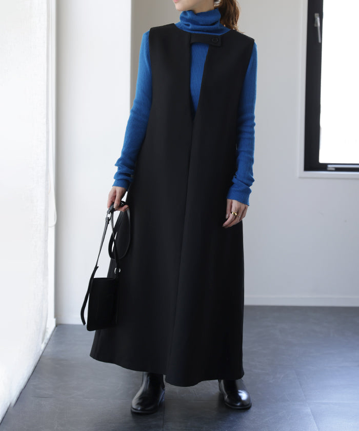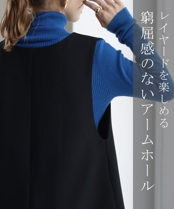 大人の女性らしさを演出するノースリーブワンピースです。前後2WAY仕様なので気分によって変化を付けたスタイリングが可能。インナー次第でもガラッと雰囲気の変わるオールマイティーな1枚です。