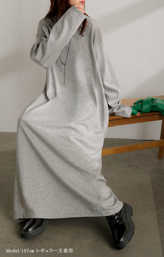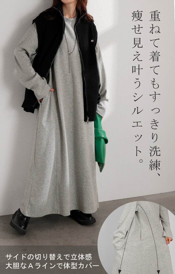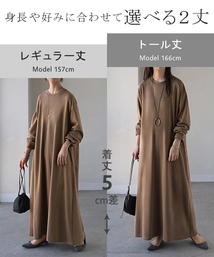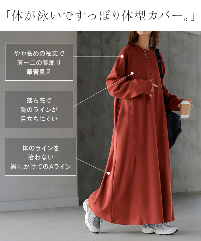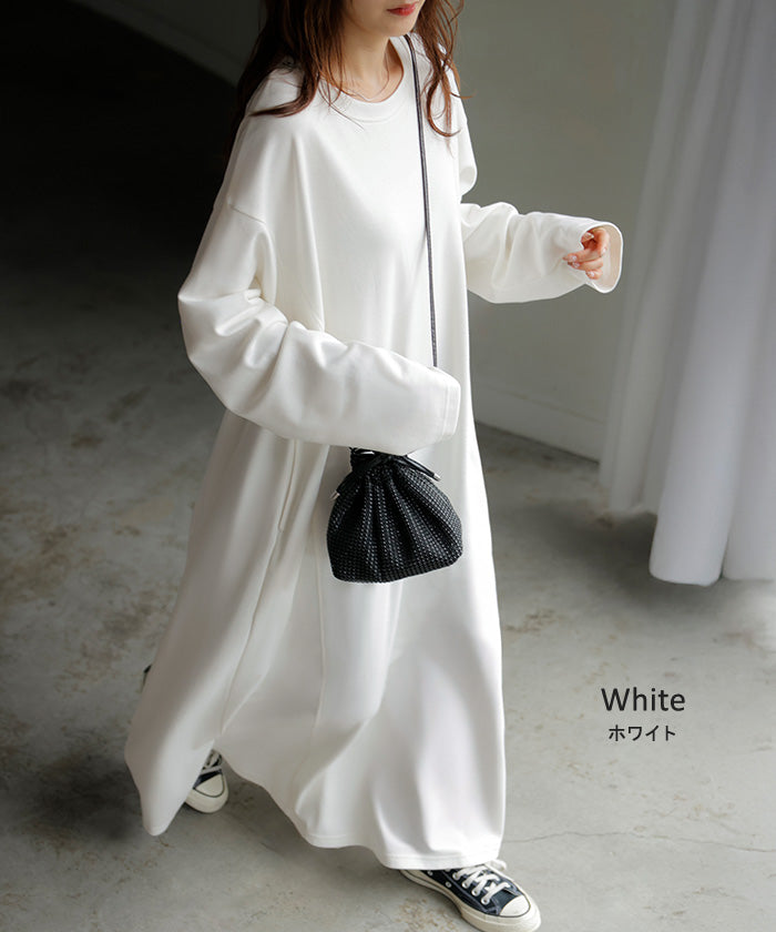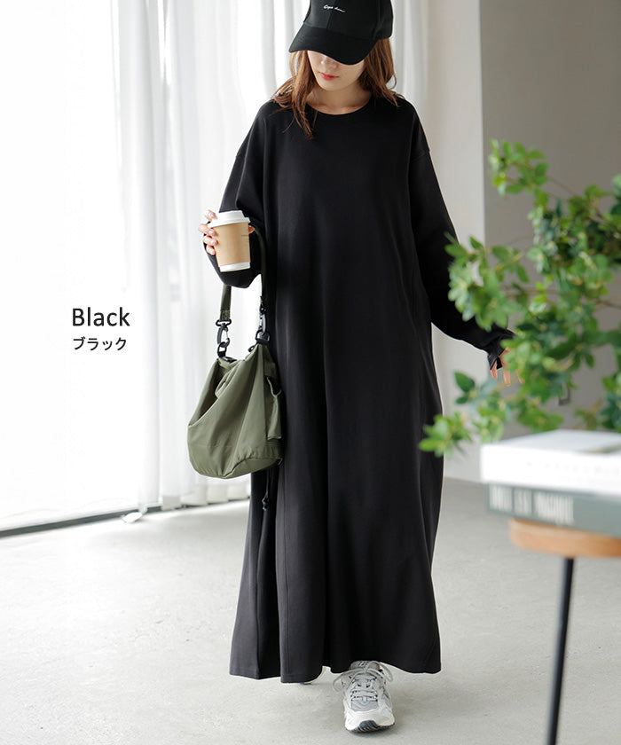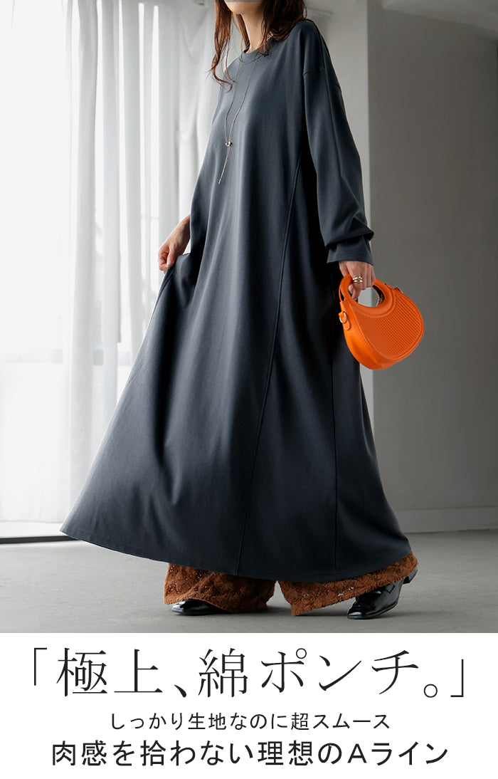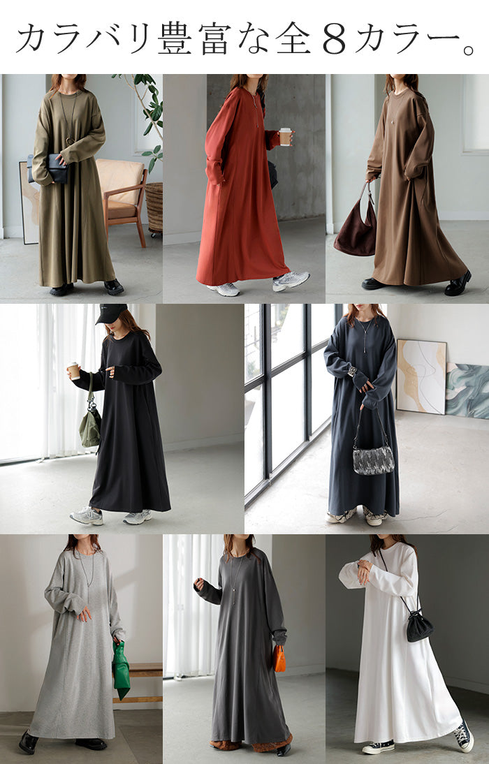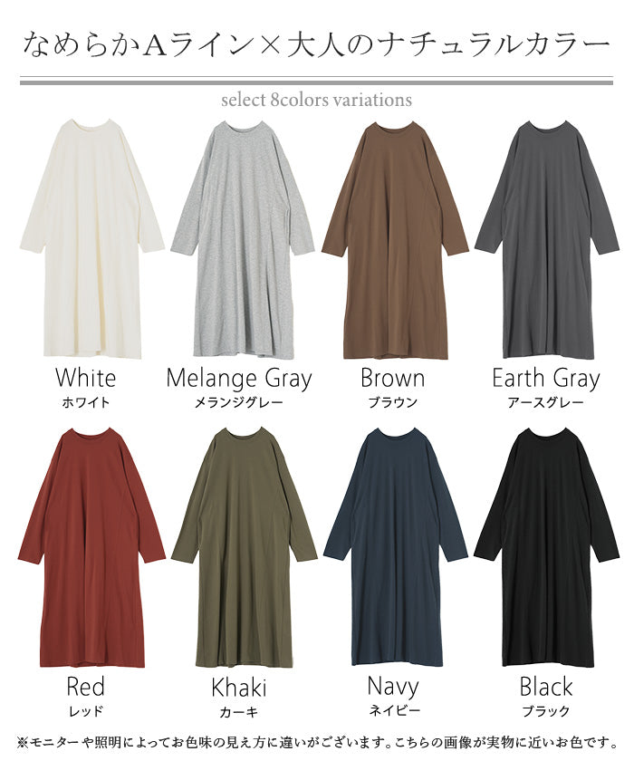 2025AW新作 ワンピ ロング ポンチ 防汚 " 選べる 2丈 " レディース ロンT ロングワンピース カットソー コットンポンチ Aライン マキシ マキシワンピース ロングワンピ クルーネック カラバリ ストレッチ カジュアル 高身長 長袖 大きいサイズ 無地 黒 白 秋 冬 HUG.U
