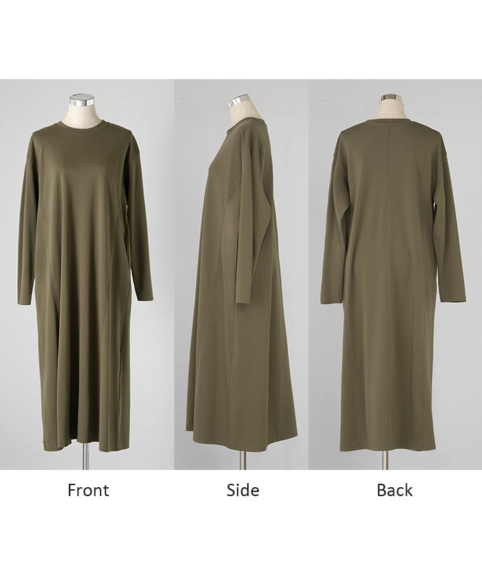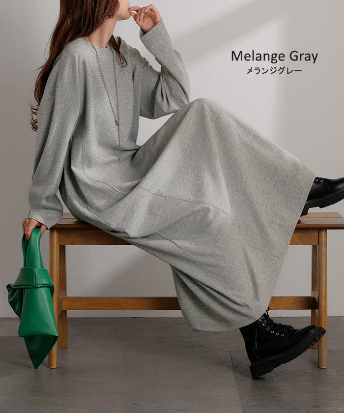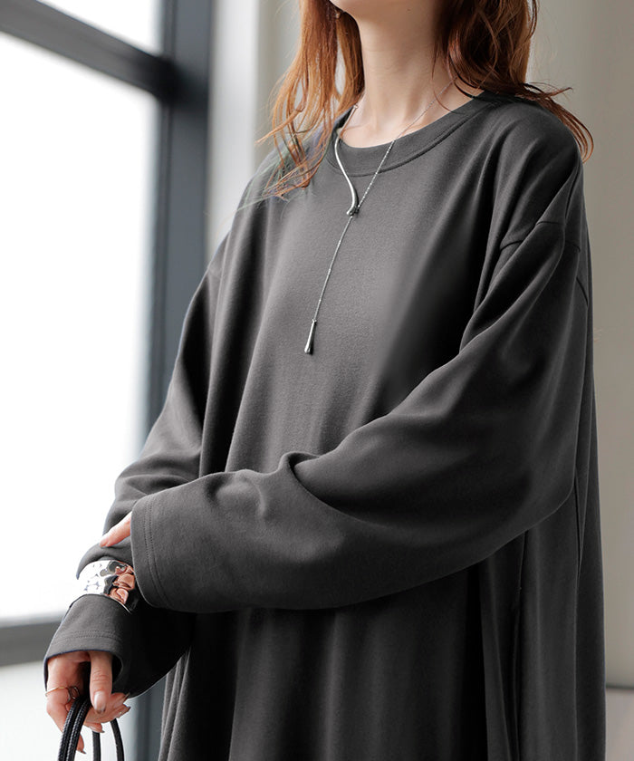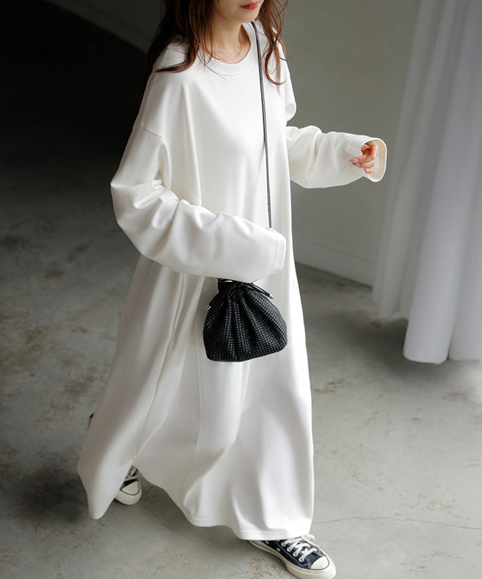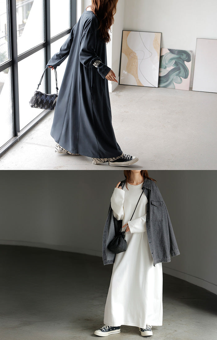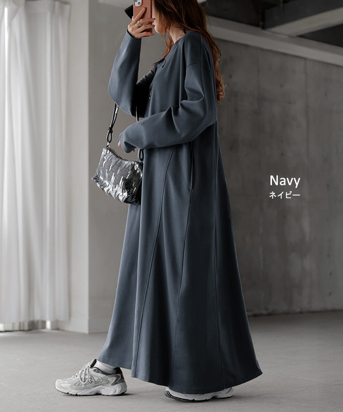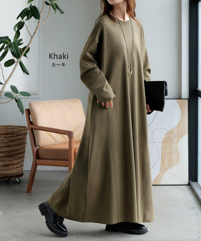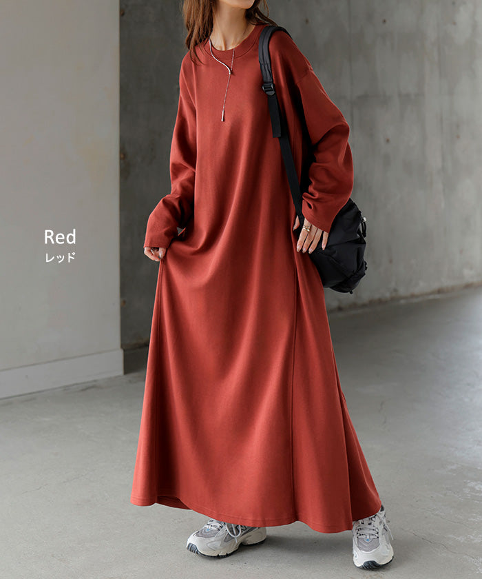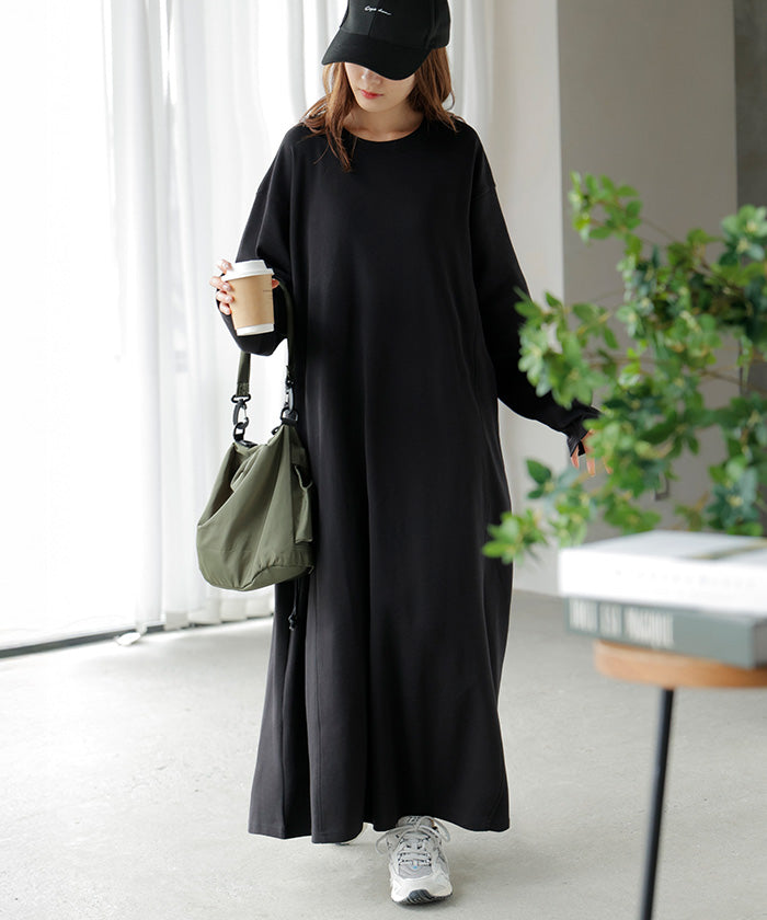 2025AW新作 ワンピ ロング ポンチ 防汚 " 選べる 2丈 " レディース ロンT ロングワンピース カットソー コットンポンチ Aライン マキシ マキシワンピース ロングワンピ クルーネック カラバリ ストレッチ カジュアル 高身長 長袖 大きいサイズ 無地 黒 白 秋 冬 HUG.U