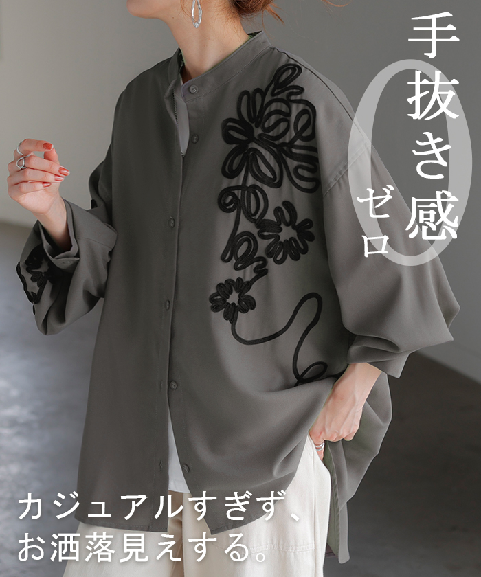 シャツ コード刺繍 シアー トップス レディース 刺繍 ノーカラー バンドカラー ブラウス ロング ロングシャツ チュニック 長袖 無地 羽織 ライトアウター 上品 きれいめ ゆったり 大きいサイズ 体型カバー お尻が隠れる 黒 ベージュ 春 夏 HUG.U メール便