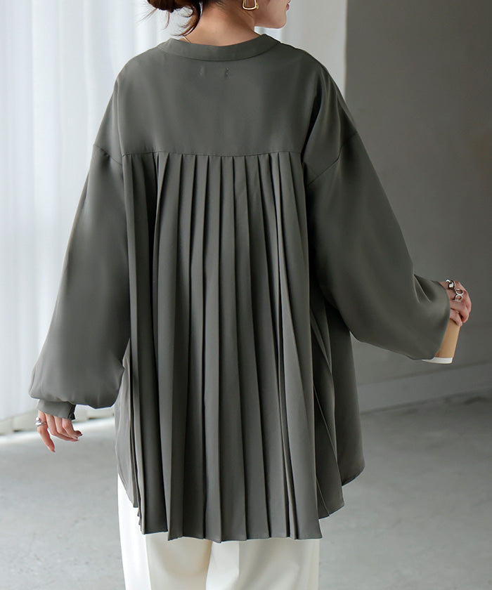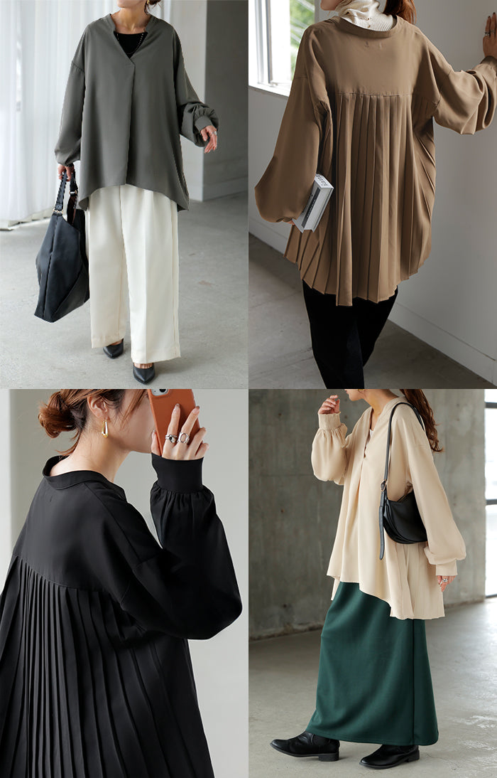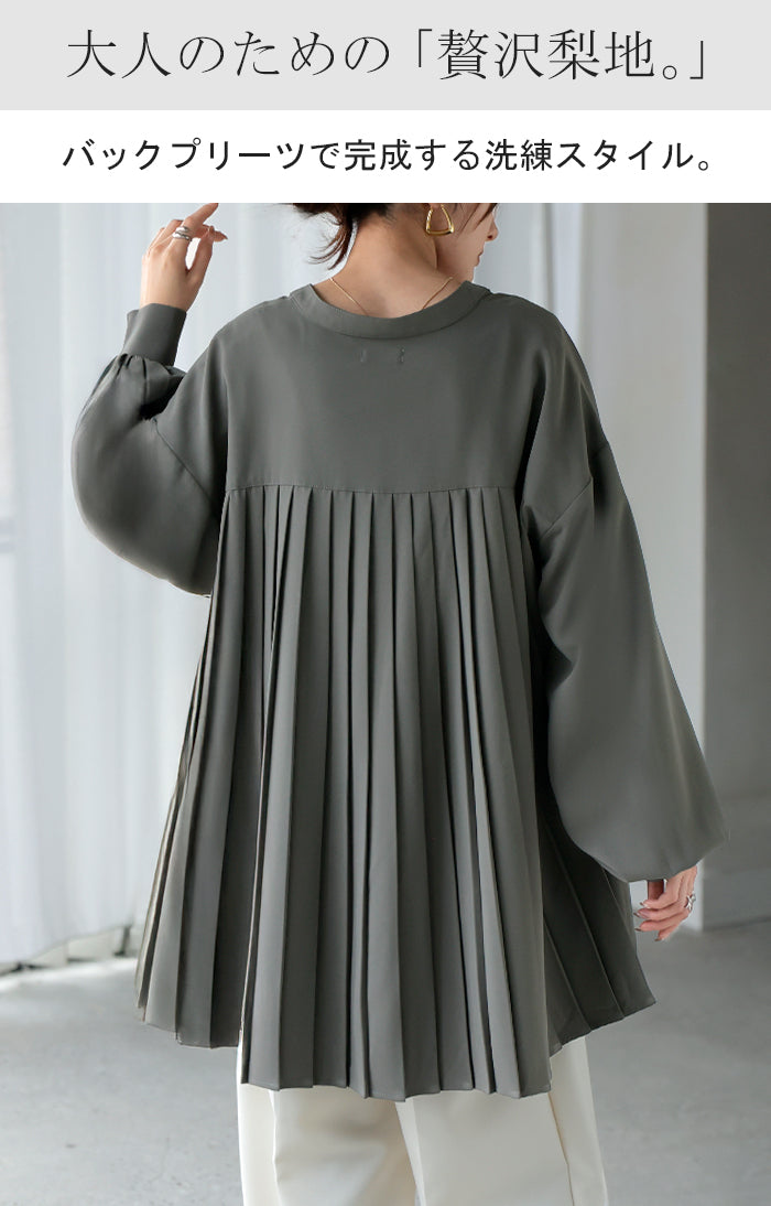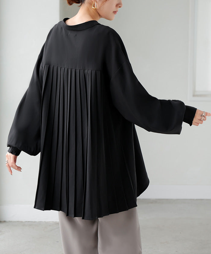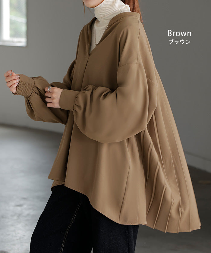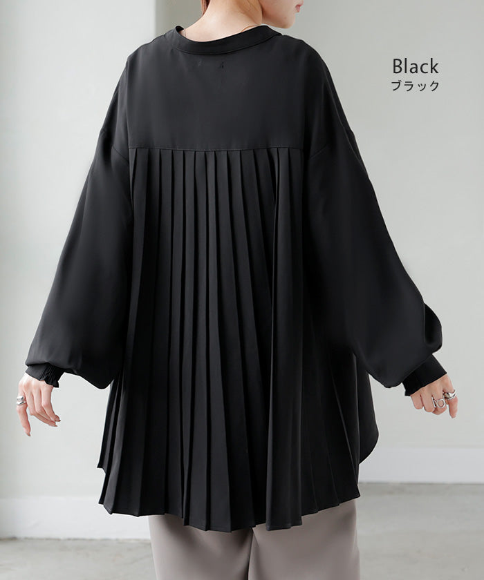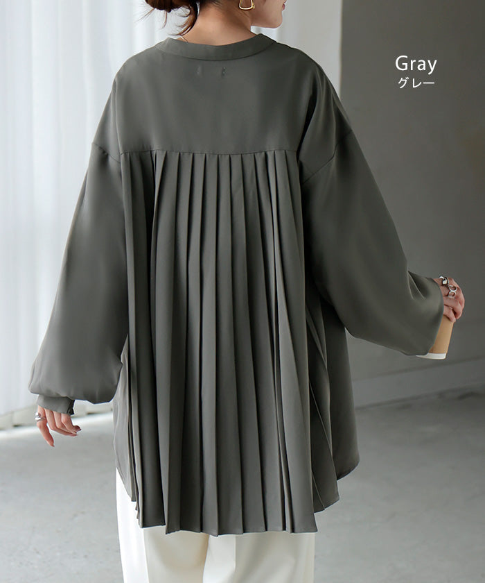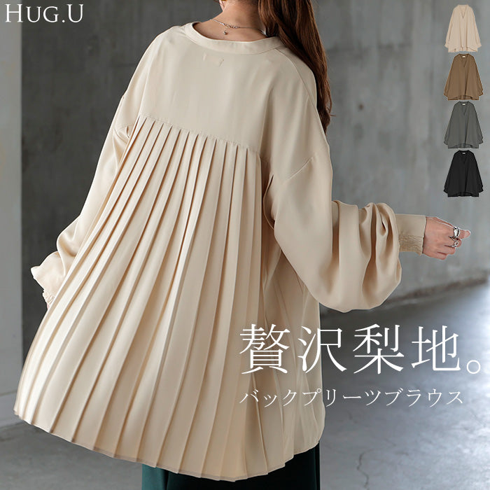 2025AW新作 シャツ バックプリーツ ■11月下旬入荷 ブラウス レディース トップス ロング ロングシャツ プルオーバー スキッパー プリーツ ボリュームスリーブ チュニック フリル 長袖 無地 きれいめ ゆったり 大きいサイズ 体型カバー お尻が隠れる 黒 グレー 秋 冬 HUG.U