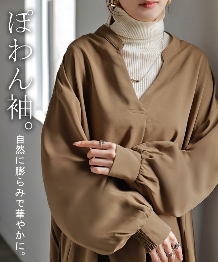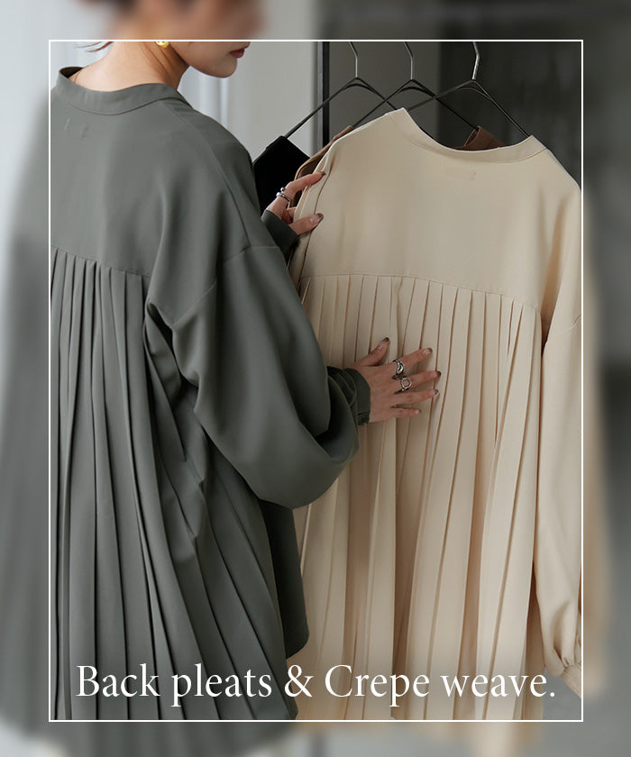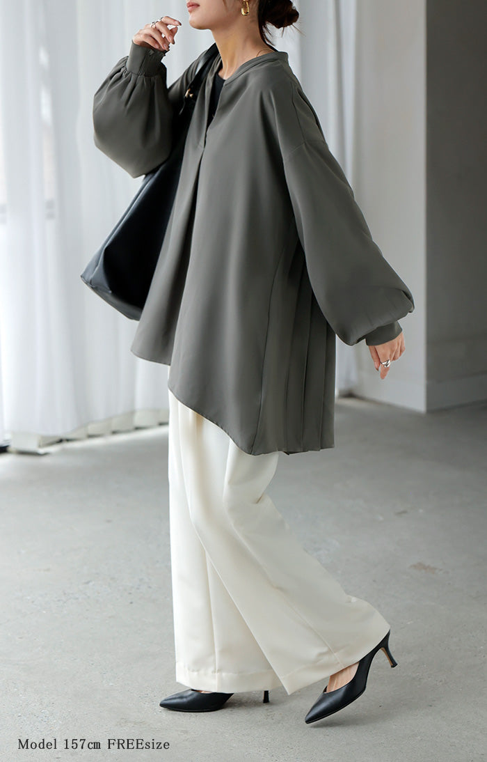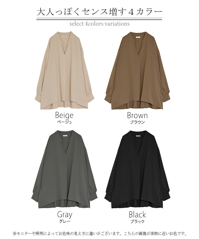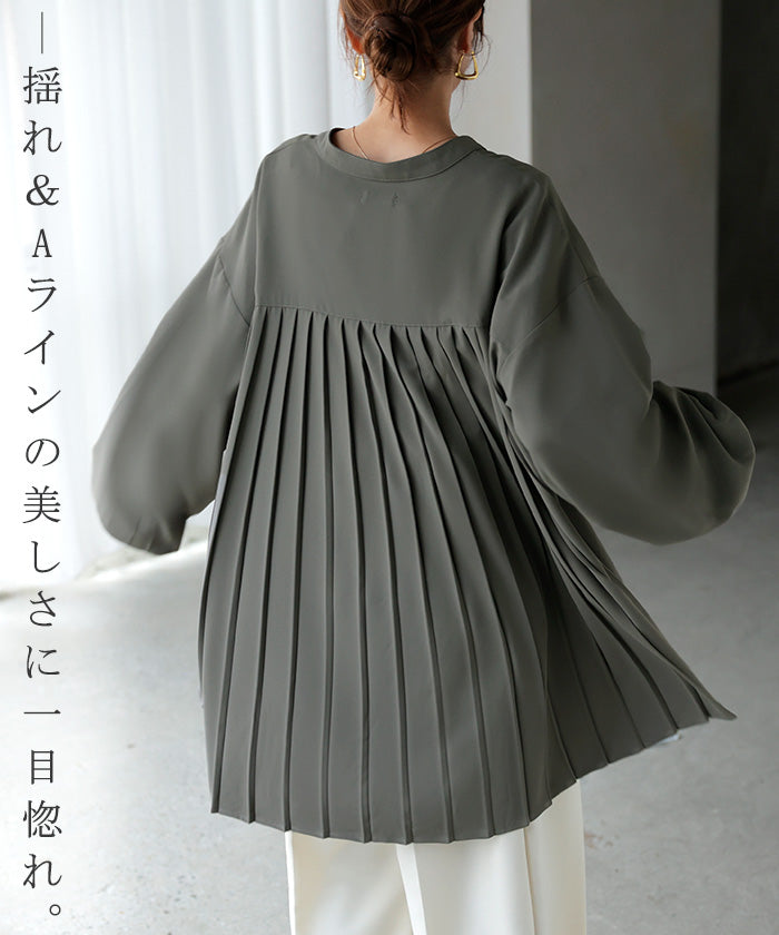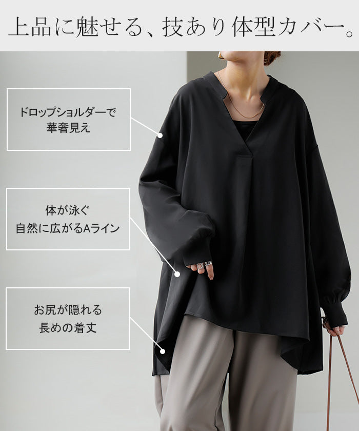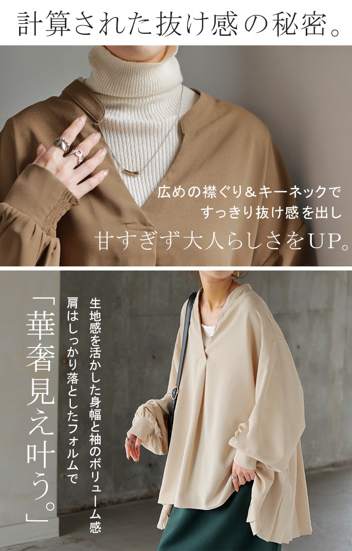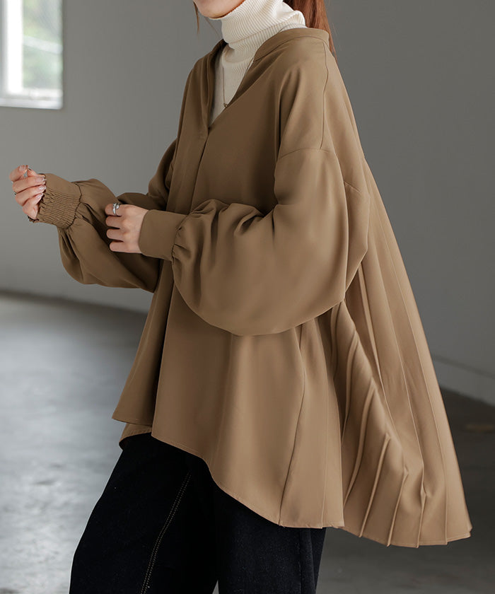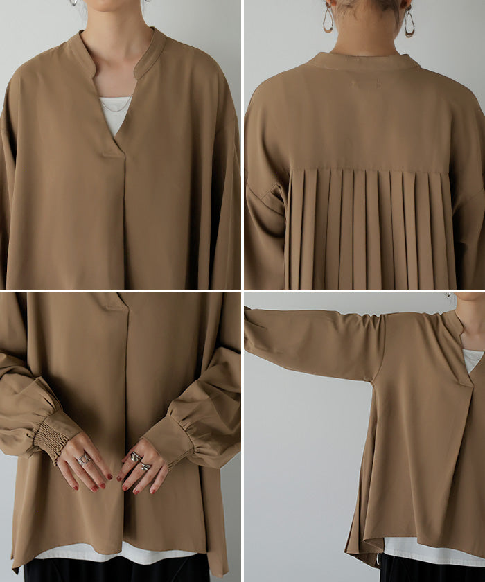 2025AW新作 シャツ バックプリーツ ■11月下旬入荷 ブラウス レディース トップス ロング ロングシャツ プルオーバー スキッパー プリーツ ボリュームスリーブ チュニック フリル 長袖 無地 きれいめ ゆったり 大きいサイズ 体型カバー お尻が隠れる 黒 グレー 秋 冬 HUG.U