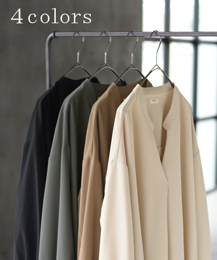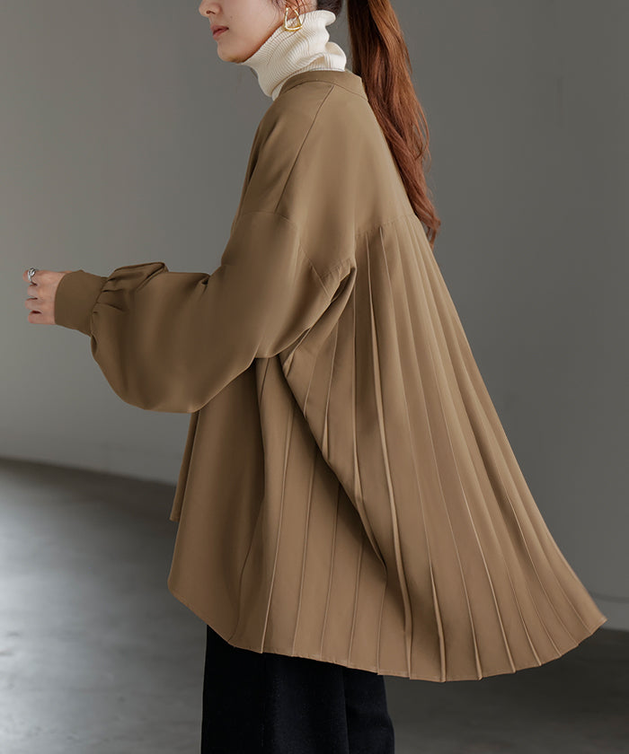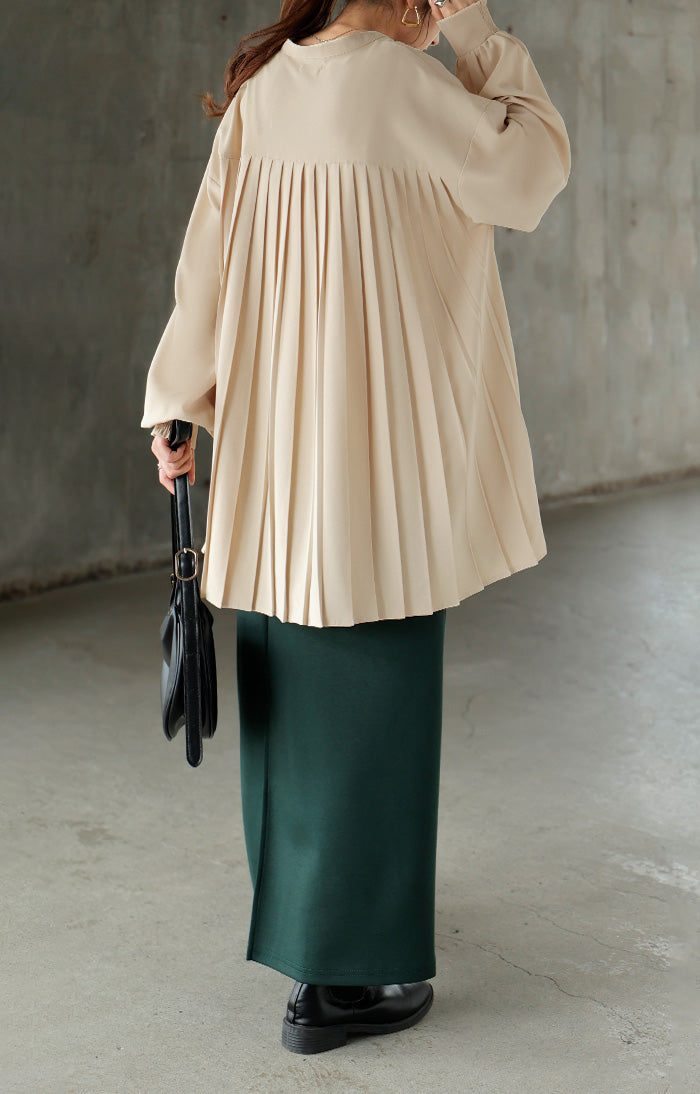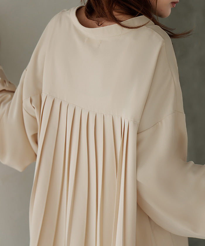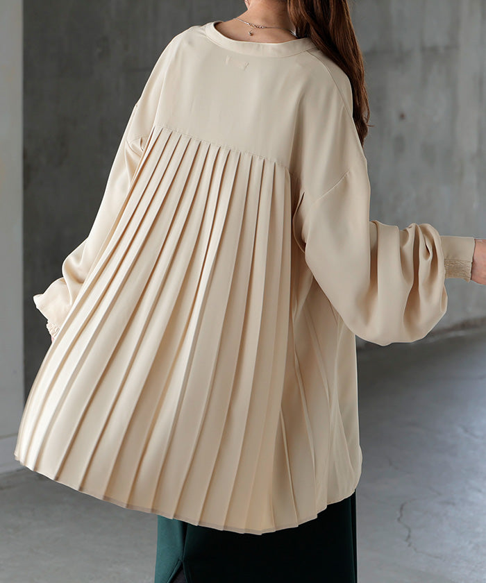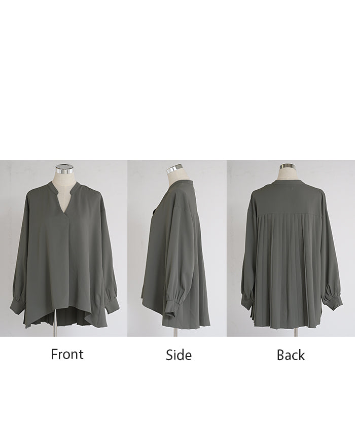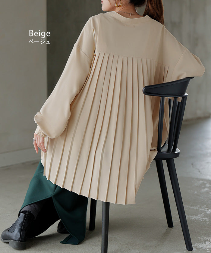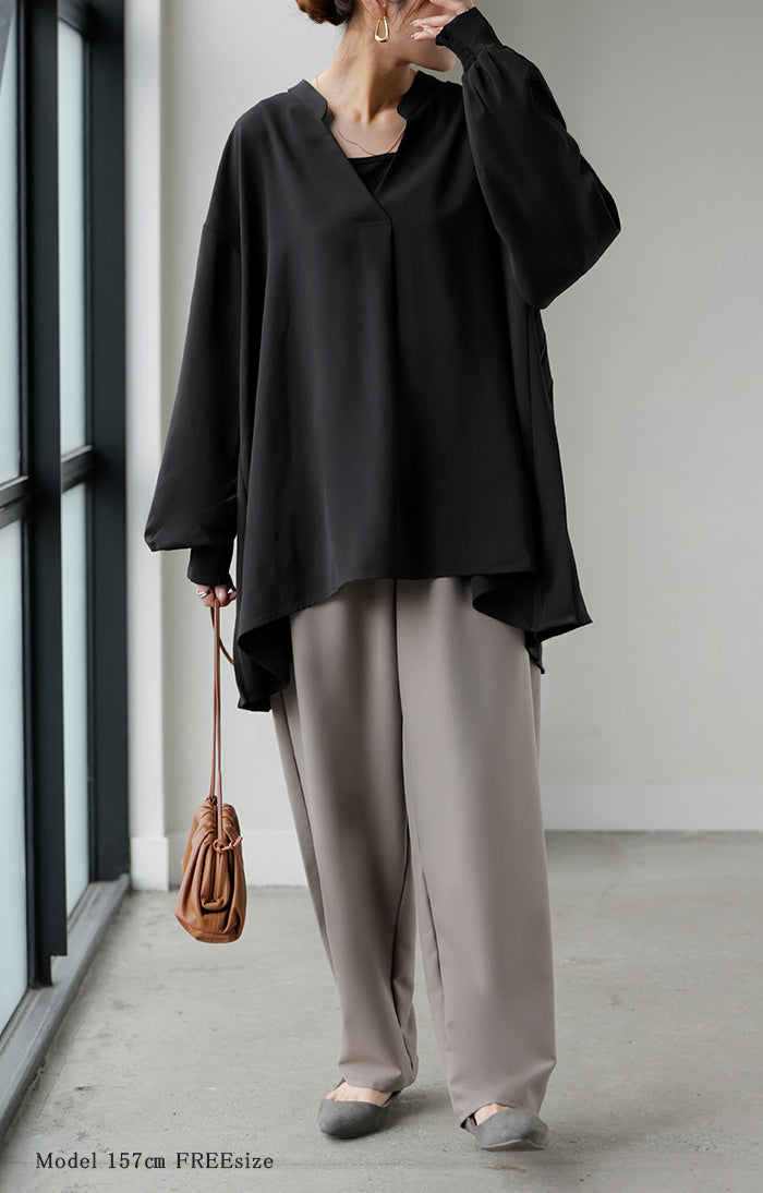 2025AW新作 シャツ バックプリーツ ■11月下旬入荷 ブラウス レディース トップス ロング ロングシャツ プルオーバー スキッパー プリーツ ボリュームスリーブ チュニック フリル 長袖 無地 きれいめ ゆったり 大きいサイズ 体型カバー お尻が隠れる 黒 グレー 秋 冬 HUG.U