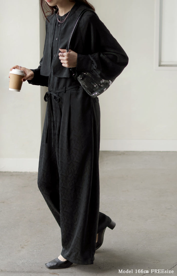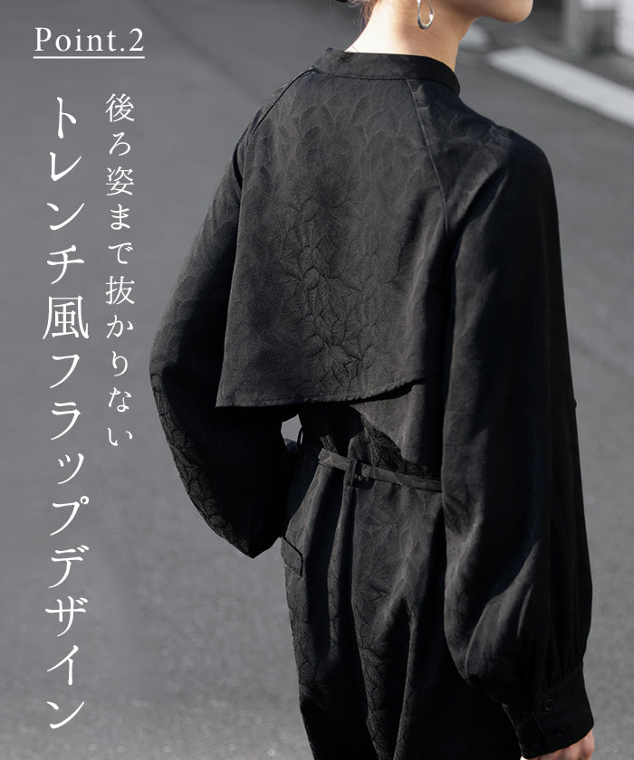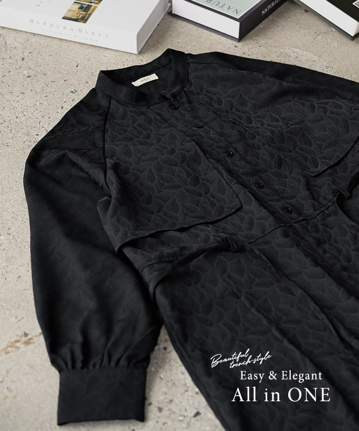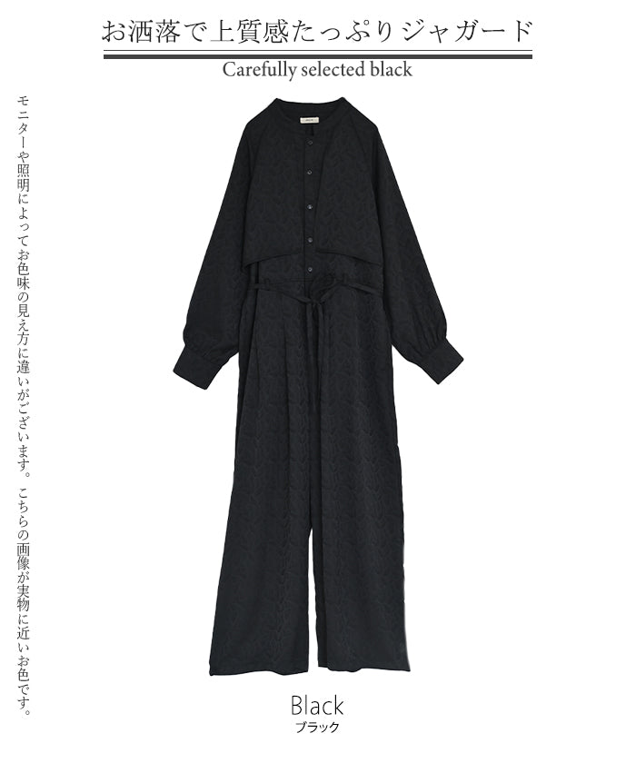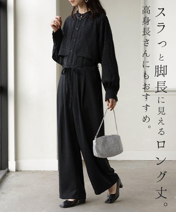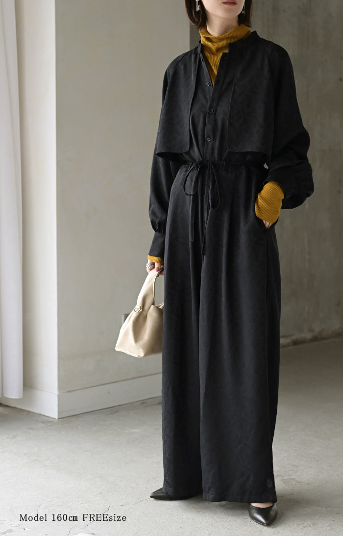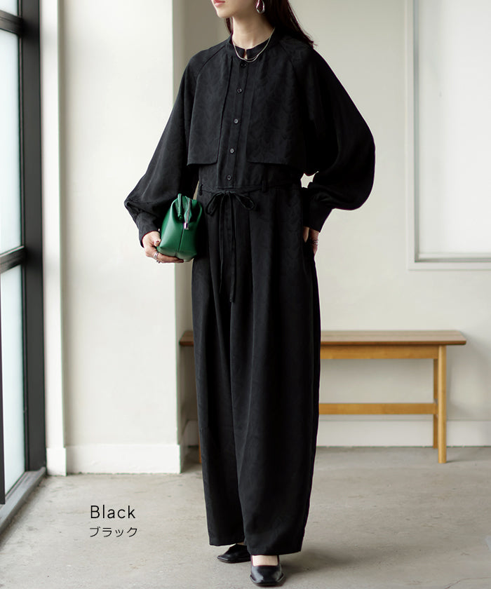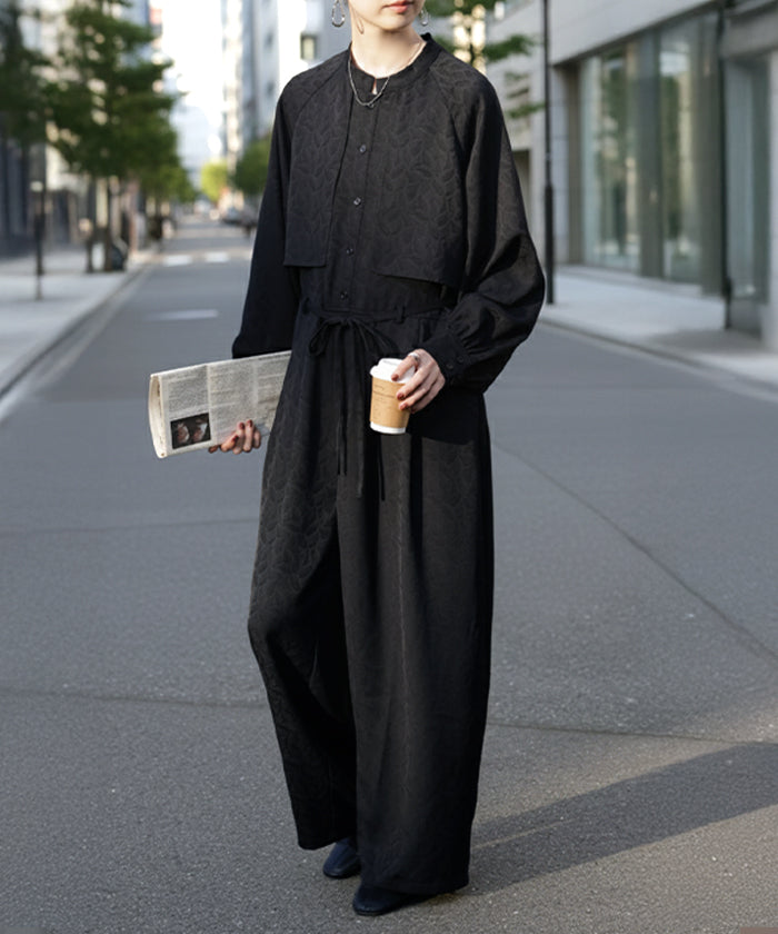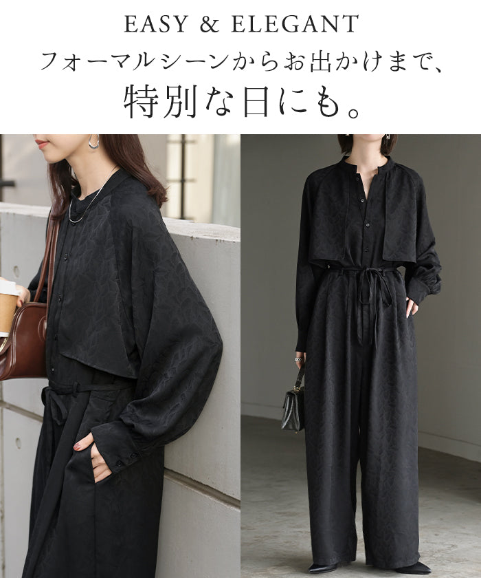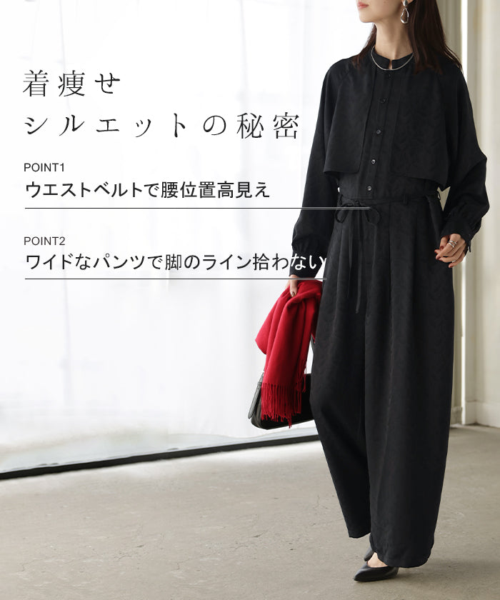 2025AW新作 オールインワン ■11月中旬入荷 ジャンプスーツ イージーケア レディース パンツ ロング ロングパンツ ジャガード シワになりにくい トレンチ クルーネック 総柄 ボタニカル柄 つなぎ ゆったり きれいめ 大きいサイズ 体型カバー オケージョン 黒 ブラック 秋 冬 HUG.U