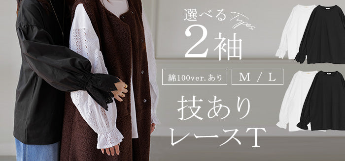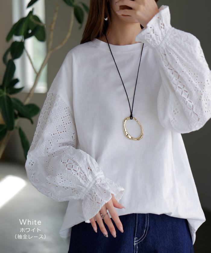 2025AW新作 ロンT レース " 選べる デザイン " レディース トップス 長袖 綿100 Tシャツ カットソー ロング ティーシャツ 異素材 ドッキング クルーネック ドルマン ボリュームスリーブ ゆったり 無地 体型カバー お尻が隠れる 大きいサイズ おしゃれ 白 黒 秋 冬 HUG.U メール便