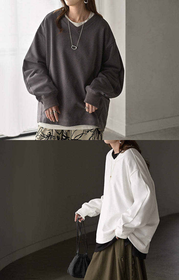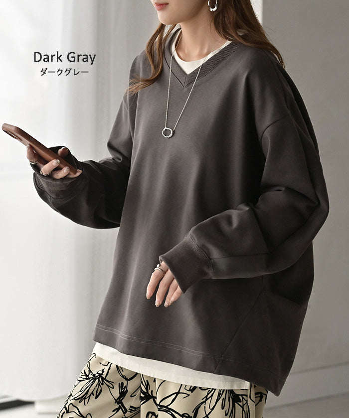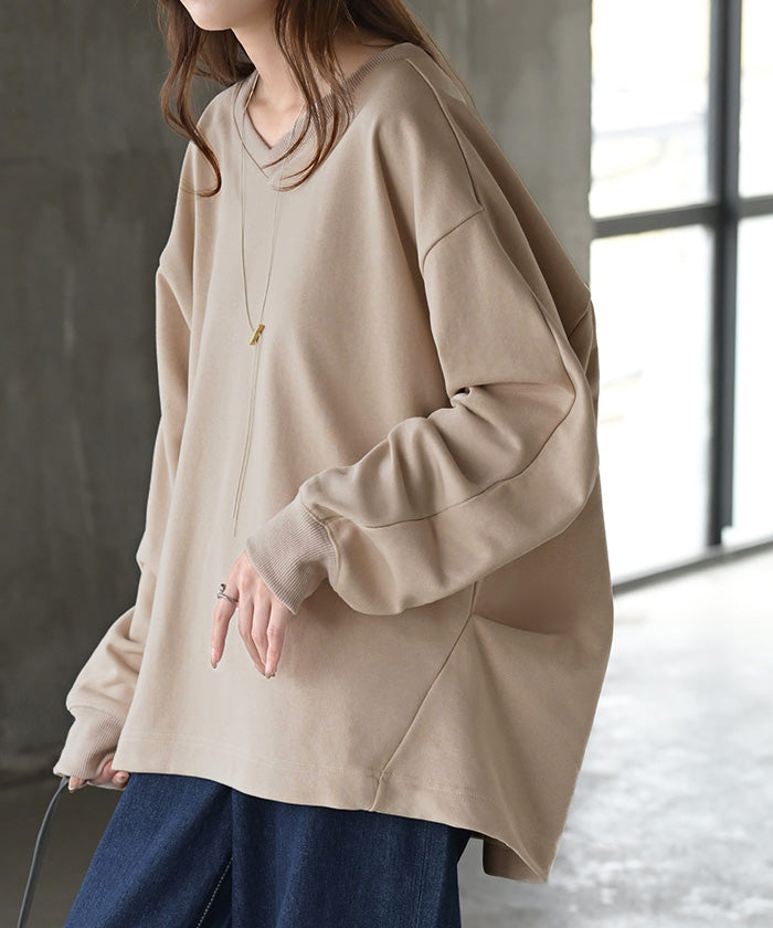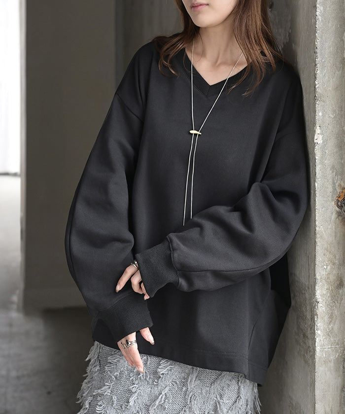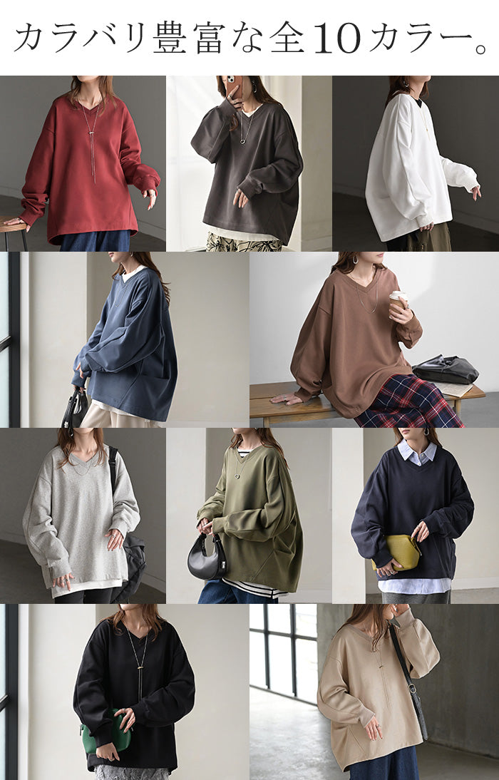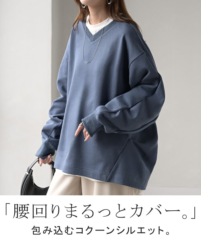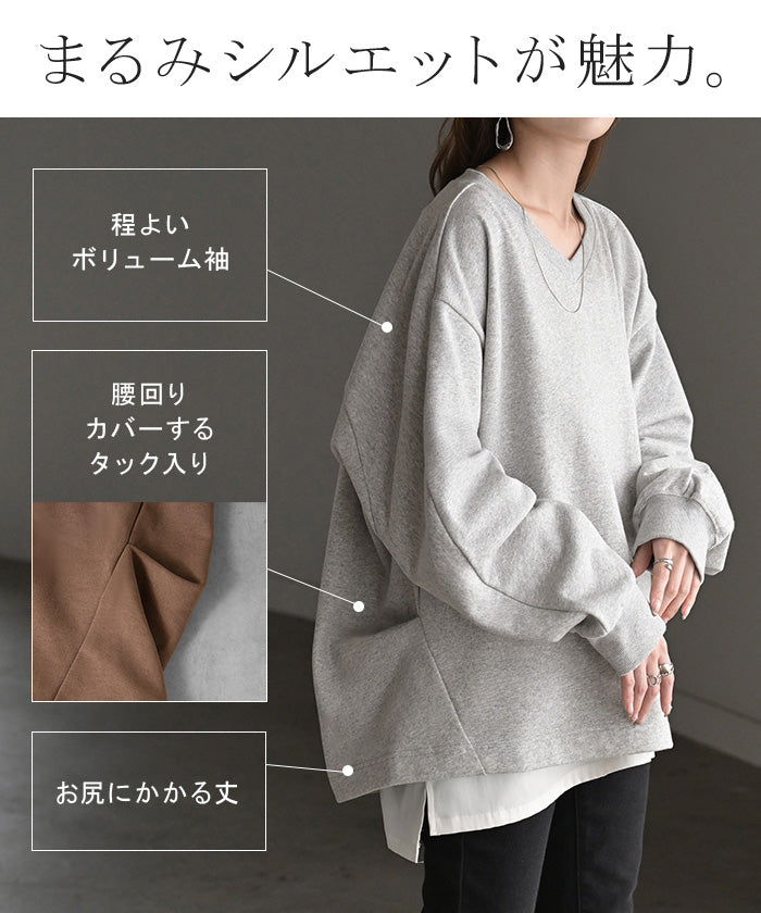2025AW新作 スウェット タック レディース トップス ロング トレーナー オーバー プルオーバー 無地 長袖 長い ドルマン Vネック ボリュームスリーブ リブ オーバーサイズ ゆったり チュニック 体型カバー 大きいサイズ カジュアル 裏パイル 黒 グレー 秋 冬 HUG.U