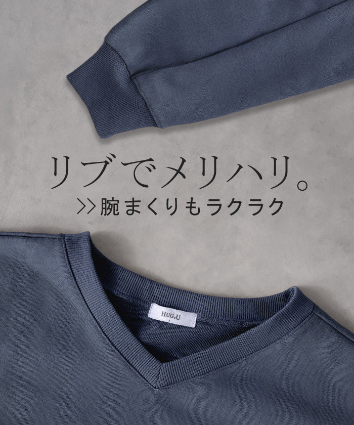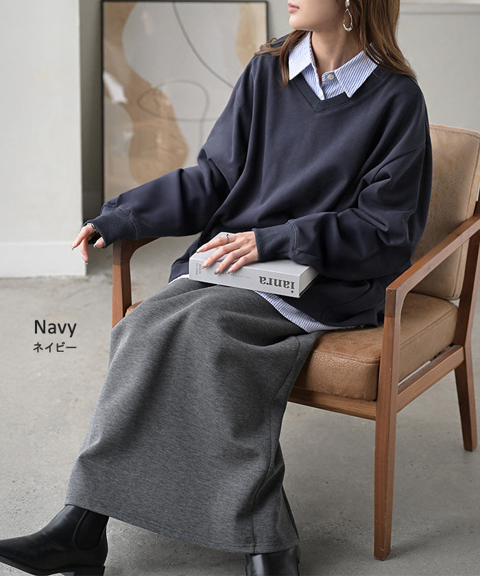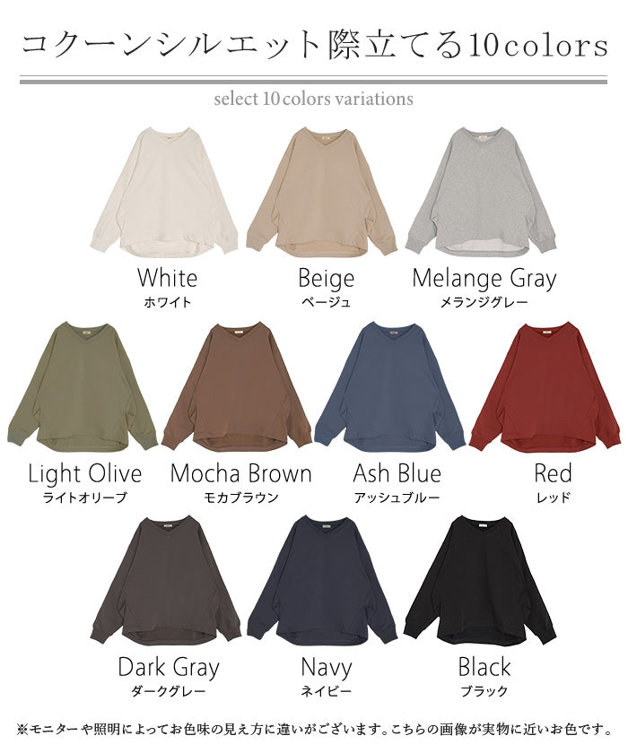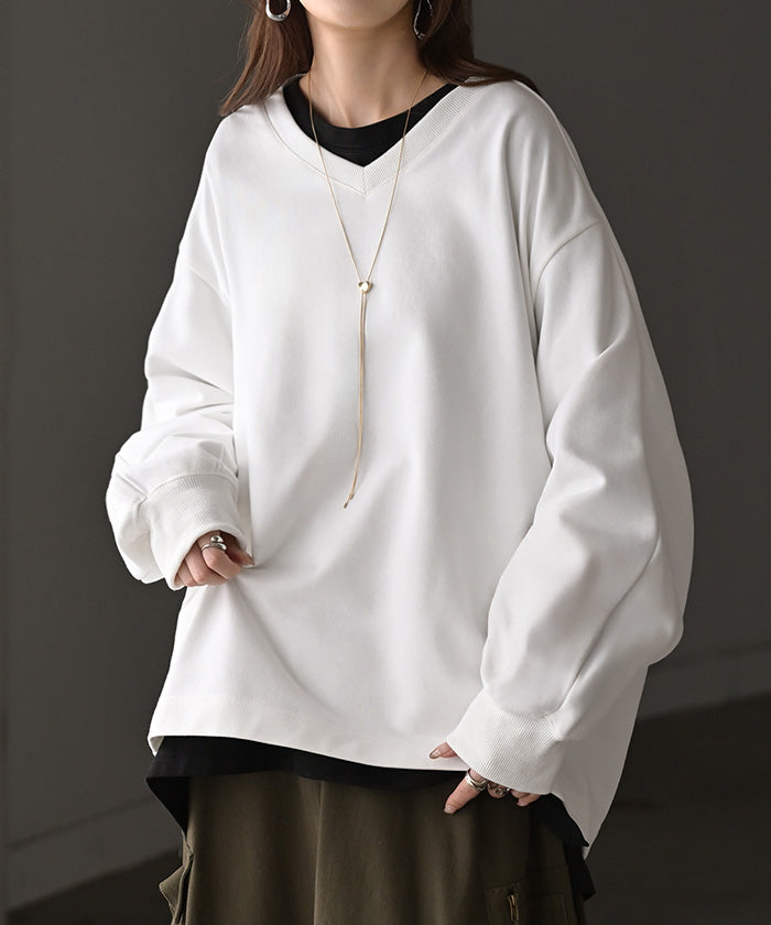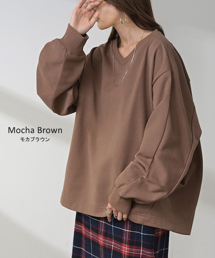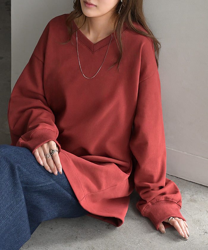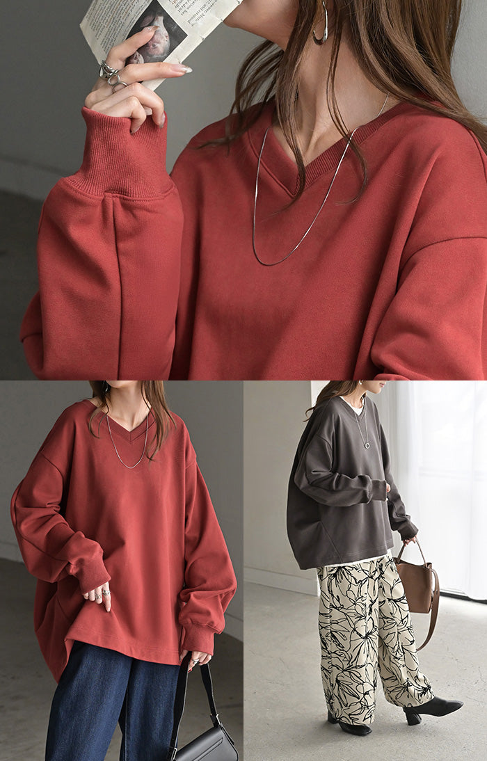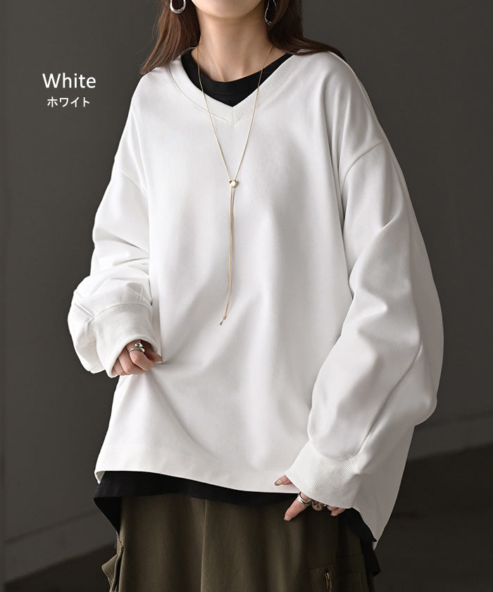 2025AW新作 スウェット タック レディース トップス ロング トレーナー オーバー プルオーバー 無地 長袖 長い ドルマン Vネック ボリュームスリーブ リブ オーバーサイズ ゆったり チュニック 体型カバー 大きいサイズ カジュアル 裏パイル 黒 グレー 秋 冬 HUG.U