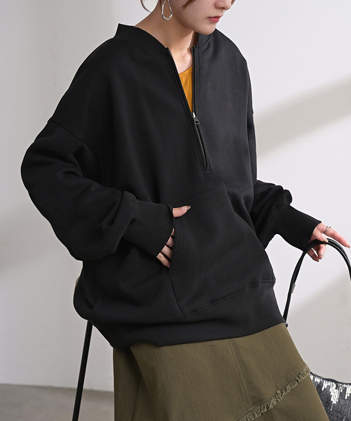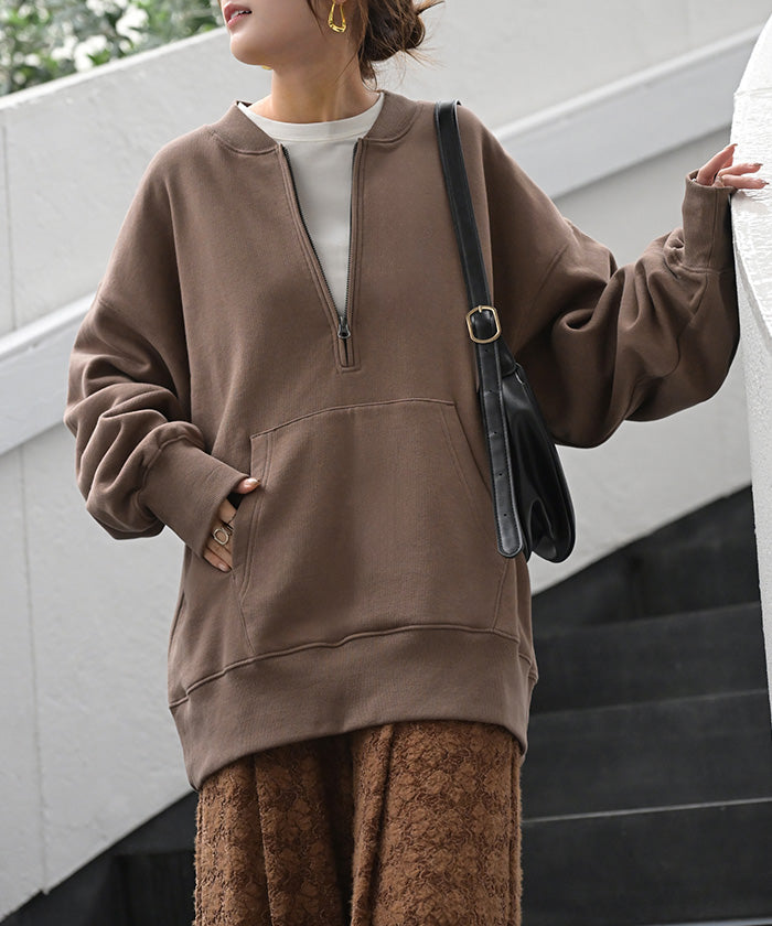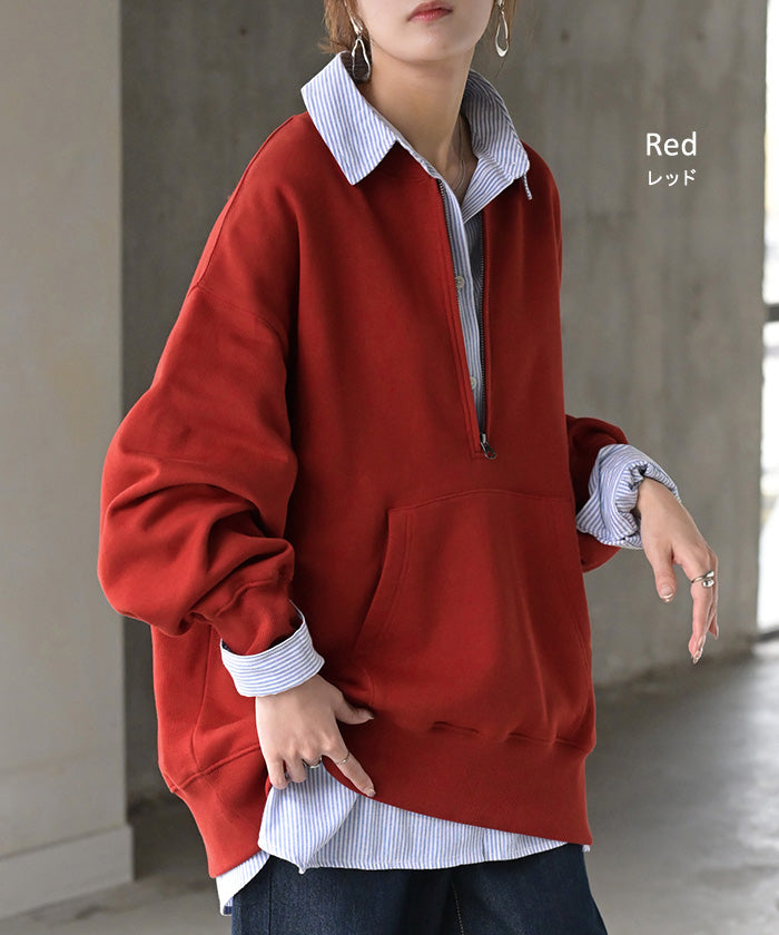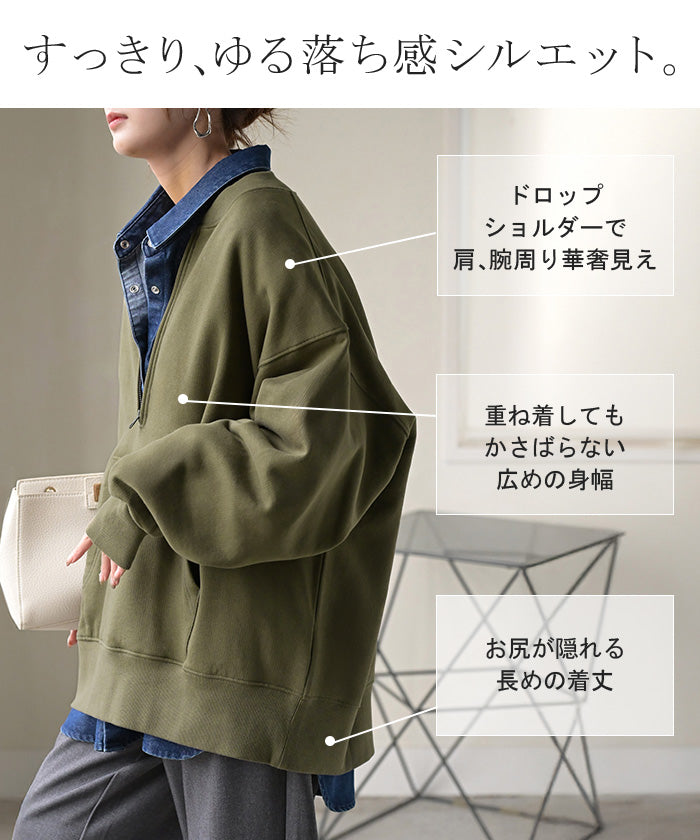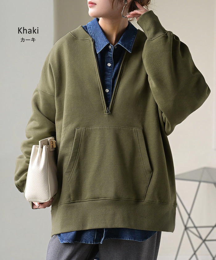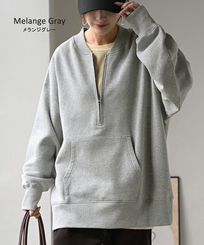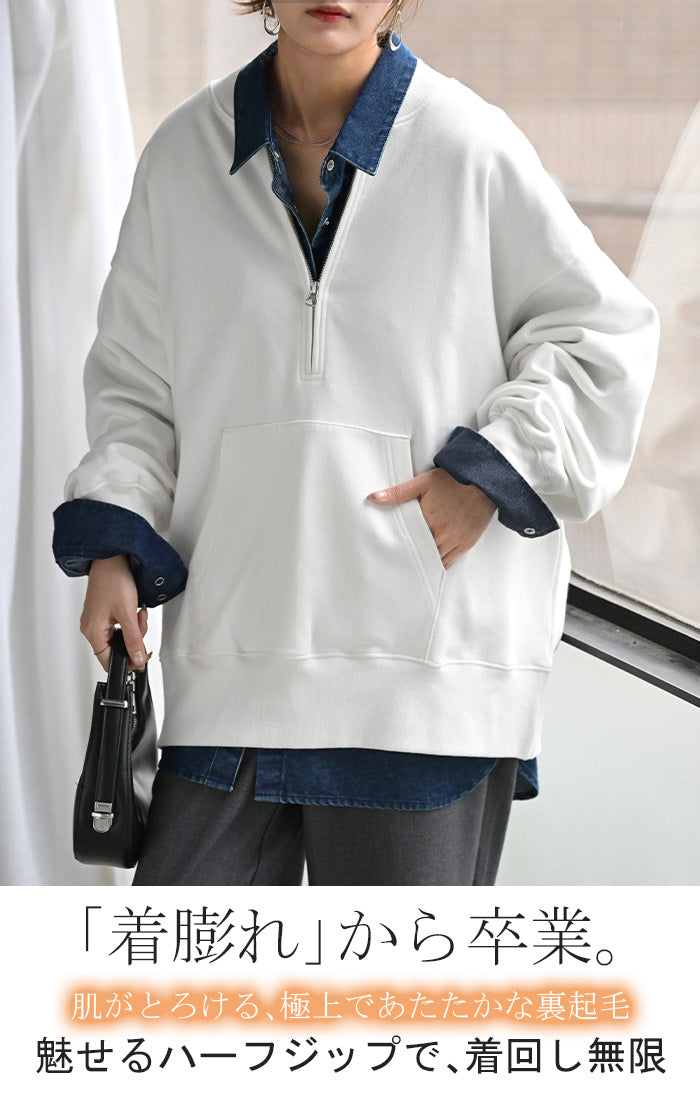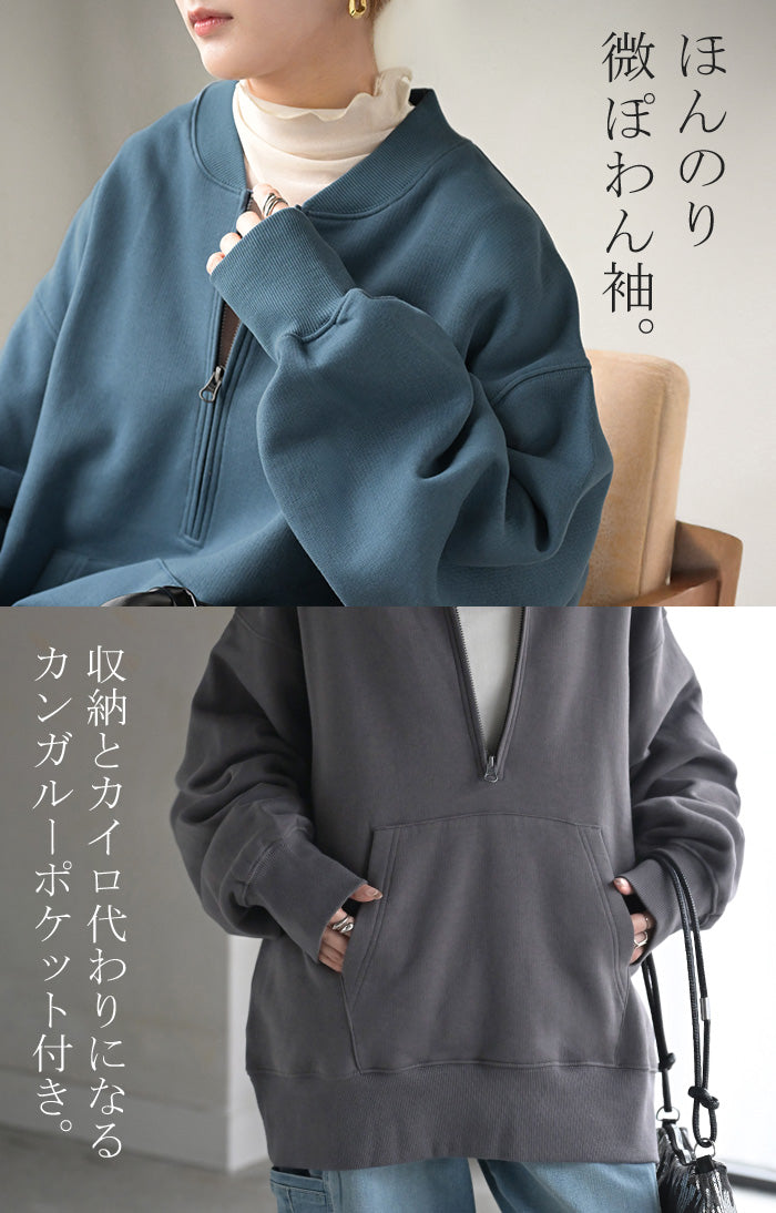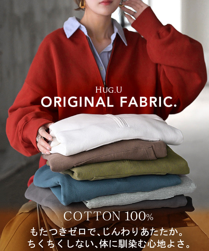 2025AW新作 スウェット 裏起毛 ハーフジップ 綿100 レディース トップス ロング トレーナー プルオーバー 抗菌 消臭 ボリュームスリーブ リブ 長袖 無地 Vネック オーバーサイズ ゆったり 体型カバー 大きいサイズ お尻が隠れる カジュアル 黒 白 秋 冬 HUG.U