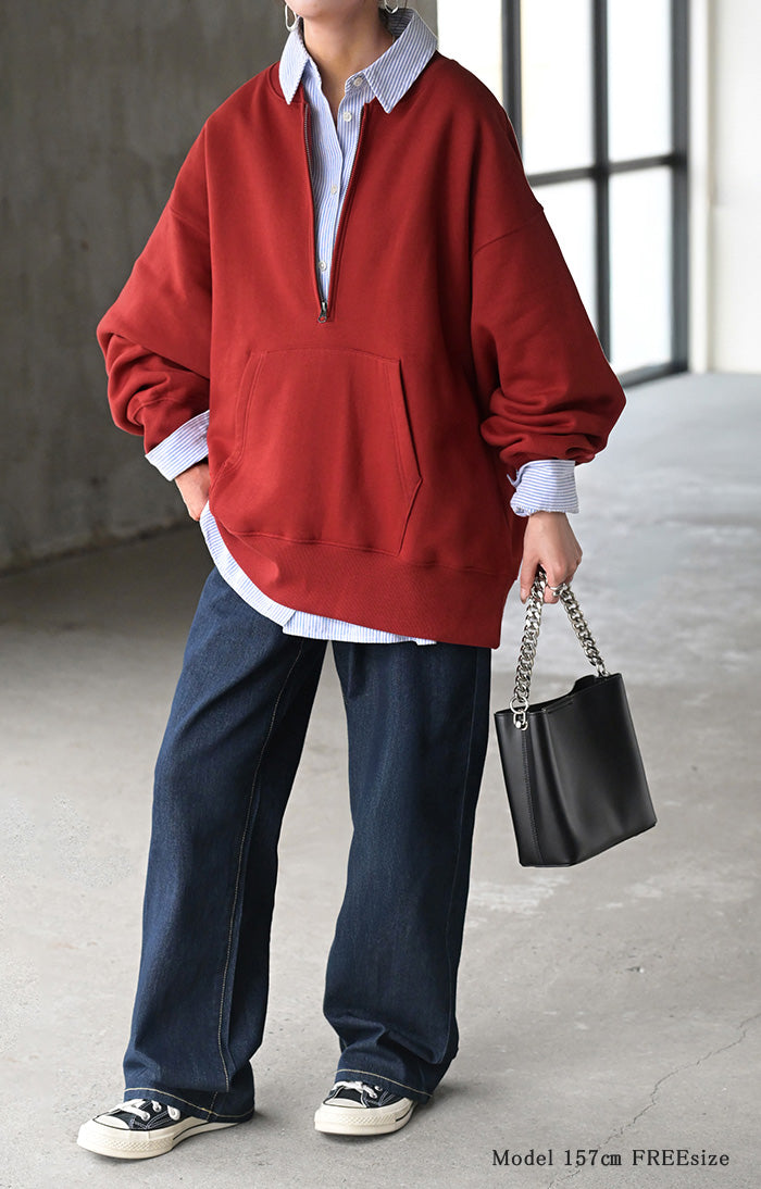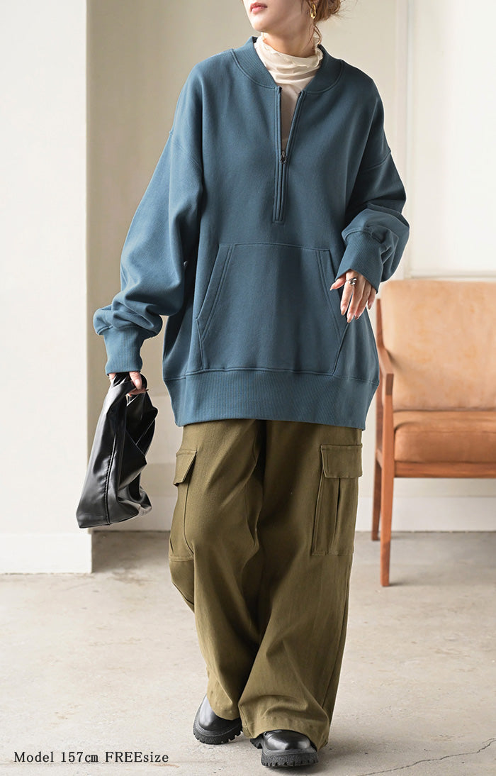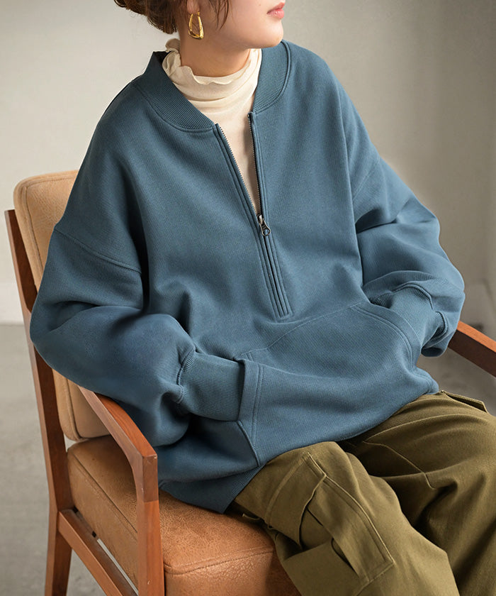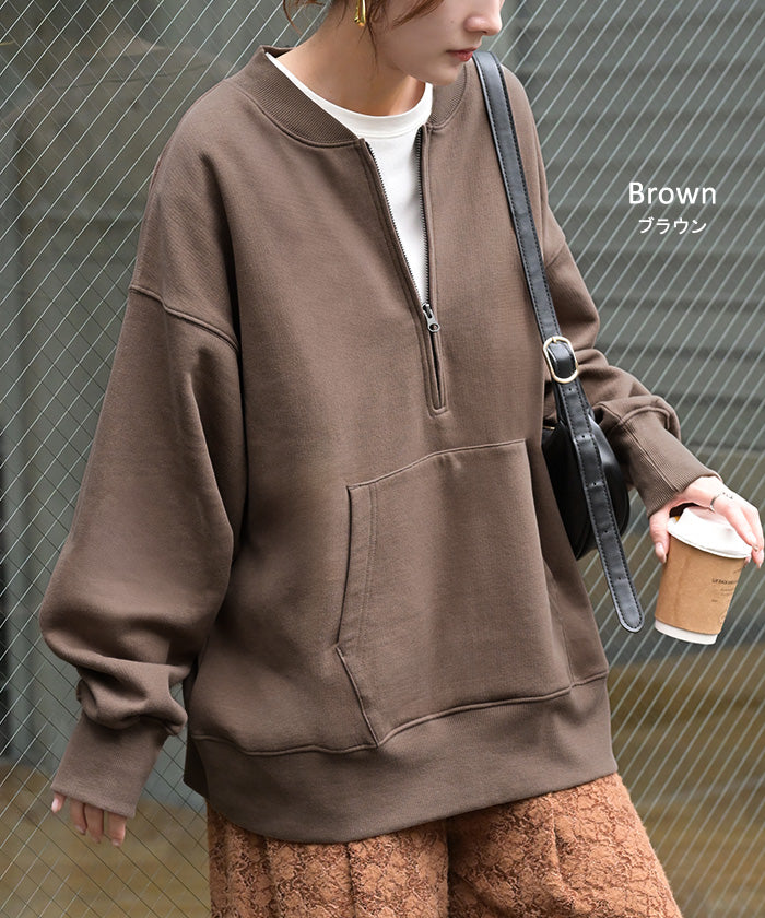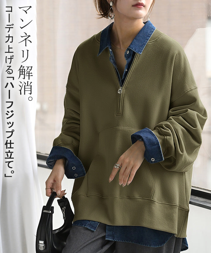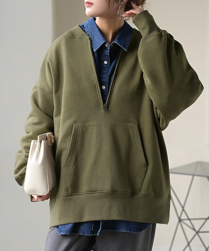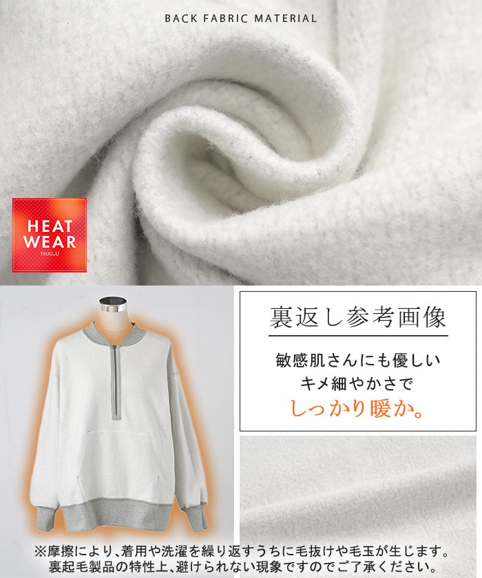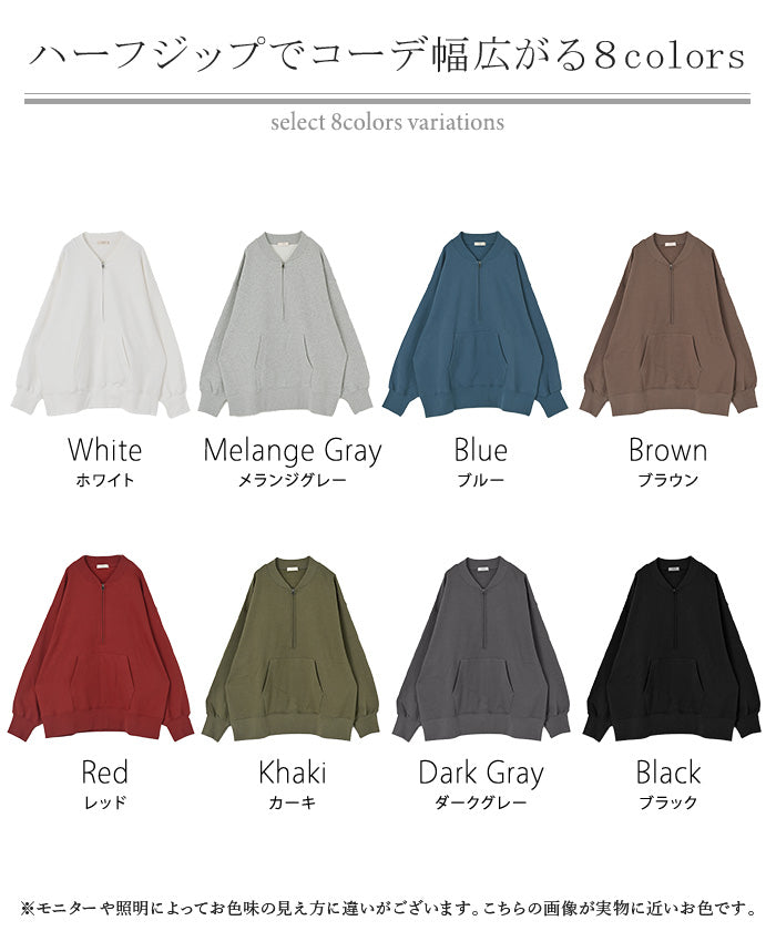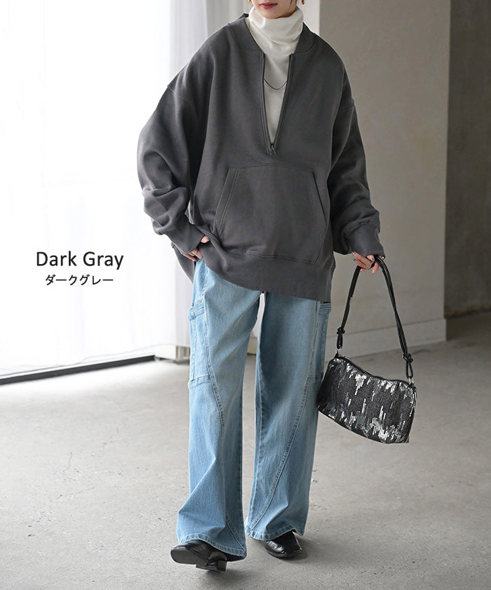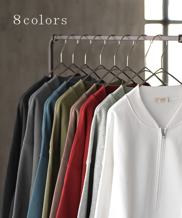2025AW新作 スウェット 裏起毛 ハーフジップ 綿100 レディース トップス ロング トレーナー プルオーバー 抗菌 消臭 ボリュームスリーブ リブ 長袖 無地 Vネック オーバーサイズ ゆったり 体型カバー 大きいサイズ お尻が隠れる カジュアル 黒 白 秋 冬 HUG.U