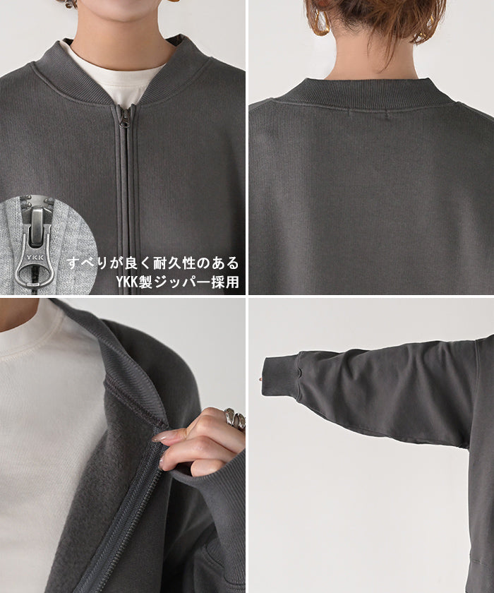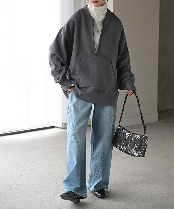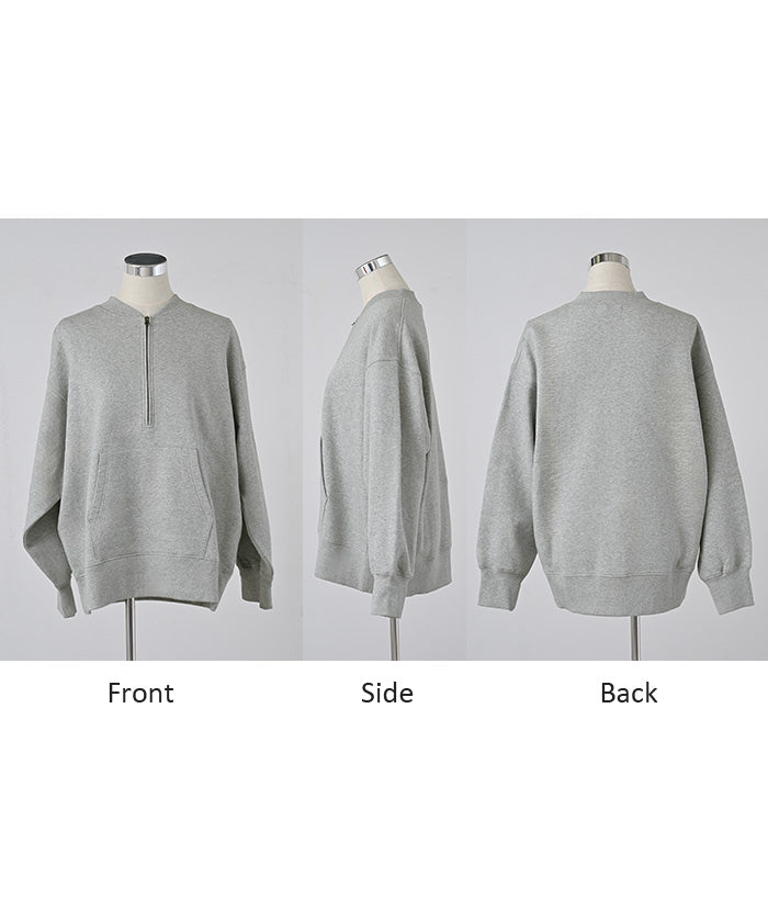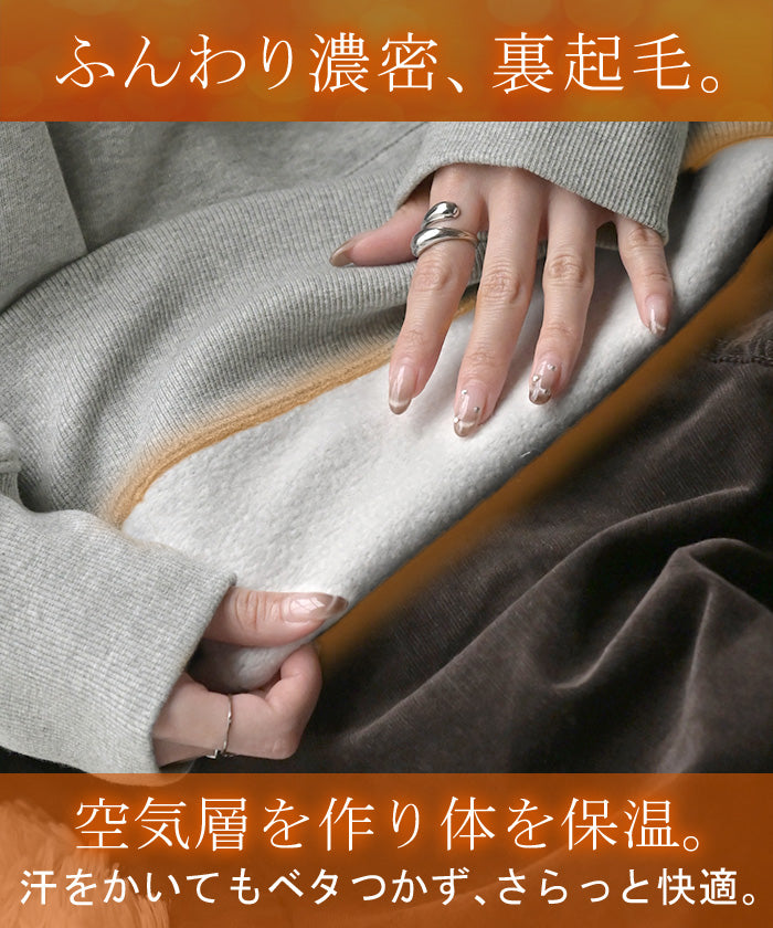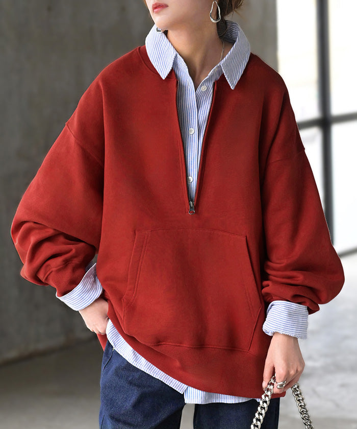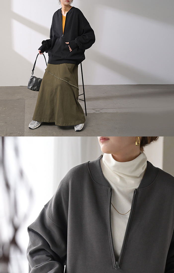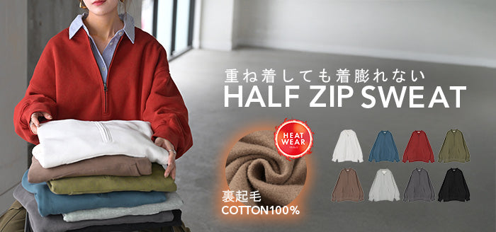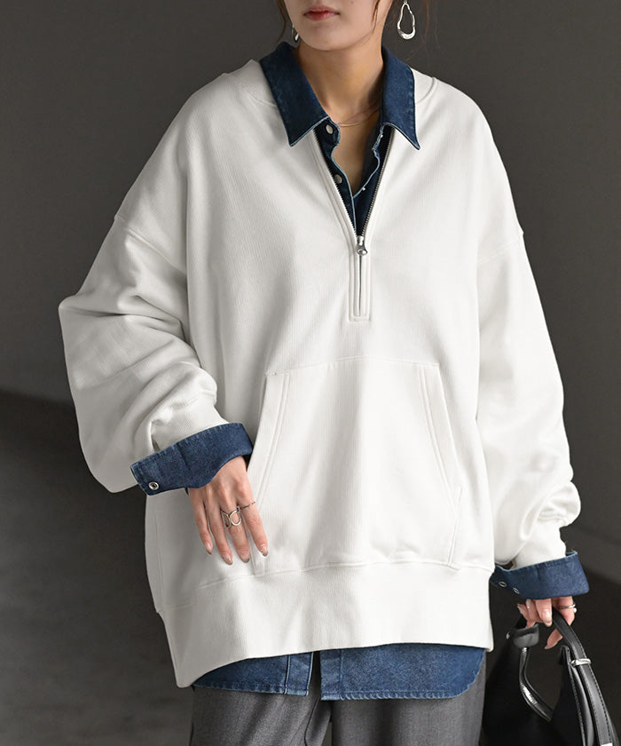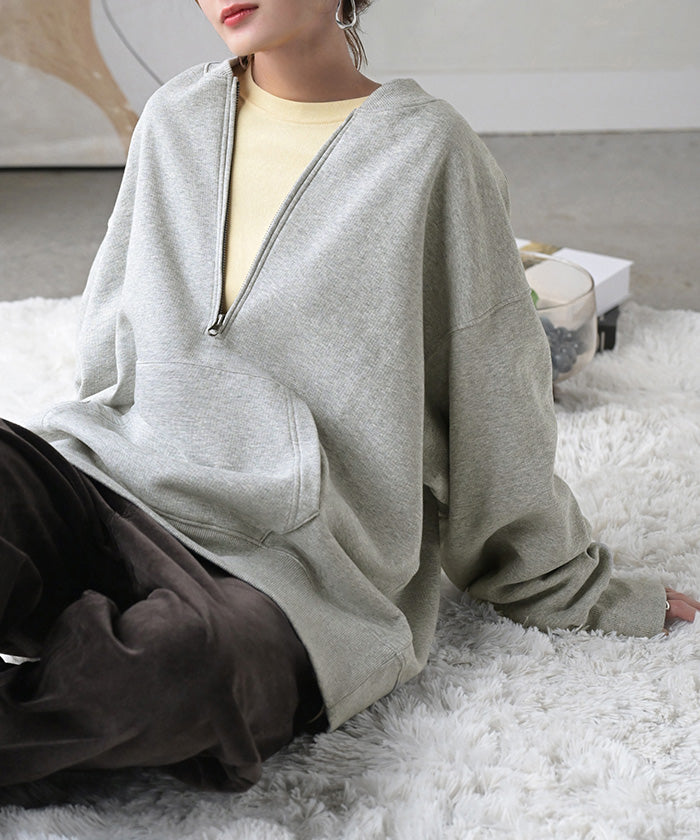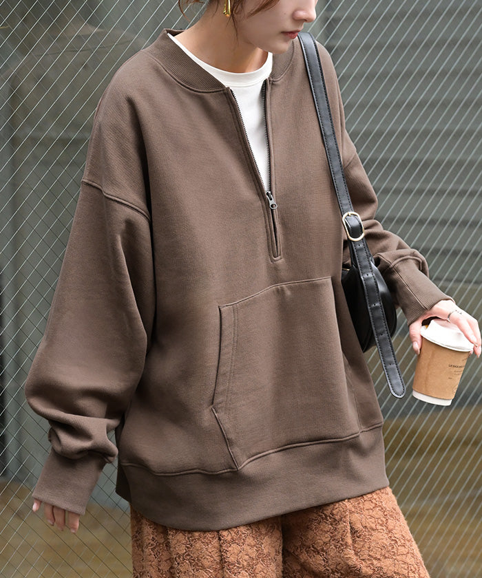 2025AW新作 スウェット 裏起毛 ハーフジップ 綿100 レディース トップス ロング トレーナー プルオーバー 抗菌 消臭 ボリュームスリーブ リブ 長袖 無地 Vネック オーバーサイズ ゆったり 体型カバー 大きいサイズ お尻が隠れる カジュアル 黒 白 秋 冬 HUG.U