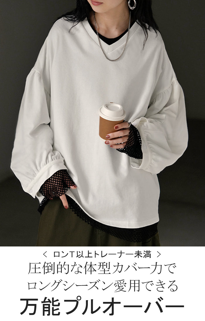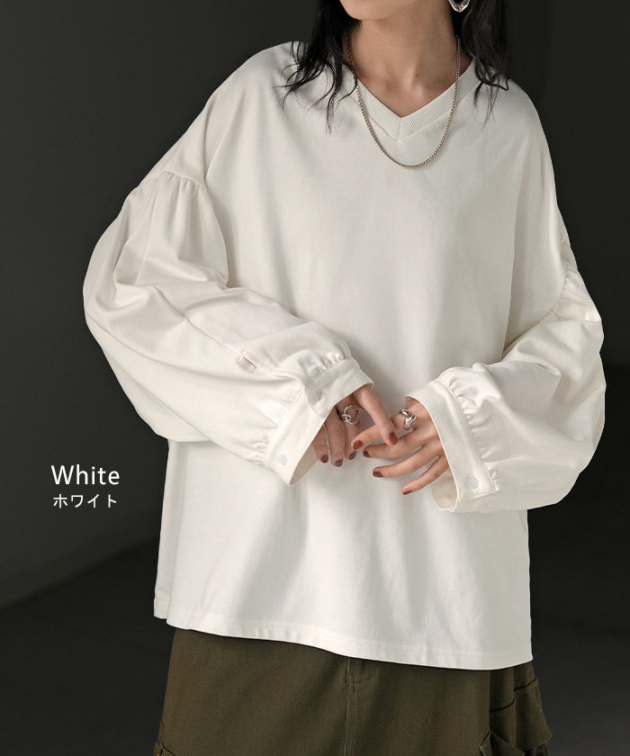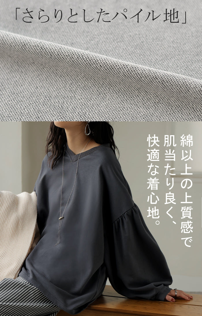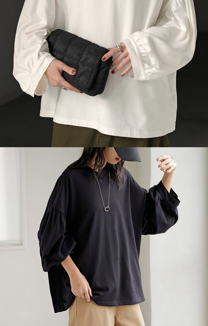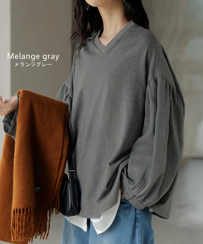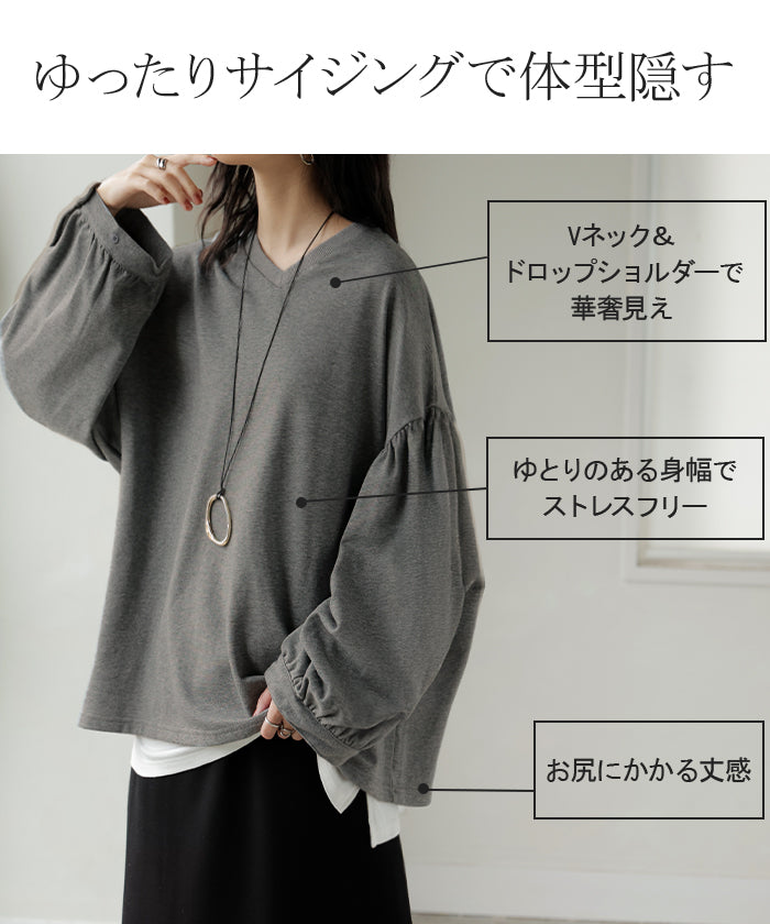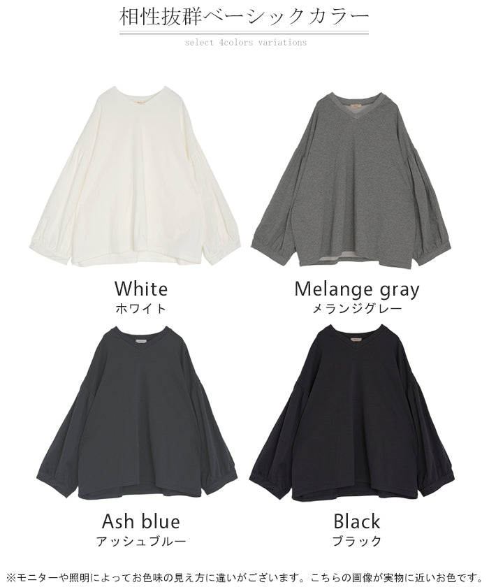 2025AW新作 ロンT Vネック ぽわん袖 レディース トップス ロング Tシャツ カットソー ティーシャツ カフス 綿 長袖 長い トレーナー ボリュームスリーブ リブ ビッグ プラスサイズ ゆったり 体型カバー 大きいサイズ おしゃれ オフィスカジュアル 白 黒 秋 冬 HUG.U