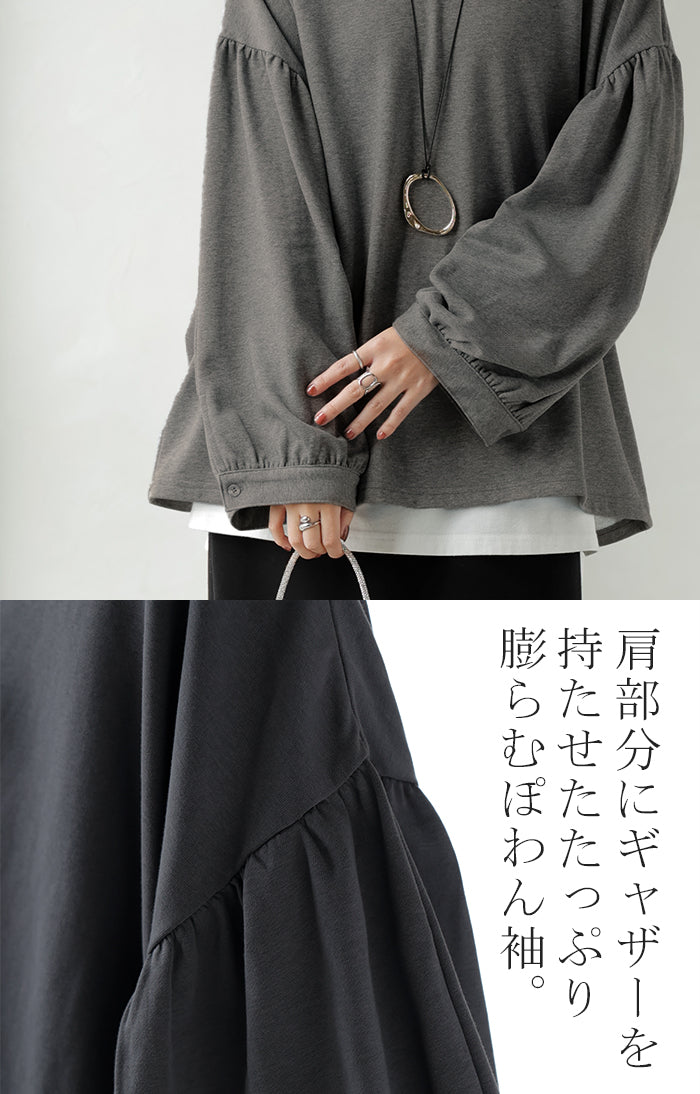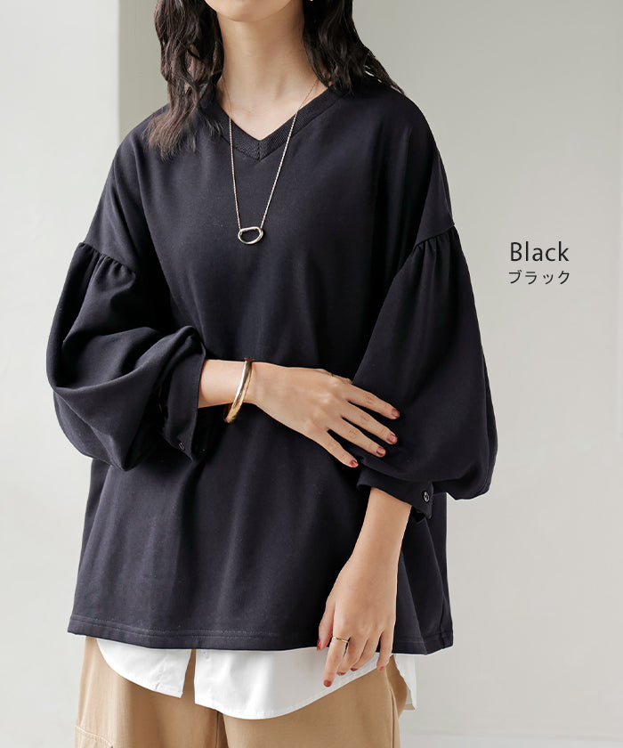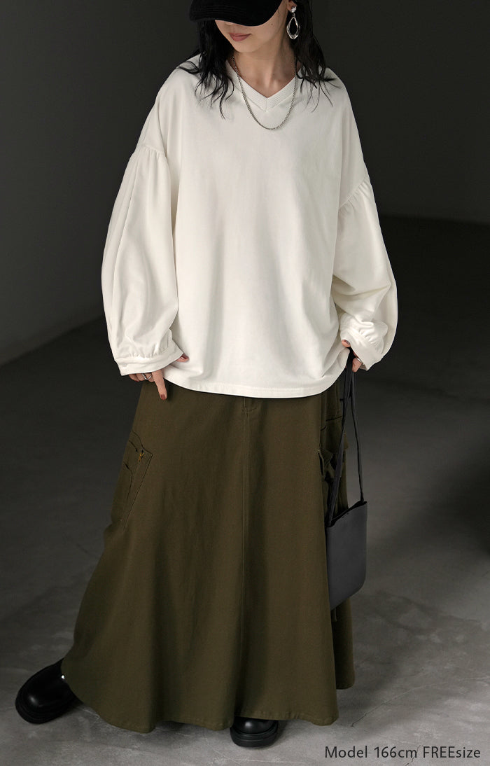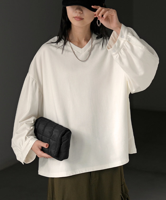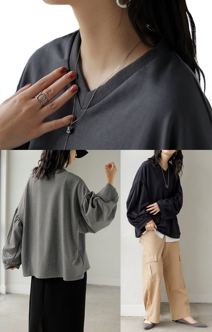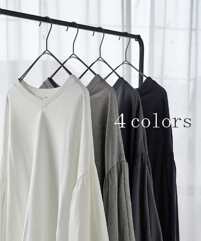 2025AW新作 ロンT Vネック ぽわん袖 レディース トップス ロング Tシャツ カットソー ティーシャツ カフス 綿 長袖 長い トレーナー ボリュームスリーブ リブ ビッグ プラスサイズ ゆったり 体型カバー 大きいサイズ おしゃれ オフィスカジュアル 白 黒 秋 冬 HUG.U