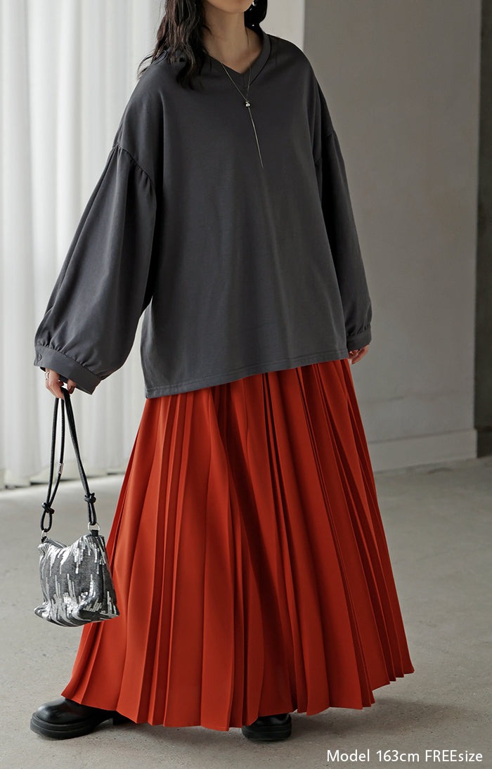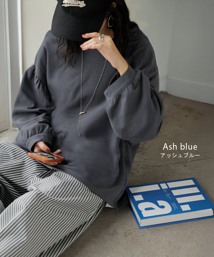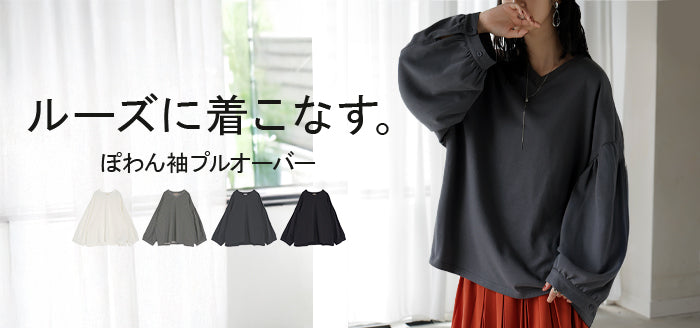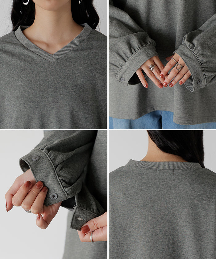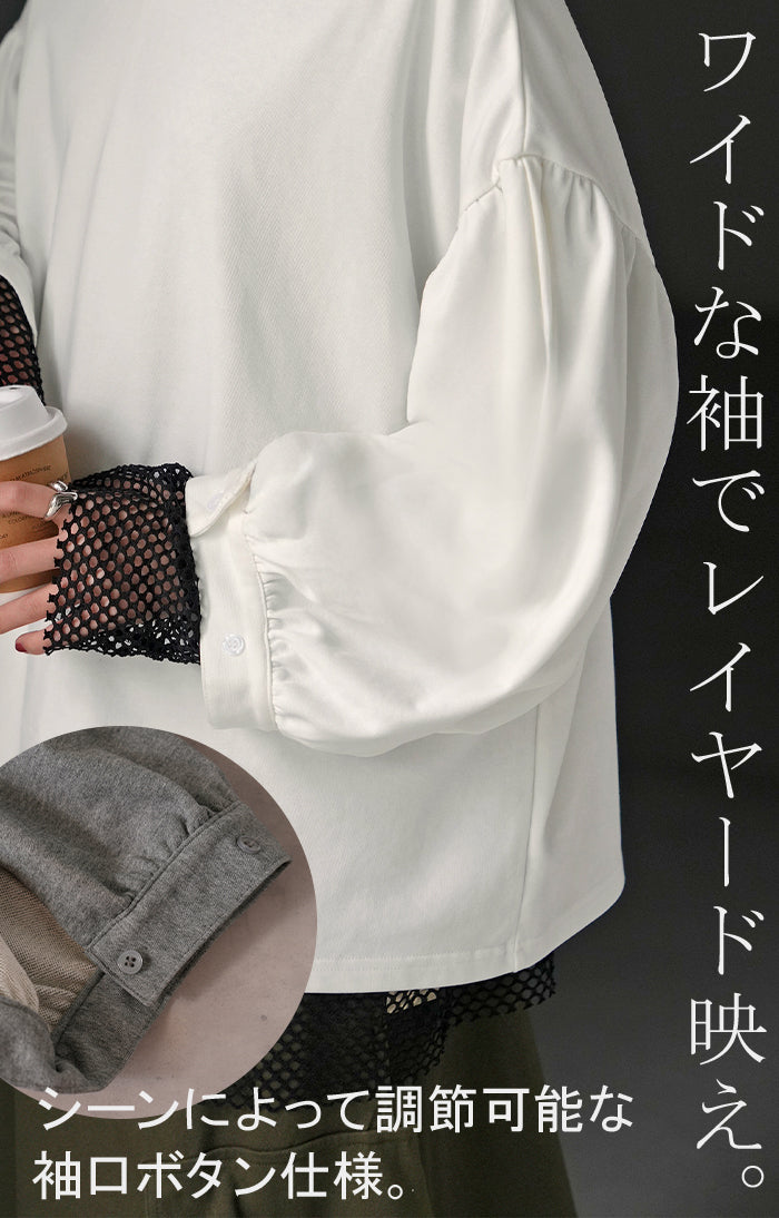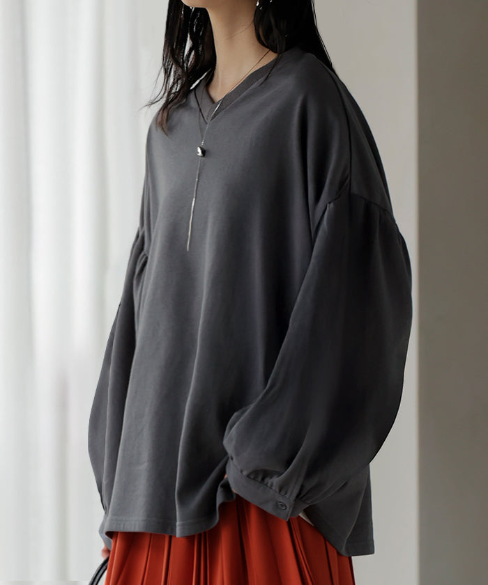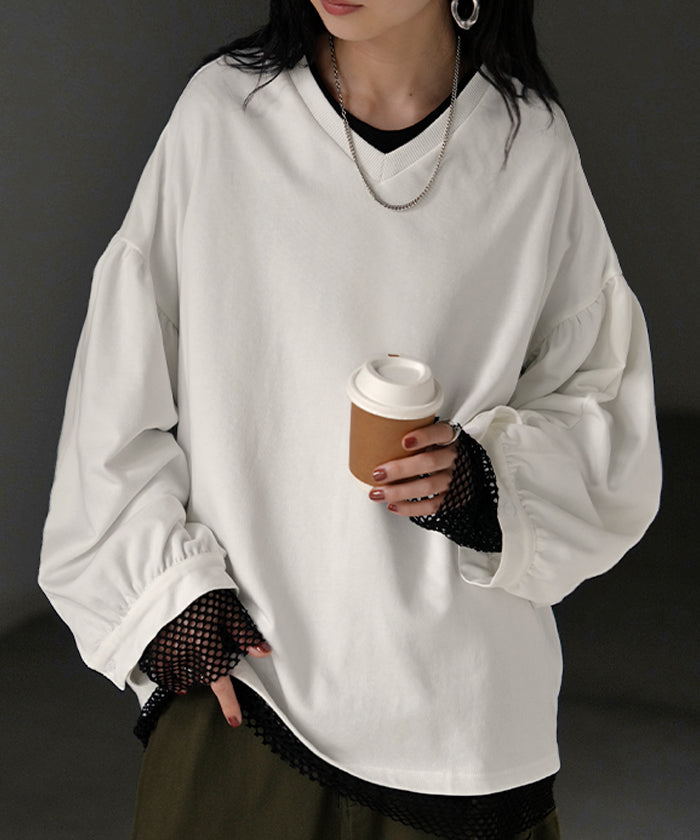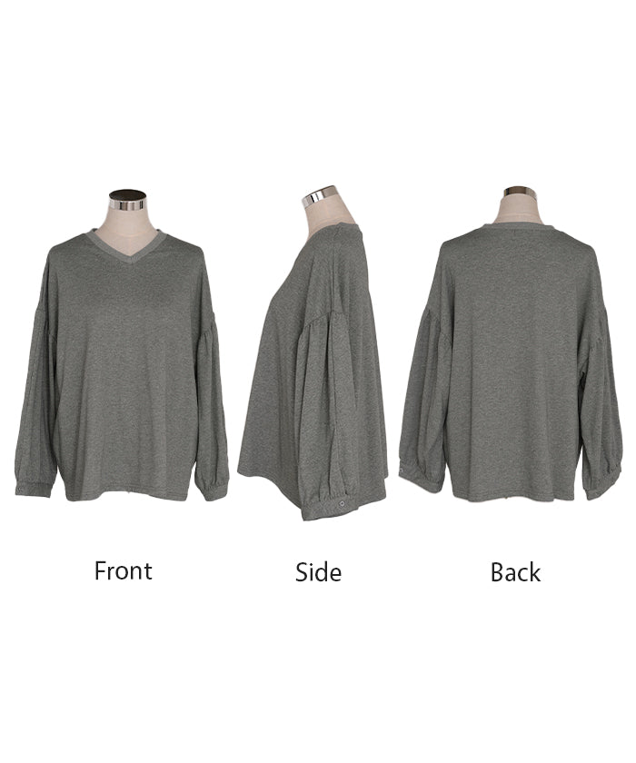2025AW新作 ロンT Vネック ぽわん袖 レディース トップス ロング Tシャツ カットソー ティーシャツ カフス 綿 長袖 長い トレーナー ボリュームスリーブ リブ ビッグ プラスサイズ ゆったり 体型カバー 大きいサイズ おしゃれ オフィスカジュアル 白 黒 秋 冬 HUG.U