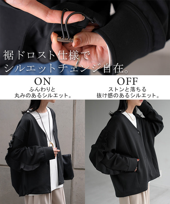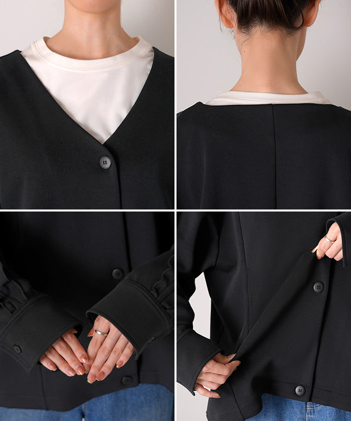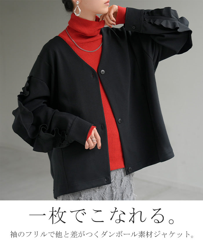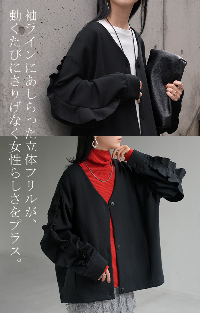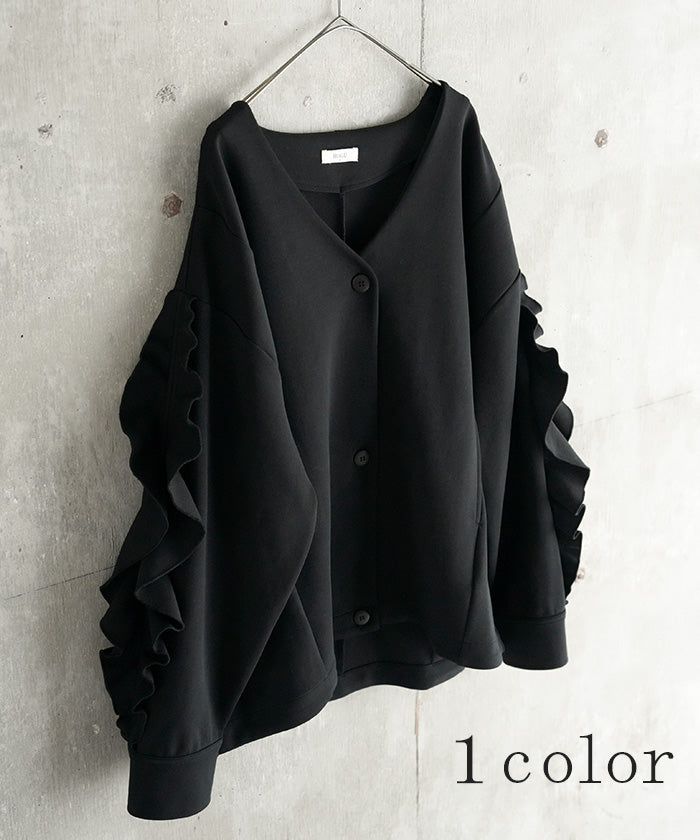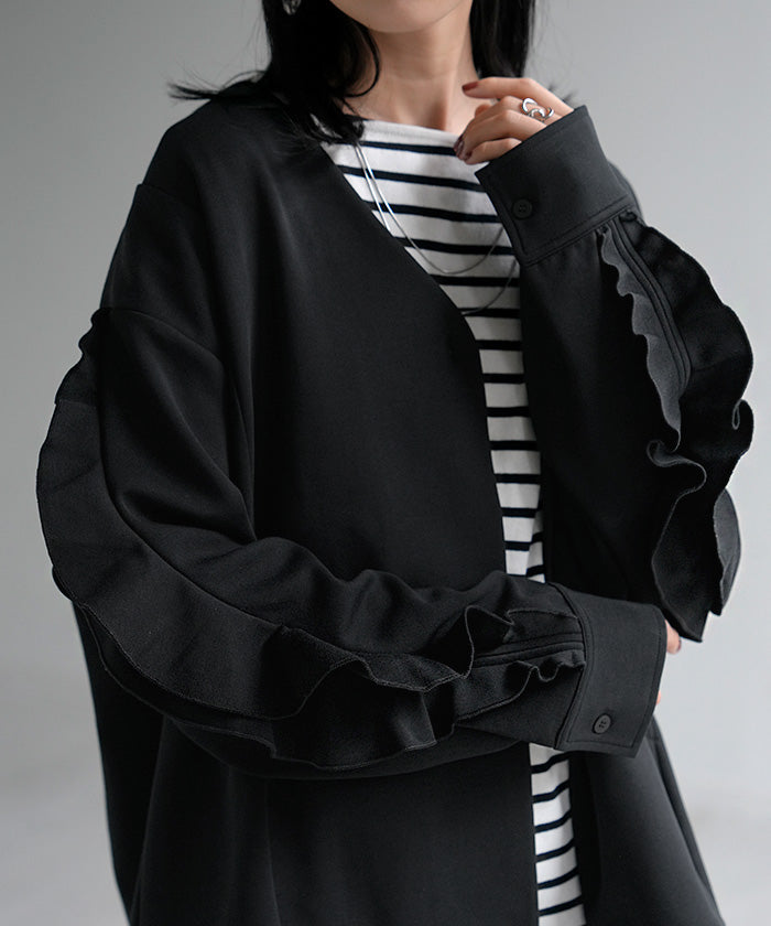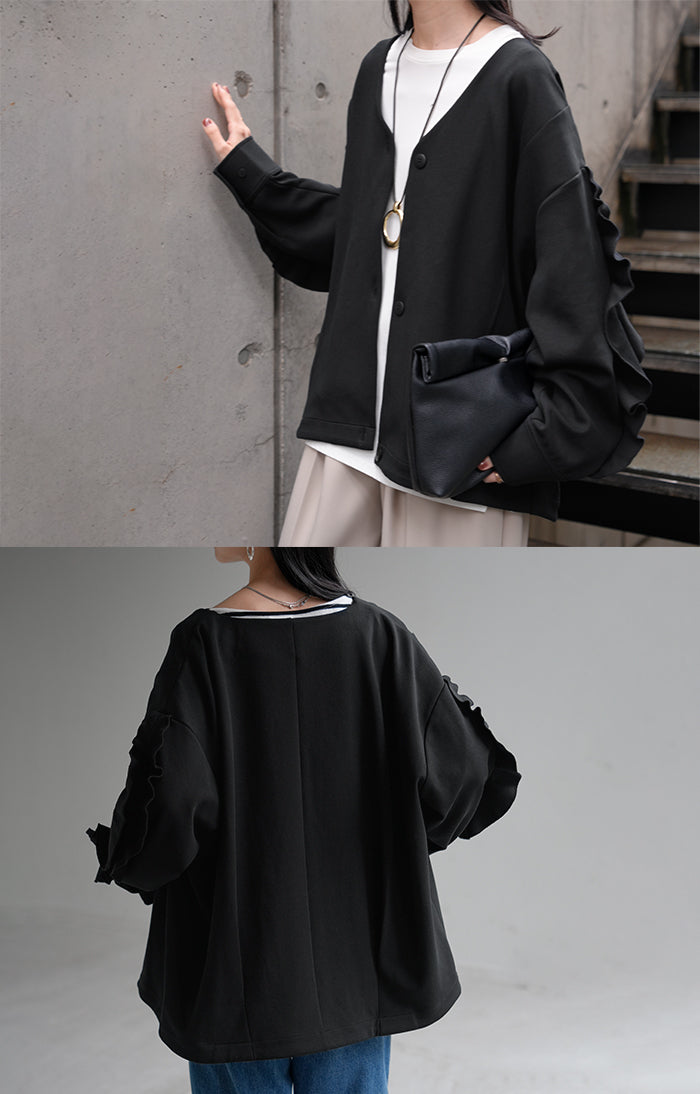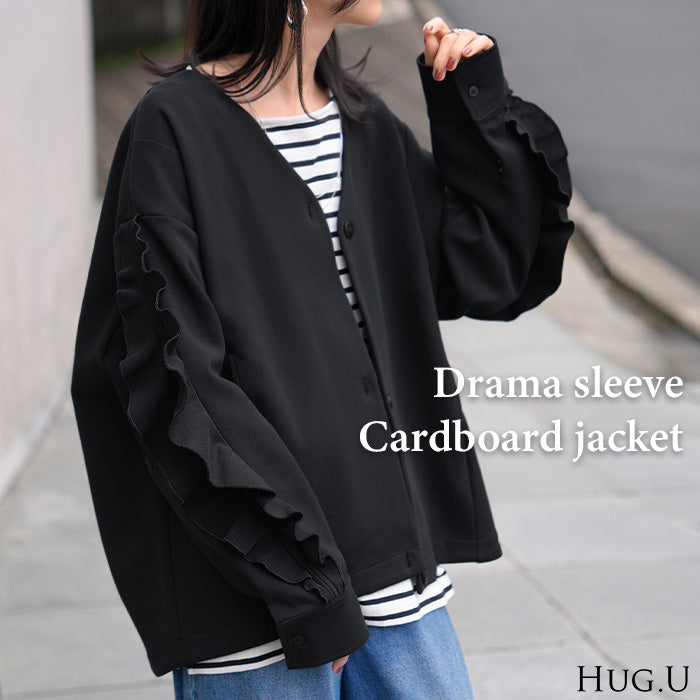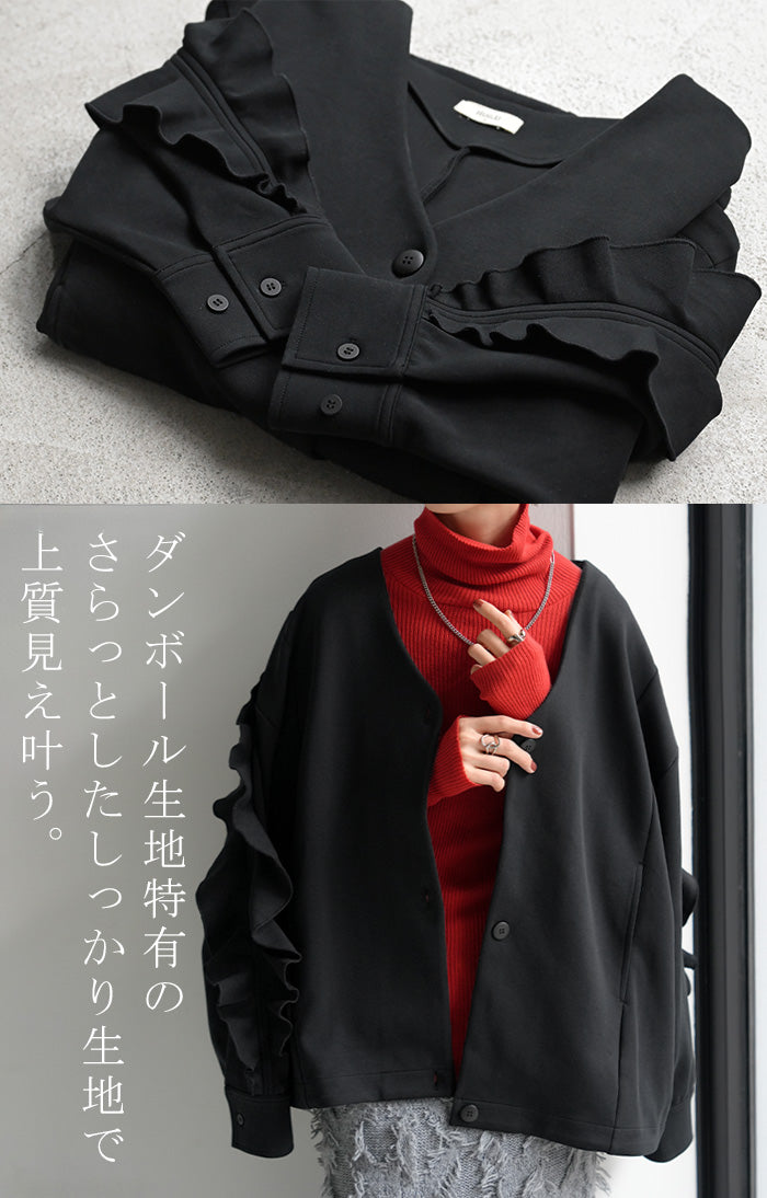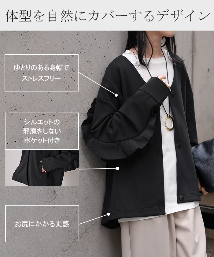 2025AW新作 アウター ジャケット フリル ■11月中旬入荷 ダンボール レディース ロング Vネック ノーカラー 無地 長袖 羽織 ライトアウター チュニック オーバーサイズ シワになりにくい 軽い 暖かい 大きいサイズ 体型カバー きれいめ オフィスカジュアル 黒 ブラック 秋 冬 HUG.U